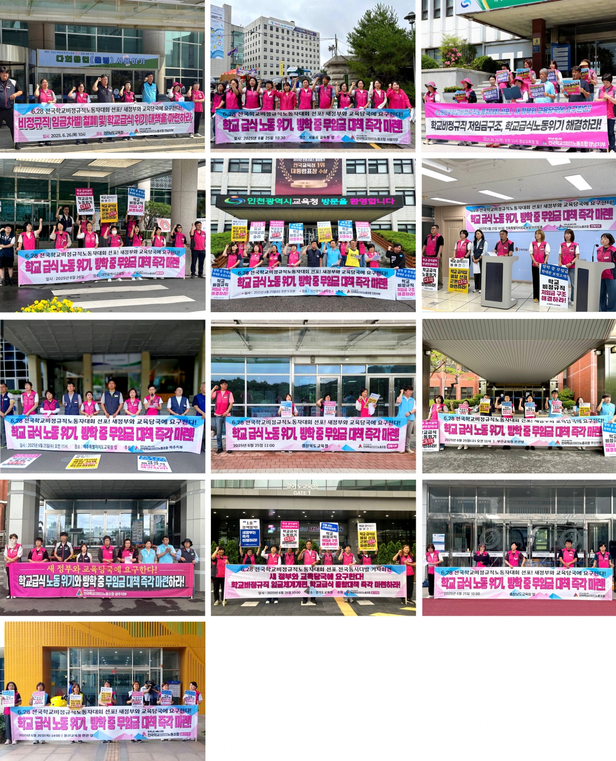 전국학교비정규직노동조합은 전국 시도교육청 앞에서 계속되는 폐암 산재 등 학교 급식 노동 위기와 방학 중 무임금 등 저임금 구조 문제를 요구하기 위해 6.28 전국학교비정규직노동자대회 선포 기자회견을 진행했다.