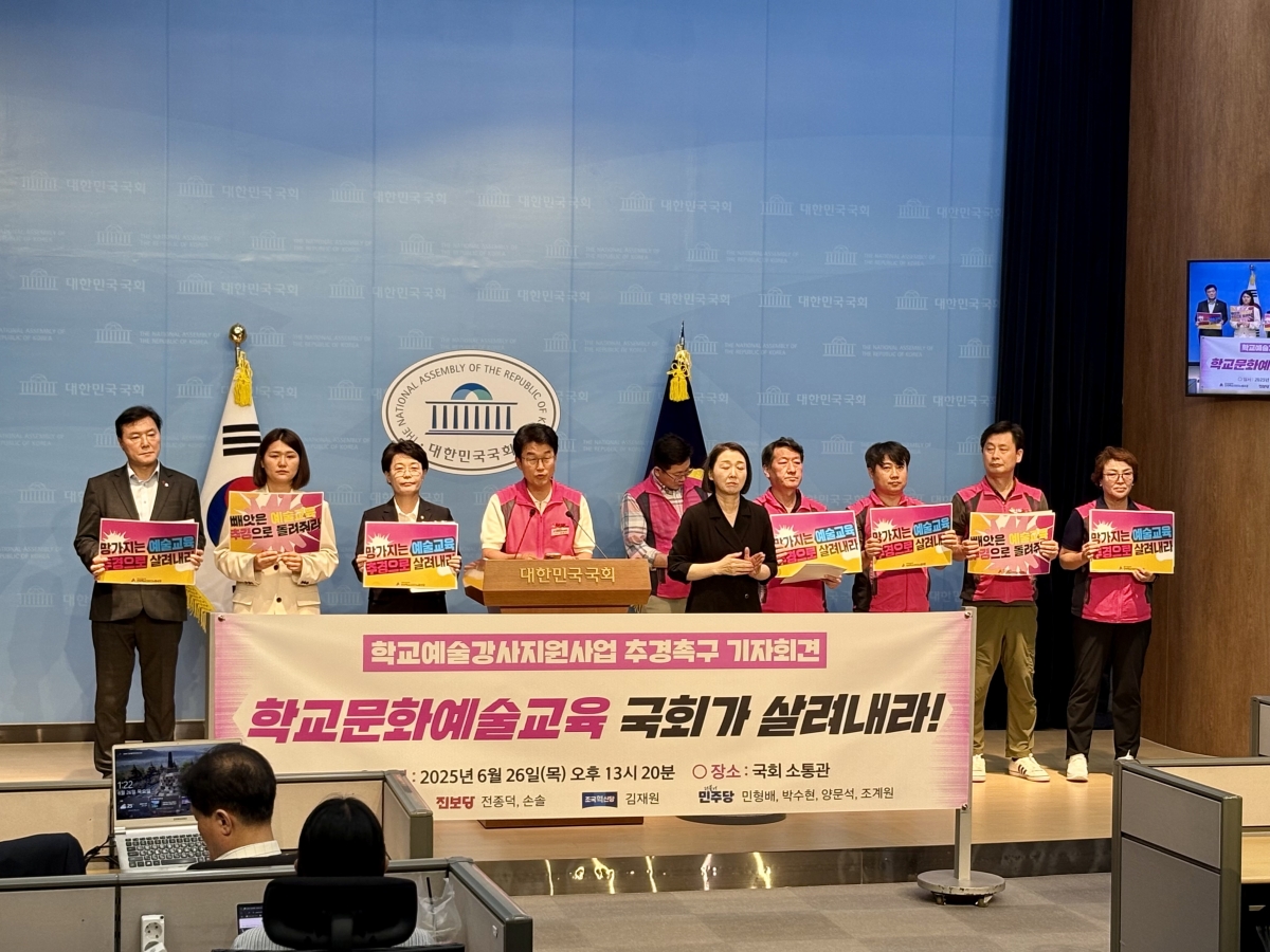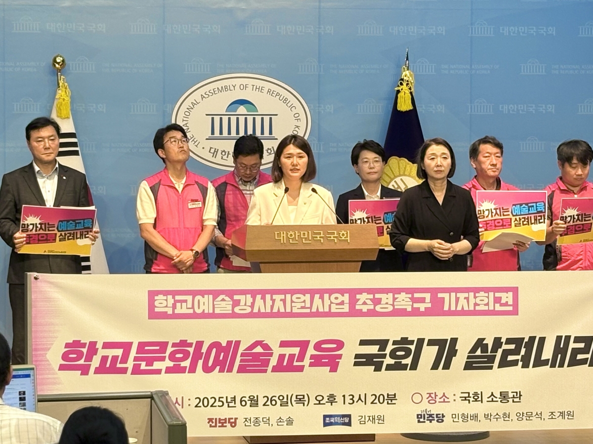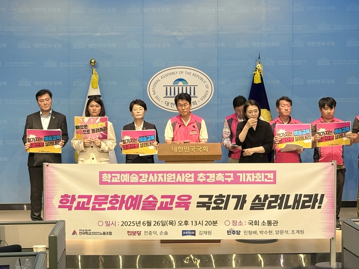 전국학교비정규직노동조합은 어제(26) 국회 소통관에서 학교예술강사지원사업 추경 촉구 기자회견을 더불어민주당 조계원, 민형배, 박수현, 양문석 국회의원과 조국혁신당 김재원 국회의원, 진보당 전종덕, 손솔 국회의원과 공동으로 주최했다.
