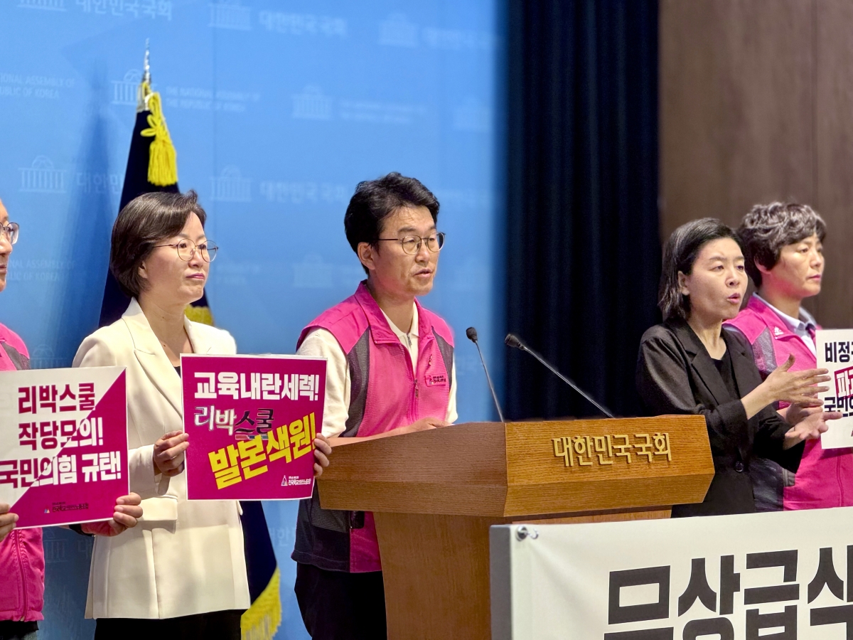 전국학교비정규직노동조합은 지난 1일 국회 소통관과 전국 국민의힘 지방당사 앞에서 무상급식과 노조 파괴를 음모한 리박스쿨과 국민의힘을 규탄하는 동시다발 기자회견을 진행했다.