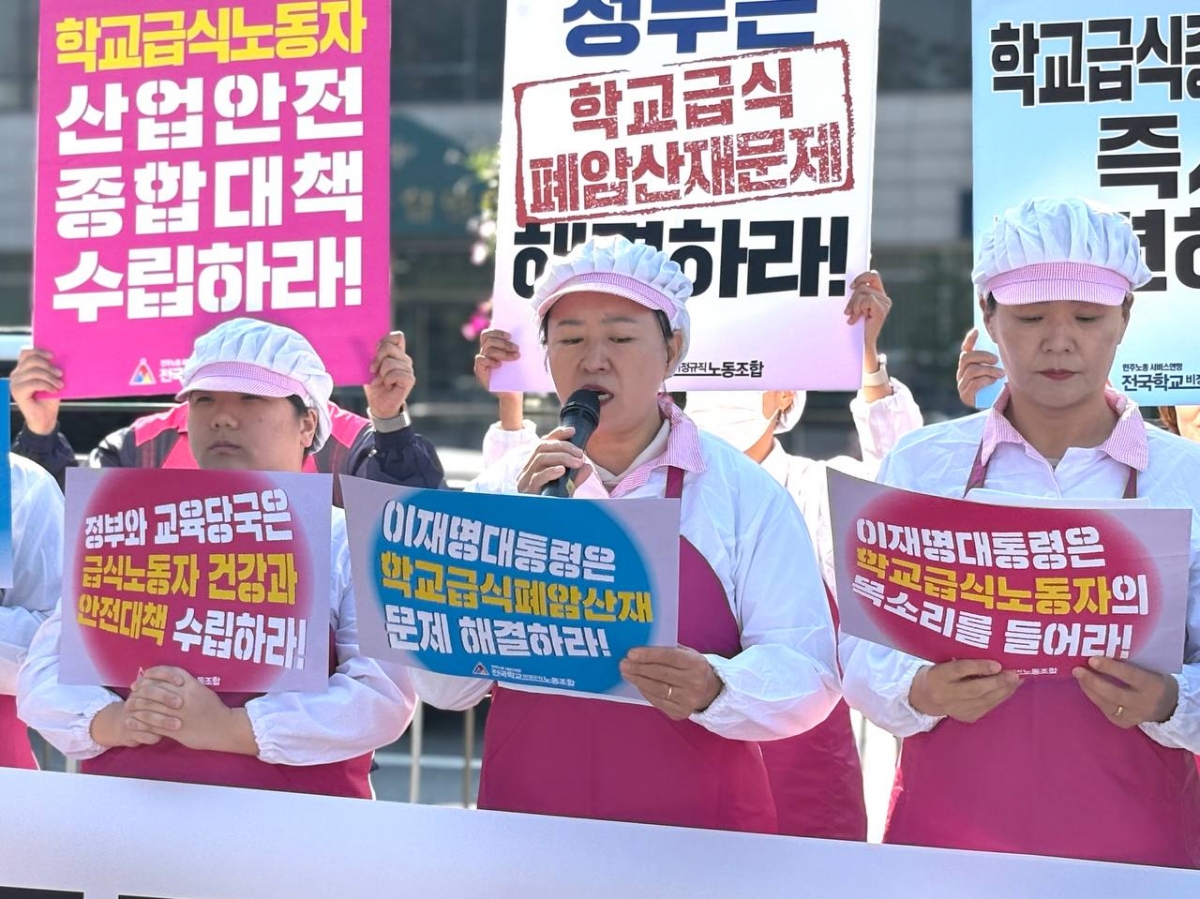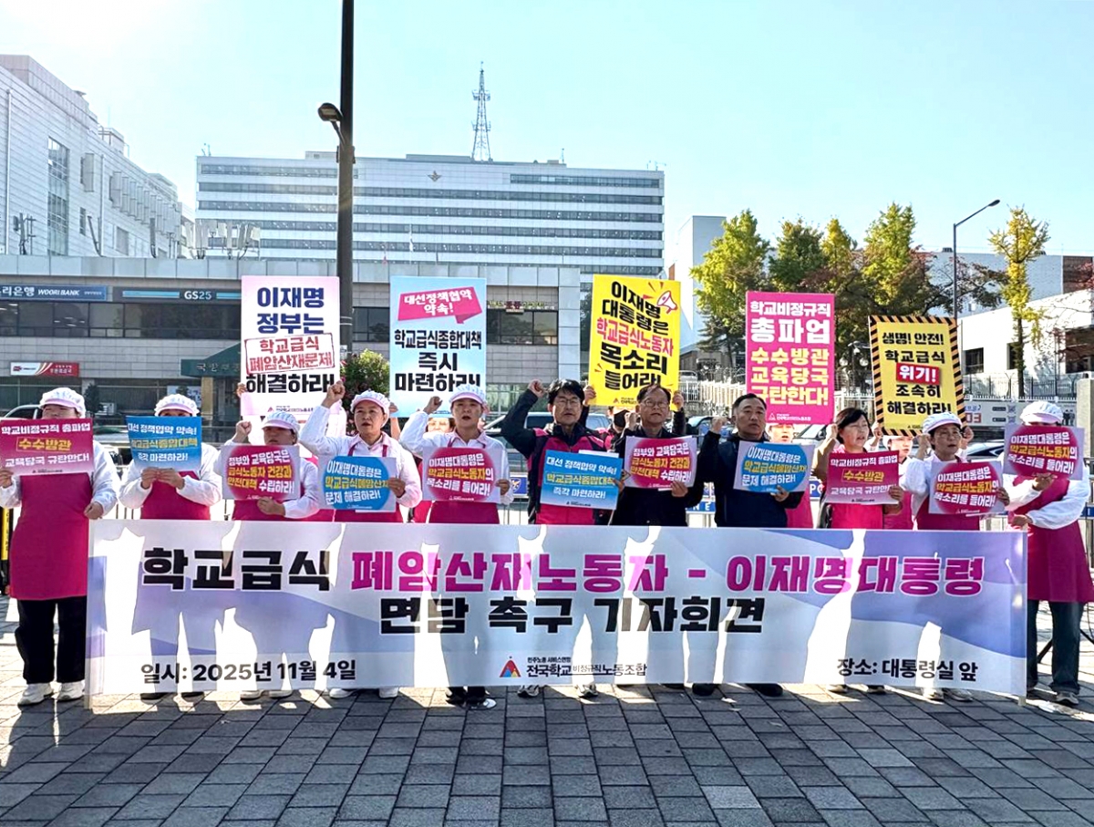 전국학교비정규직노동조합은 오늘(4) 용산 대통령실 앞에서 학교급식 폐암산재 노동자 이재명 대통령 면담 촉구 기자회견을 진행했다.