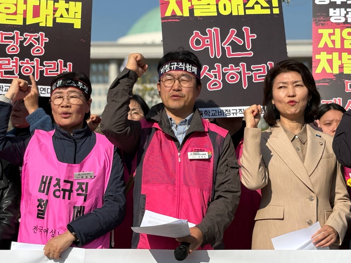 전국학교비정규직노동조합(학비노조) 등 전국학교비정규직연대회의(연대회의)는 오늘(11) 국회 앞 무기한 농성투쟁에 돌입하며 총파업 선포 기자회견을 진행했다.