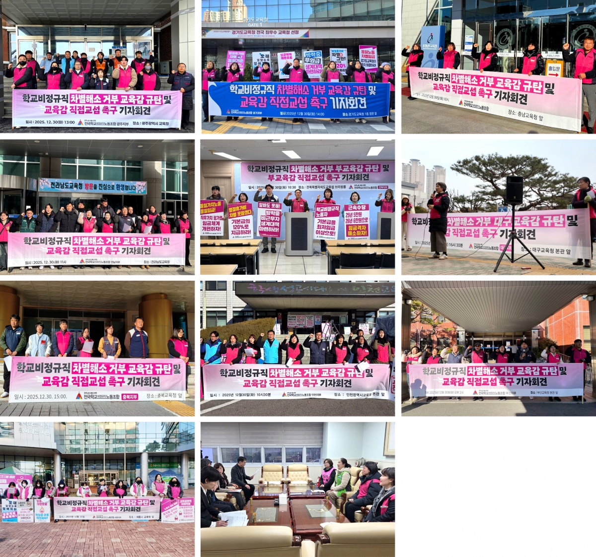 전국학교비정규직노동조합은 오늘 각 시도교육청 앞에서 교육감 직접교섭을 요구하는 기자회견과 교육감 면담을 진행하였다