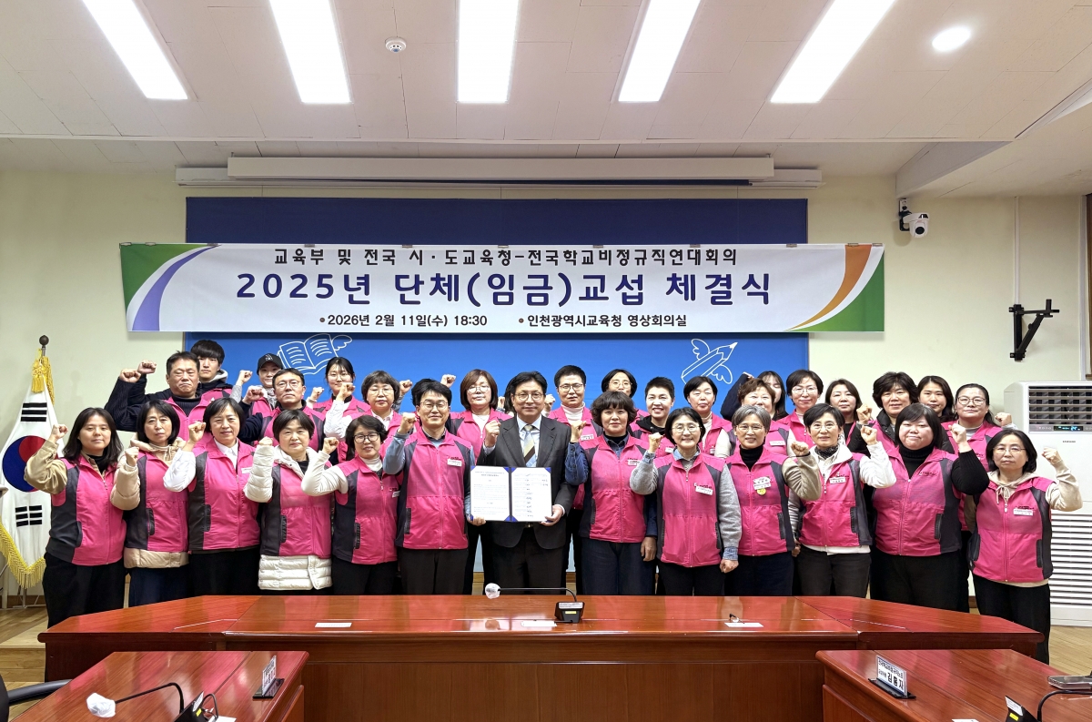 전국학교비정규직노동조합 등 학교비정규직연대회의는 오늘(11일) 인천시교육청에서 2025년 집단임금교섭 체결식을 진행하였다. 조합원들과 함께한 투쟁과 지난한 교섭의 결과로 지난 8일 잠정합의 후 조합원 찬반투표를 통해 99%의 압도적 찬성으로 승인되었다.