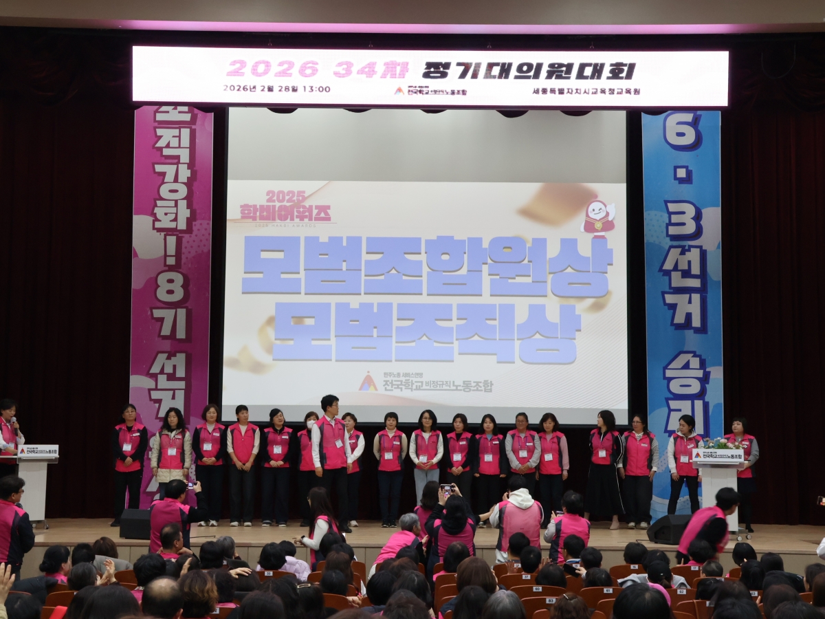 전국학교비정규직노동조합(학교비정규직노조)은 지난 2월 28일 세종 교육청 교육원 대강당에서 34차 정기대의원대회를 열고 2025년 사업평가와 2026년 사업계획 등을 논의하고 결정하였다. 이번 대의원대회에는 양경수 민주노총 위원장, 김광창 서비스연맹 위원장, 정혜경 진보당 국회의원 등이 함께 자리해 주었다. 김재연 진보당 상임대표는 영상으로 인사말을 전했다.