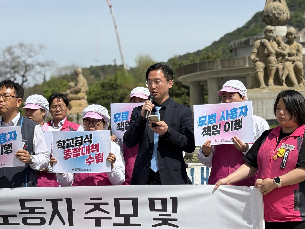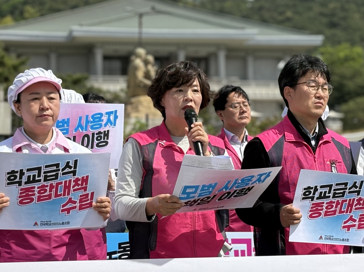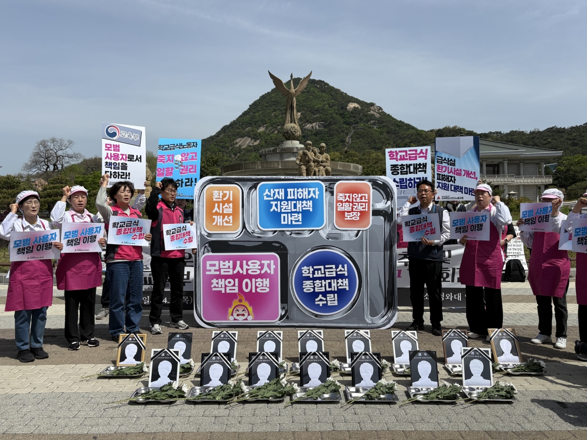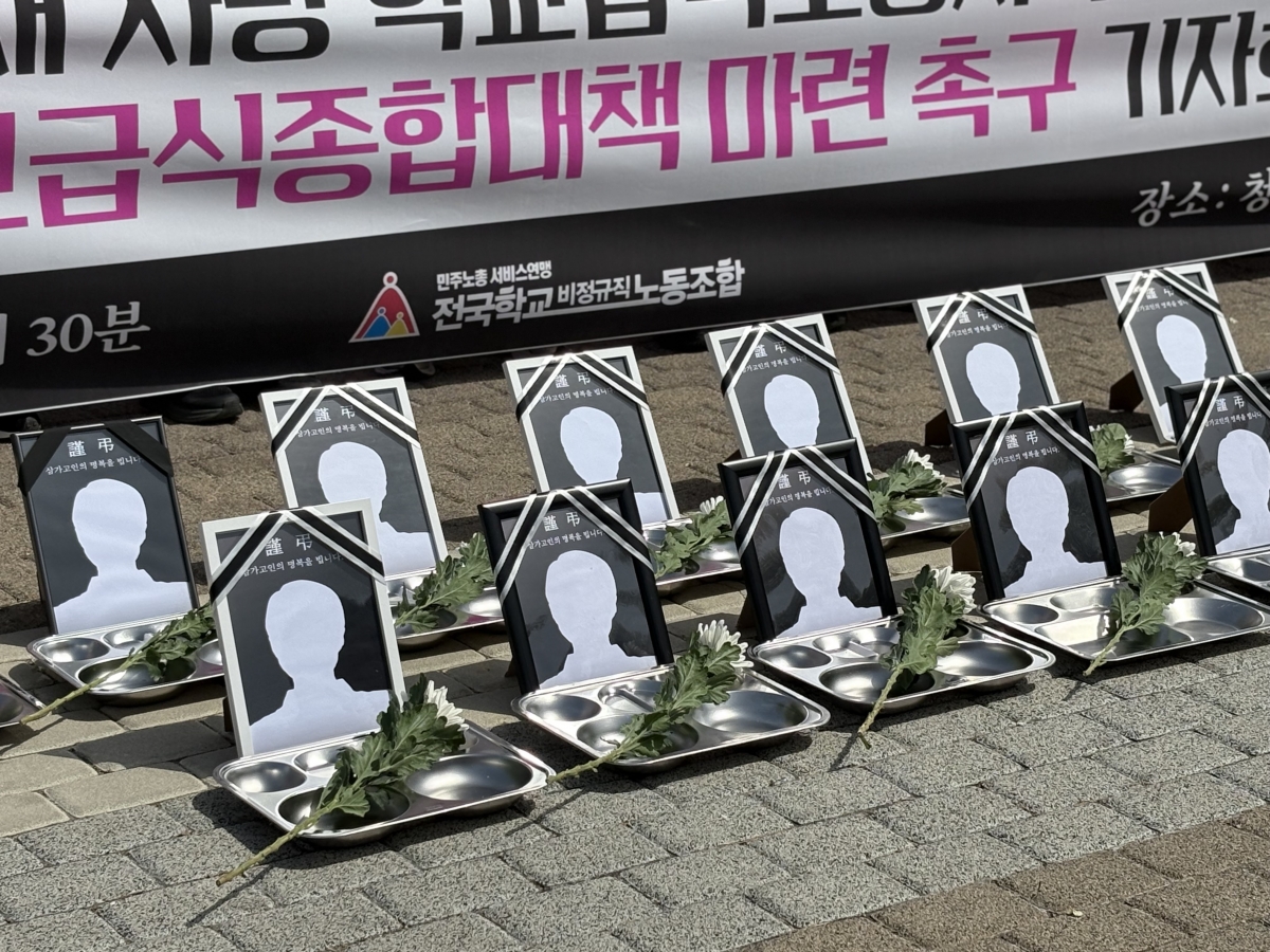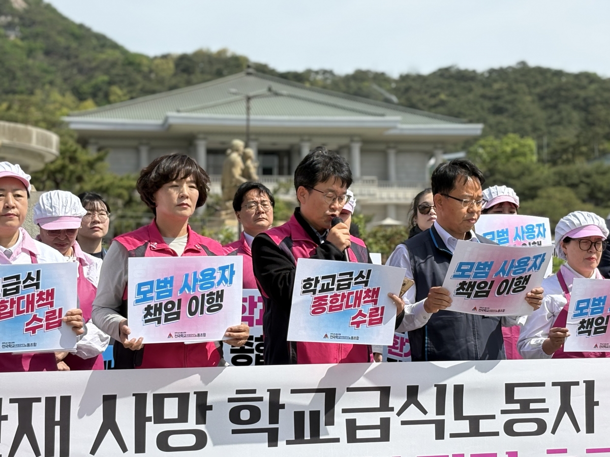 전국학교비정규직노동조합은 오늘(23일) 10시 30분 청와대 앞에서 “폐암 산재 사망 학교급식노동자 추모 및 교육부 학교급식종합대책 마련 촉구 기자회견”을 개최했다. 4.28 세계 산재 사망 노동자의 날을 맞아 폐암 산재 사망 학교급식 노동자 추모 및 산업재해 예방과 피해자 지원을 위한 정부의 신속한 대책 마련을 촉구하고자 개최된 기자회견이다. 기자회견 시작 전, 돌아가신 16명의 급식노동자들을 위한 헌화 및 묵념으로 추모의 시간을 가졌다. 기자회견 이후, 대통령비서관실 면담 및 요구안 전달을 진행했다. 우리의 요구는 ▲적정 식수인원 기준 연구용역 노동조합 참여 보장 ▲ 정기적 환기시설 개선 점검 및 지도 ▲폐암 산업재해 예방 및 피해자 지원▲학교급식종합대책 범정부 TF 구성 등이다. 전국학교비정규직노동조합은 일하다 죽지 않는 사회, 동료의 장례식에 가지 않아도 되는 사회를 만들기 위해 끝까지 투쟁할 것이다.