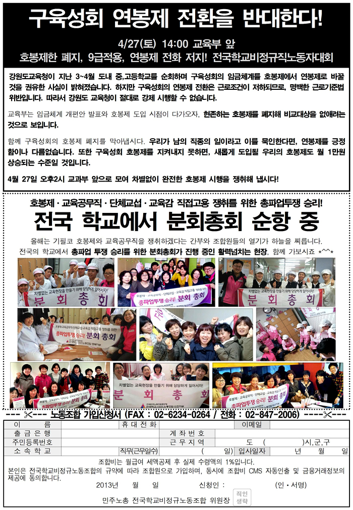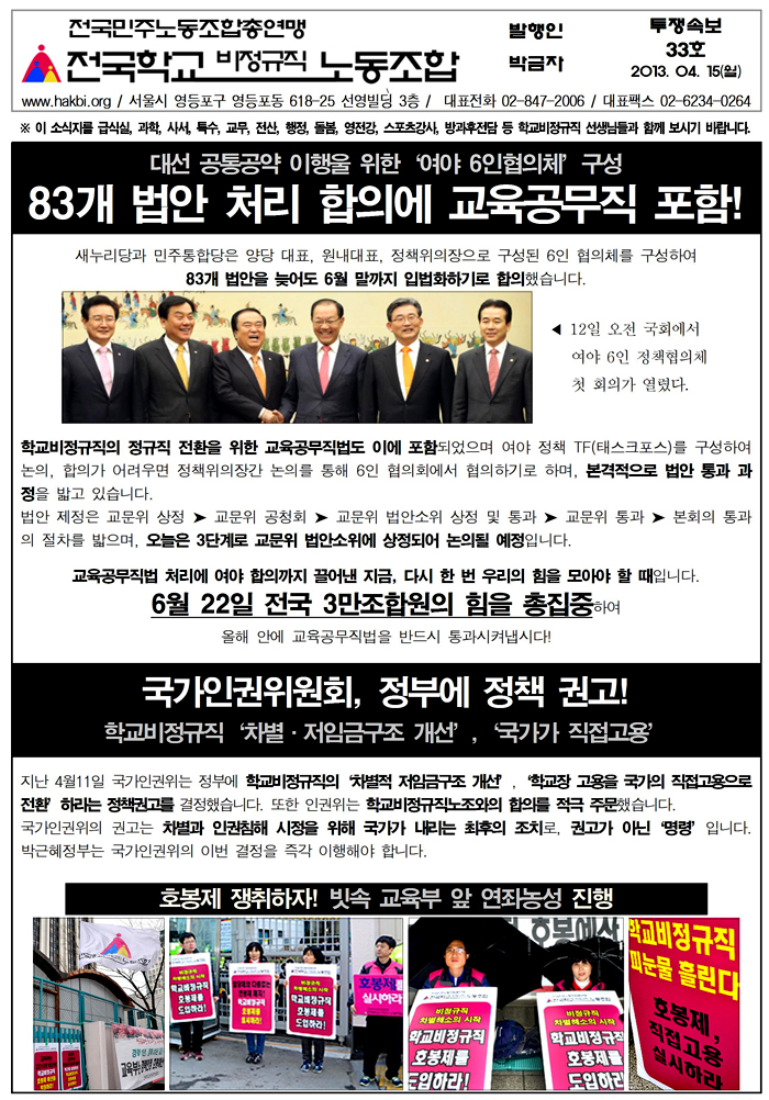 투쟁속보 34호 - 교육공무직 국회논의중! 국가인권위 정책권고 이행하라! 구육성회 연봉제전환 반대 전국학비노동자대회, 전국 분회총회 순항 중!