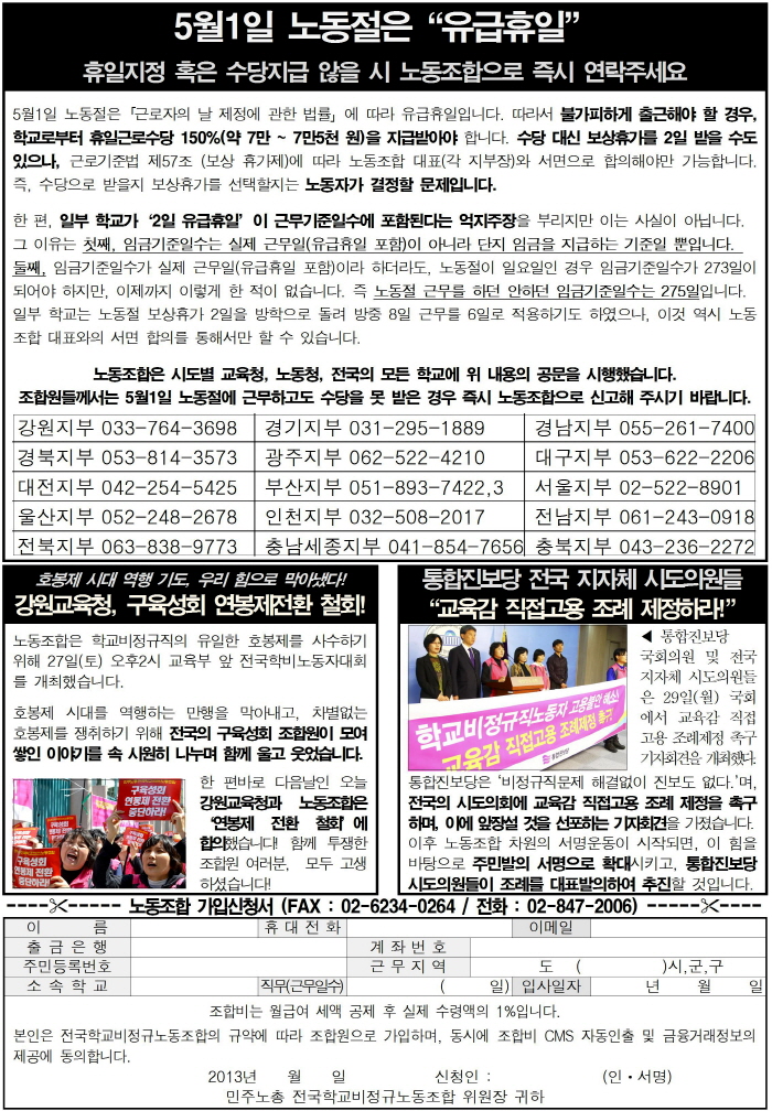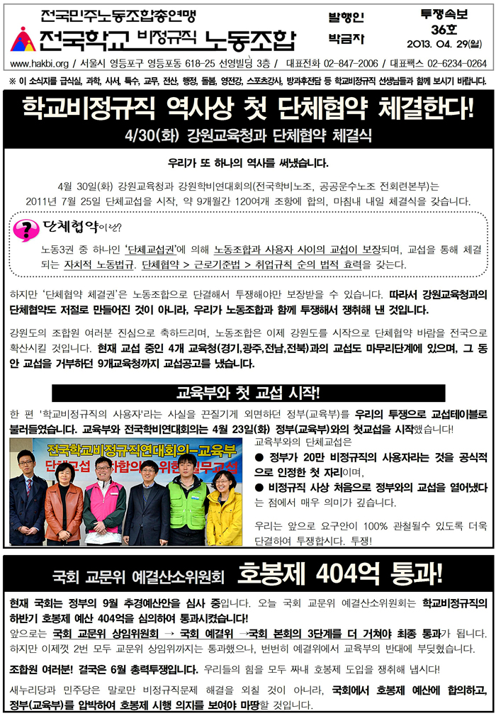 투쟁속보36호-강원 단체협약 체결, 호봉제 404억 국회논의중, 노동절수당 꼭 챙기세요!