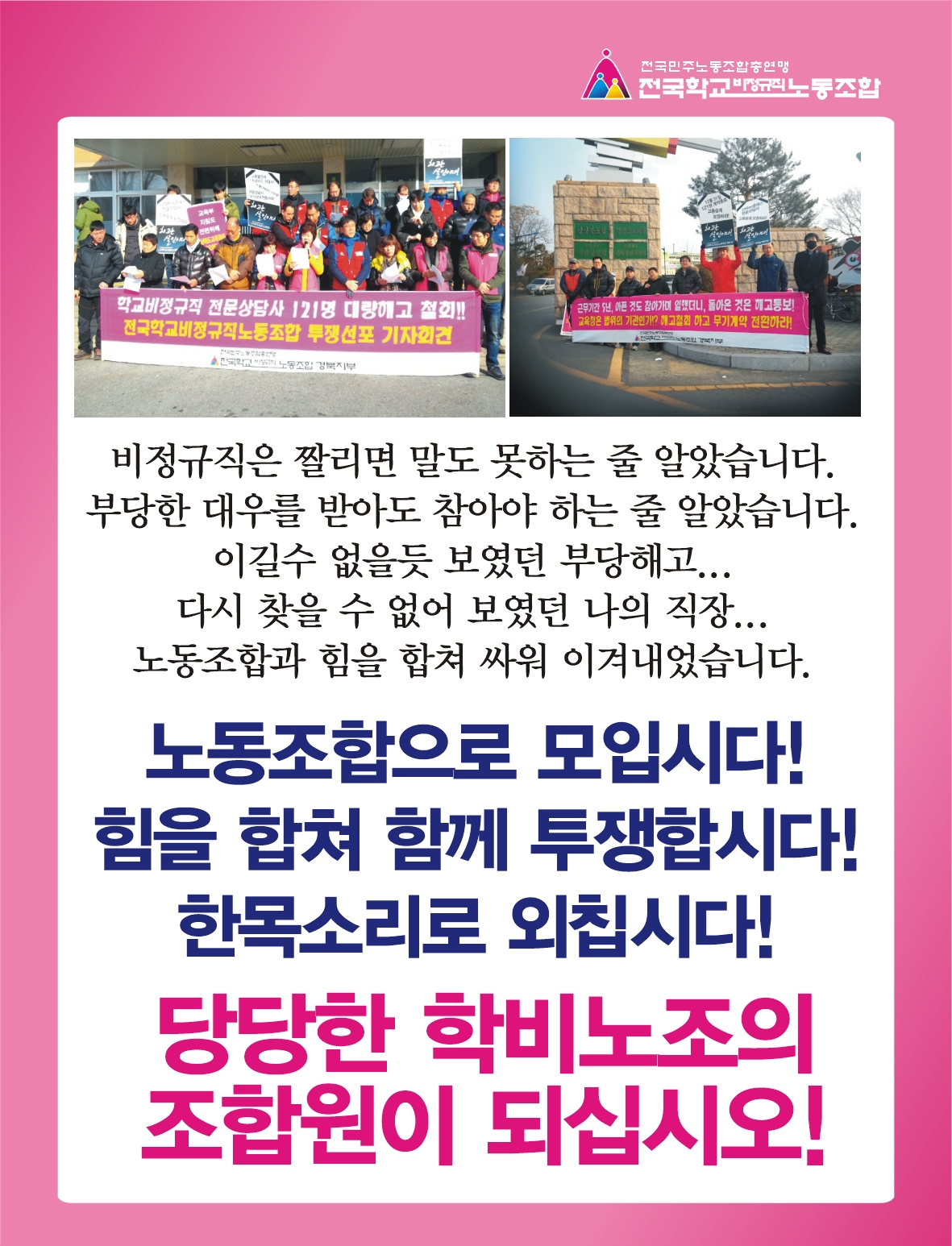 해고투쟁 승리소식!!! 중노위 "부당해고 취소판결" http://hakbi.org/bbs/tb.php/mobilenews/6/21801f2371ebd112b55afb43484a29eb [학비노조 모바일소식지 7월3주 화요판] 위 링크로 접속하셔서 읽어보세요~ ^^* 한페이지씩 구성되어 있으니 손가락으로 확대 및 축소하시면서 보실수 있습니다. 손가락으로 꾹 누르시면 한페이지만 다운로드 받으실수 있습니다.~ 주변의 지인들과 나누어 보세요~~