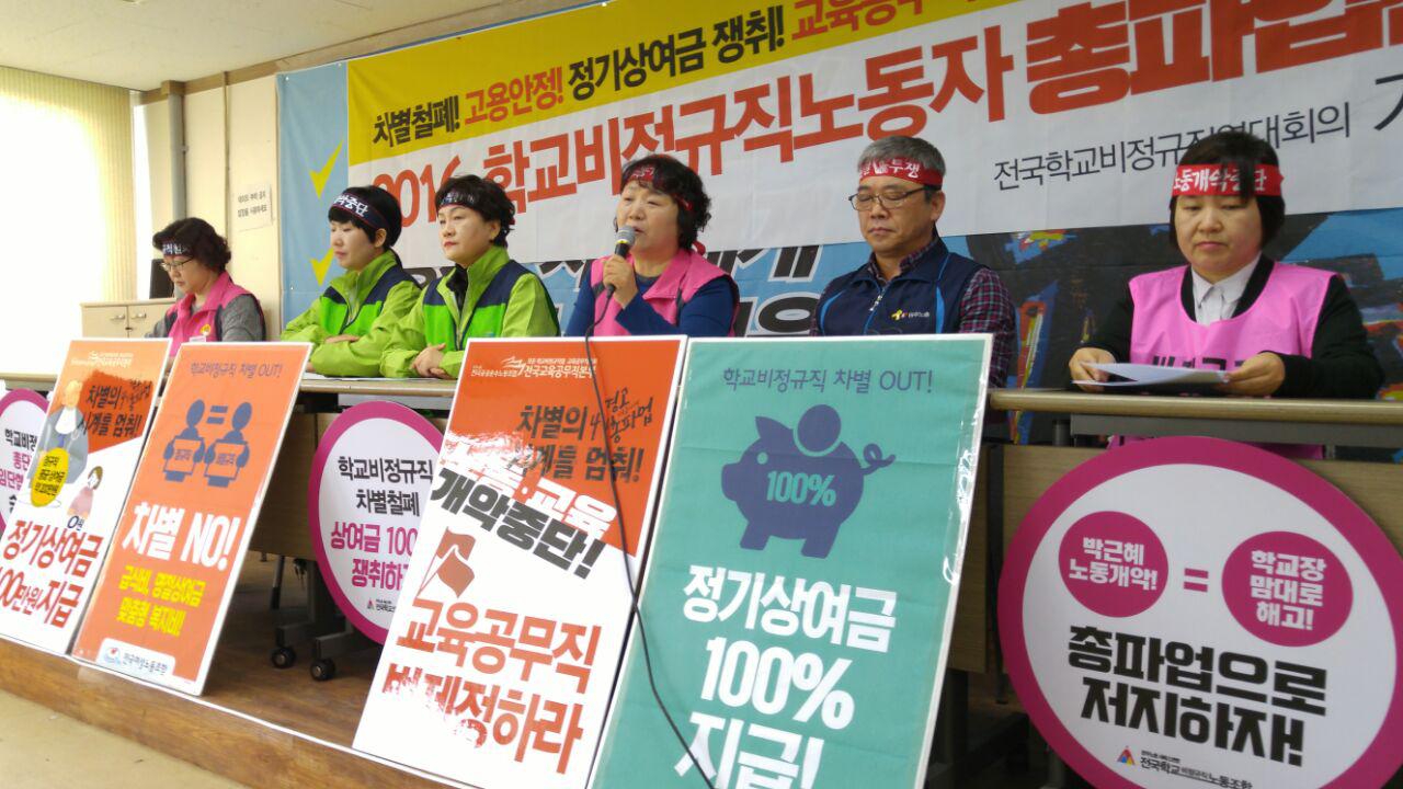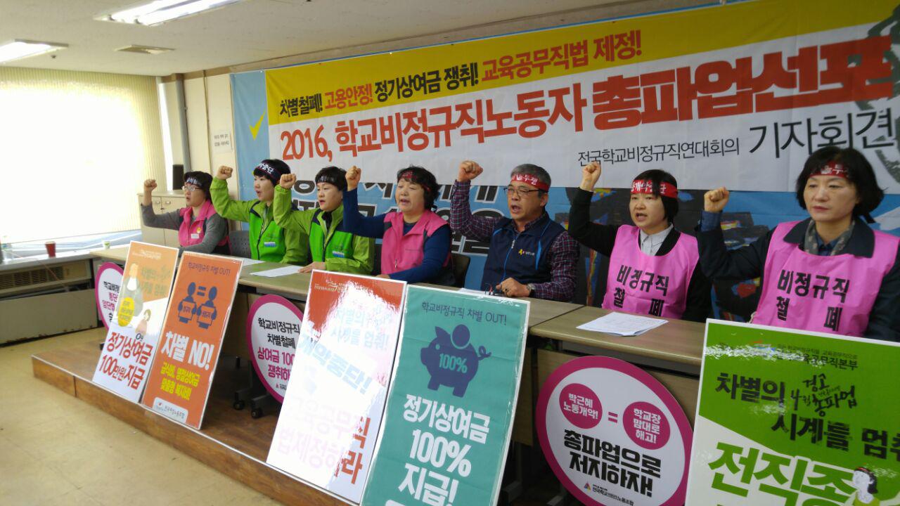 이에 전국학교비정규직연대회의는, 차별과 고용불안 현실을 외면하는 박근혜 정부와 전국의 시도교육감을 상대로 2016년 총파업을 포함한 강력한 투쟁을 선포한다. 먼저 상반기 중 4월 1일 공공운수노조 전국교육공무직본부의 파업을 시작으로, 4월 8일 전북지역의 전국교육공무직본부와 전국여성노조의 공동파업, 6월 전국학교비정규직노조의 파업 투쟁을 진행할 것이다. 만약 상반기 중 정기상여금 제도 신설 등 임금 차별해소와 고용안정을 위한 뚜렷한 대책이 마련되지 않는다면, 하반기에는 연대회의 소속 모든 노동조합들의 공동 총파업을 포함한 더욱 강력한 투쟁을 전개할 것임을 선포한다.