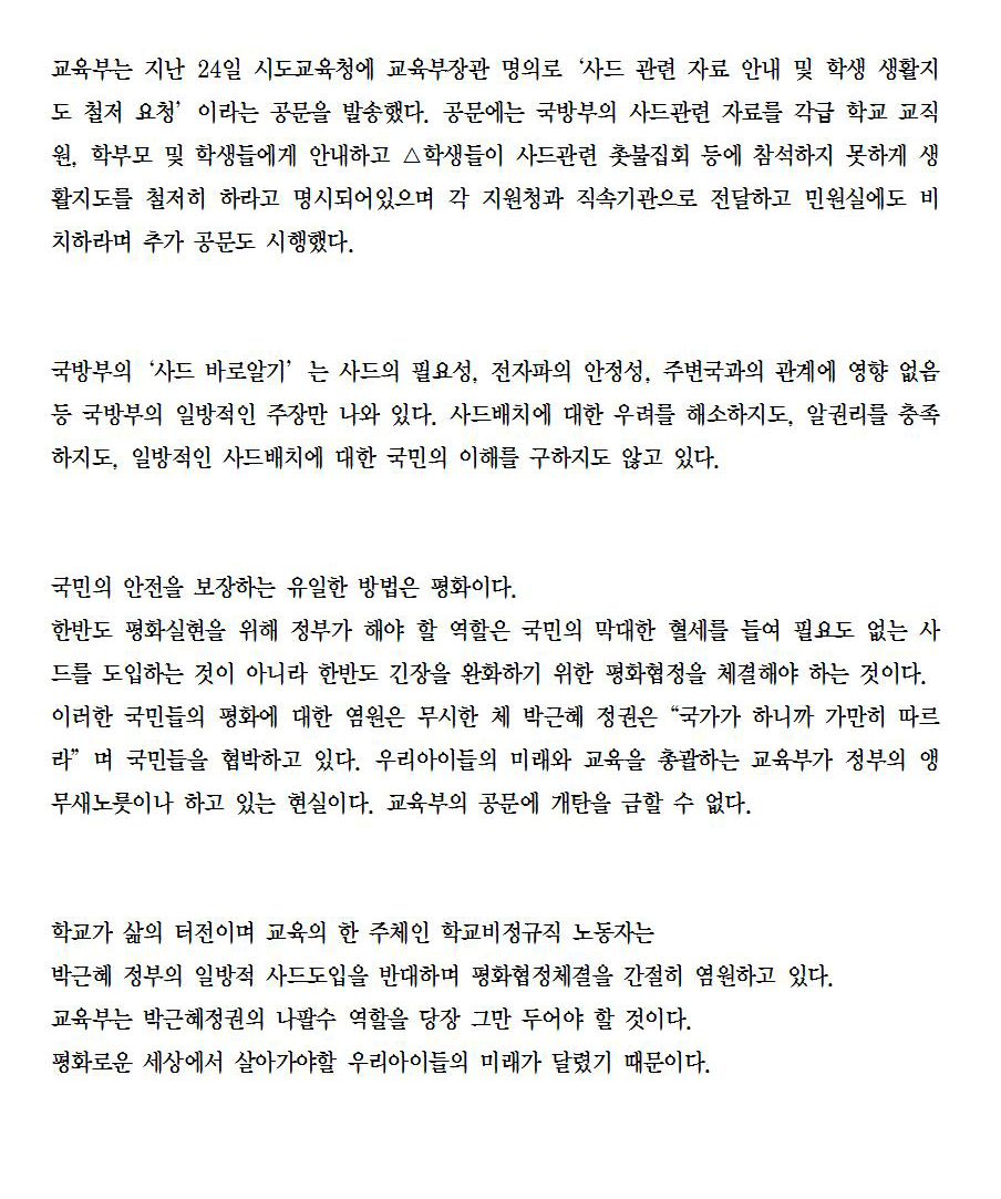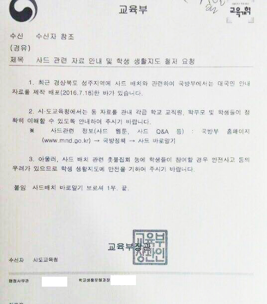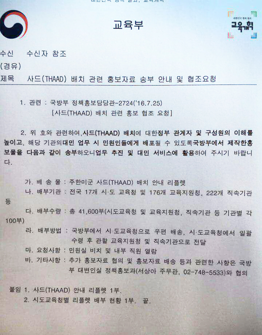 [교육부] 사드 관련 선전물 배포・학생 집회참석 금지 공문 파동