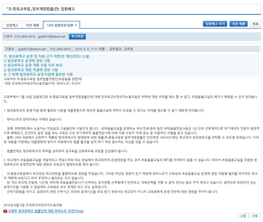 학비노조는 교육부 법률안에 대한 반대의견을 제출하고 조합원들과 함께 입법예고시스템에 반대의견을 모아내고 있습니다.
