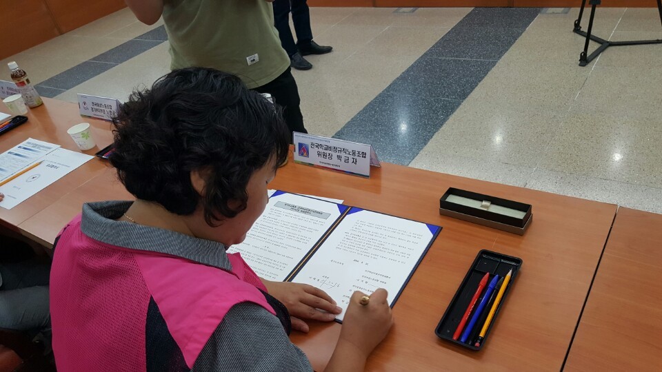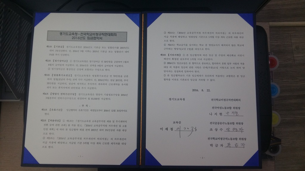 지난달 잠정합의했던 2016년 임금협약을 8월22일 경기도교육청에서 조인식을 가졌습니다.