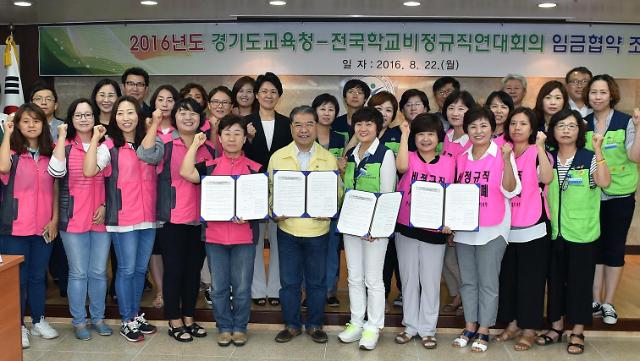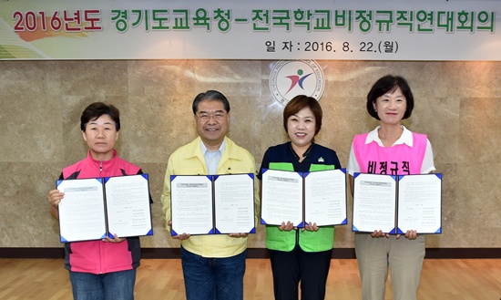 경기도교육청 이재정 경기도교육감, 전국학교비정규직노동조합 박금자 위원장 등 경기도교육청과 전국학교비정규직연대회의 등 40여명이 '2016년도 경기도교육청-전국학교비정규직연대회의 임금협약 조인식'을 가졌습니다.