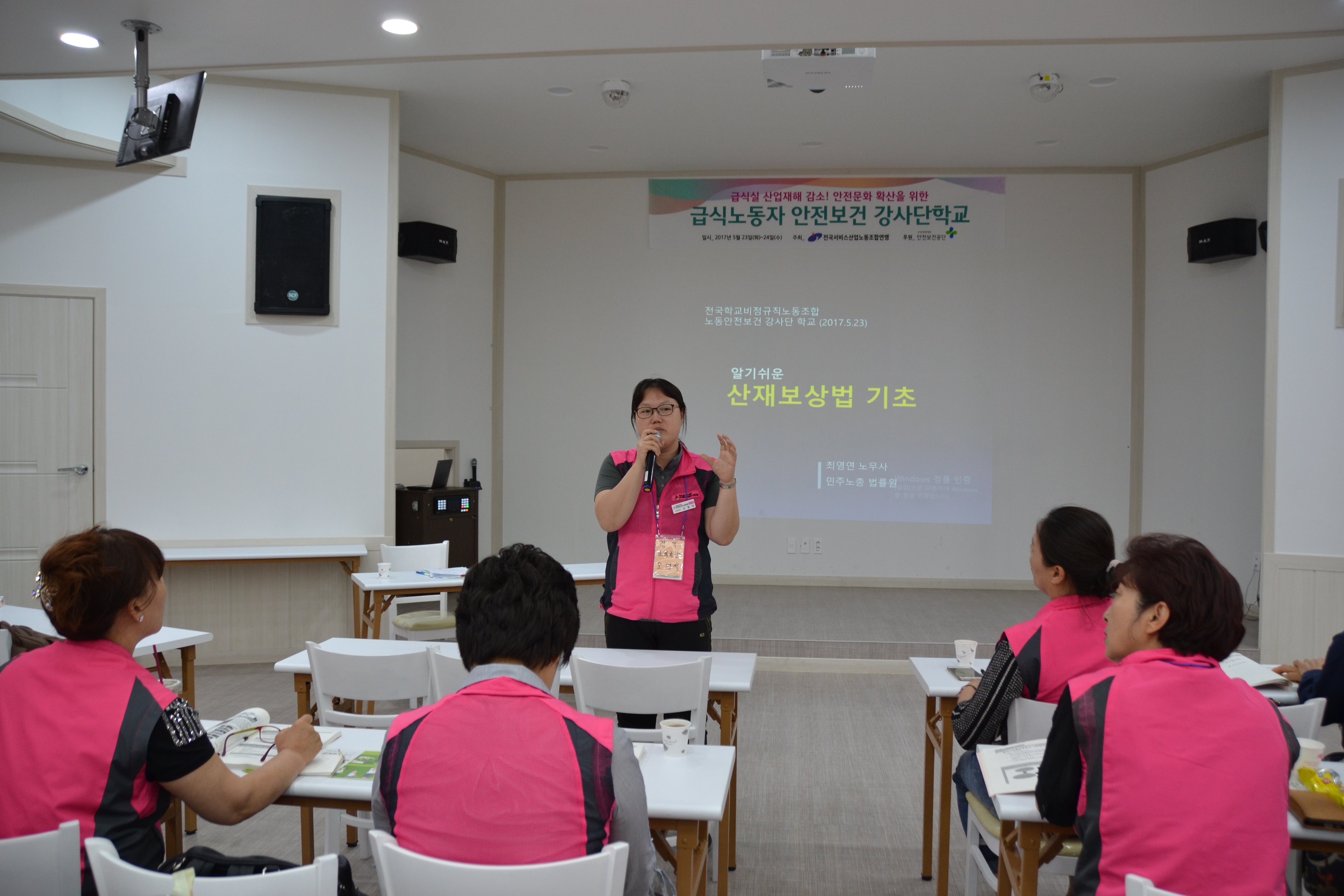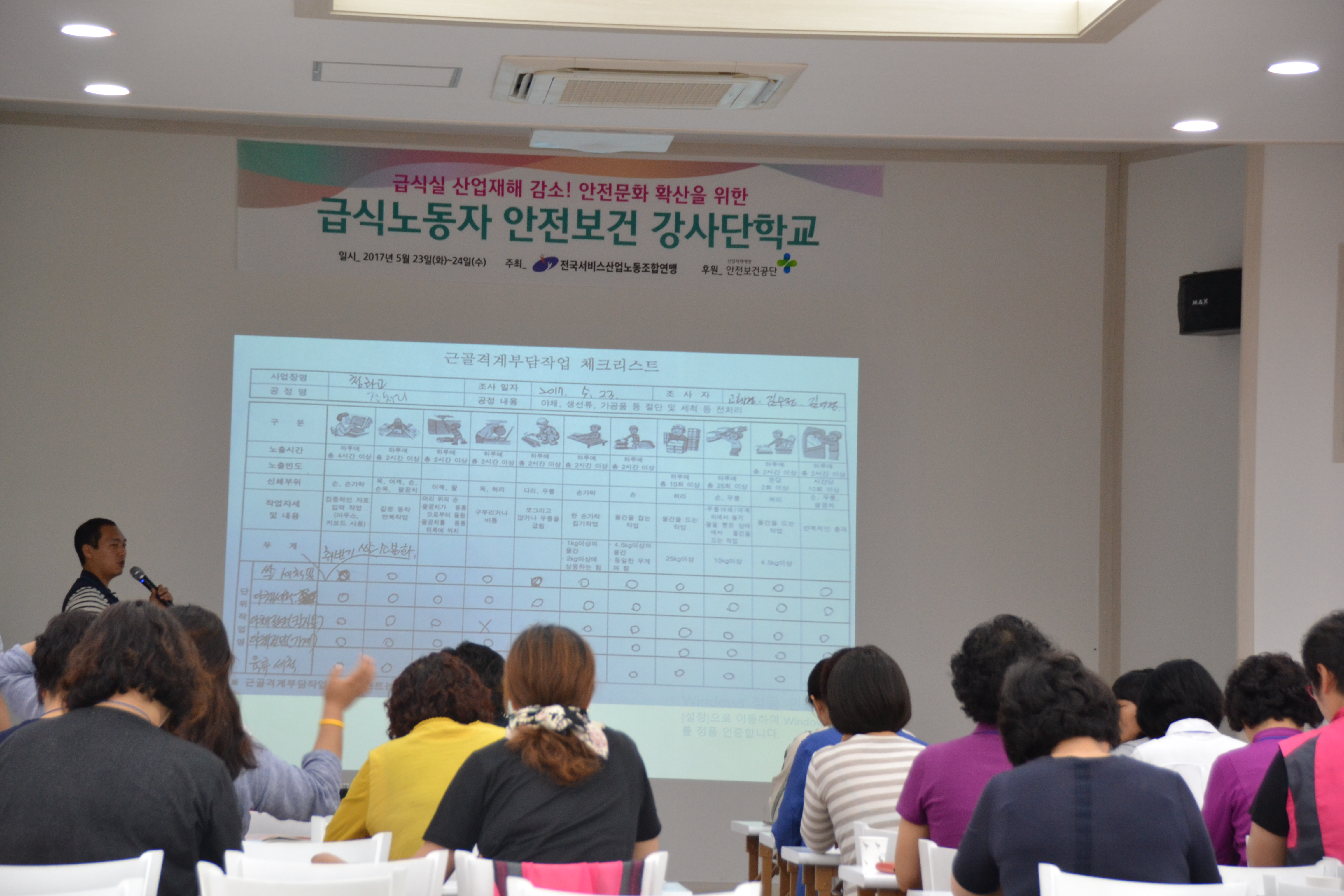 첫 강연은 즐겁게 몸풀기 운동법으로 시작하여 산재보상, 근골격계 유해요인 조사법 등을 하였고, 조별토론으로 산재신청 및 보상, 근골격계 유해요인, 예방에 대해 토론을 하였습니다.