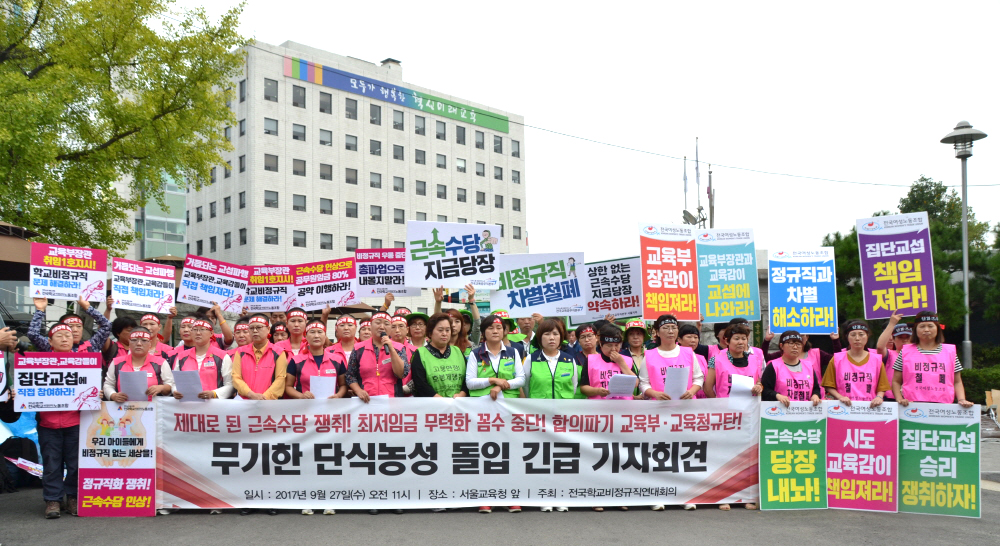 밤샘, 마라톤 교섭을 진행후 서울시교육청앞에서 교섭파행 규탄 무기한 단식연좌농성을 하였습니다.
