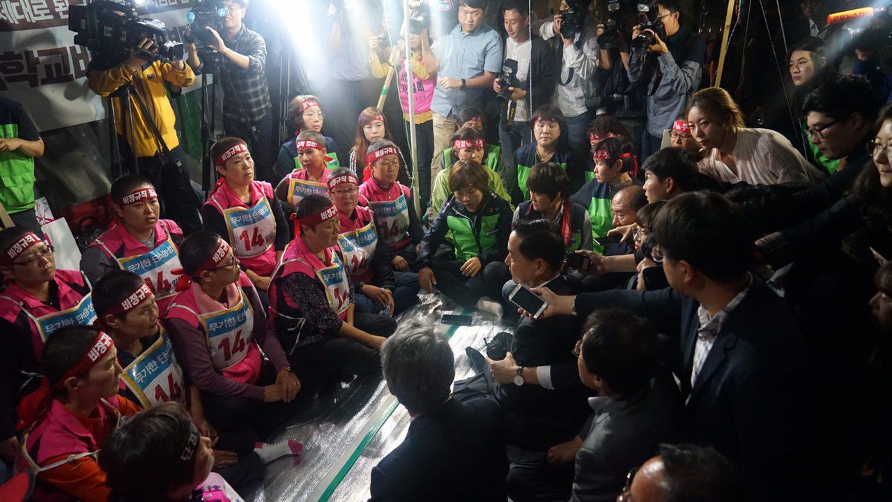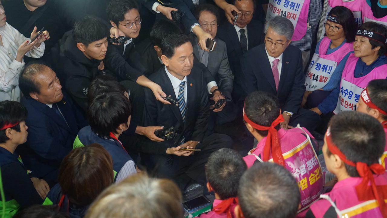 교육부 장관과 총6명의 교육감이 농성장에 방문했습니다. 이들은 집단교섭에 임하는 사용자들의 준비부족에 대해 사과하고, 단식농성을 중단해줄 것을 요청하였습니다.