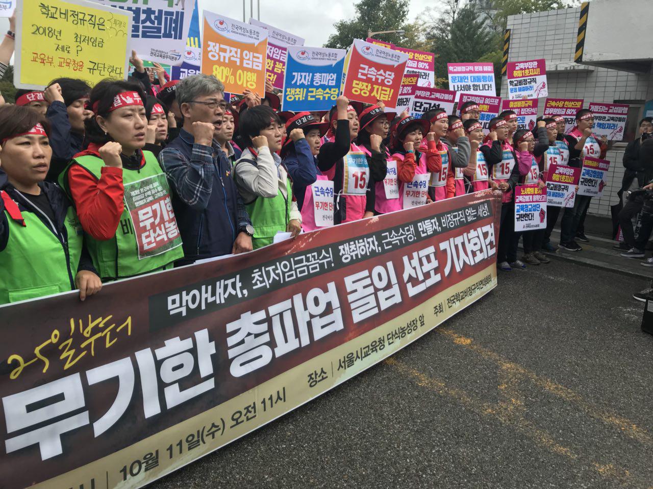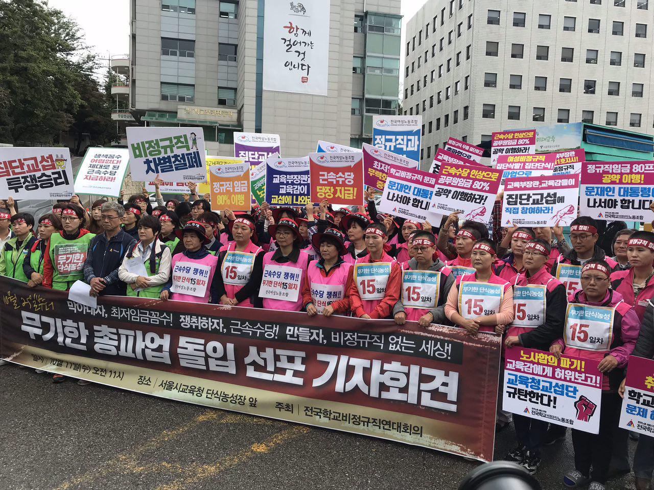 그러나 10월 25일부터 전개되는 전면 총파업은 예정대로 진행하기로 하였습니다. 10월 총파업은 단순히 17년 임금교섭(근속수당 인상)에 머무르는 것이 아니라 향후 공무원대비 임금80%인상을 실현시킬 수 있는 담보를 만드는 투쟁으로 규정했습니다. 이를 실현하기 위해서는 사측의 최저임금무력화 시도(임금산정시간 개편)을 완전히 파탄내고 공무원대비 임금80%인상 시킬 수 있는 재원을 확보해야 하기에 총파업을 예정대로 진행하기로 했습니다. 그간 무기한 단식농성문제로 학교비정규직 문제가 사회, 정치 쟁점화 되었고 총파업 투쟁은 학교비정규직 문제를 더 큰 사회, 정치 쟁점으로 키워내게 될 것이며다. 이를 매개로 강력한 교섭력을 확보하고 우리 요구안을 관철하기로 했습니다.