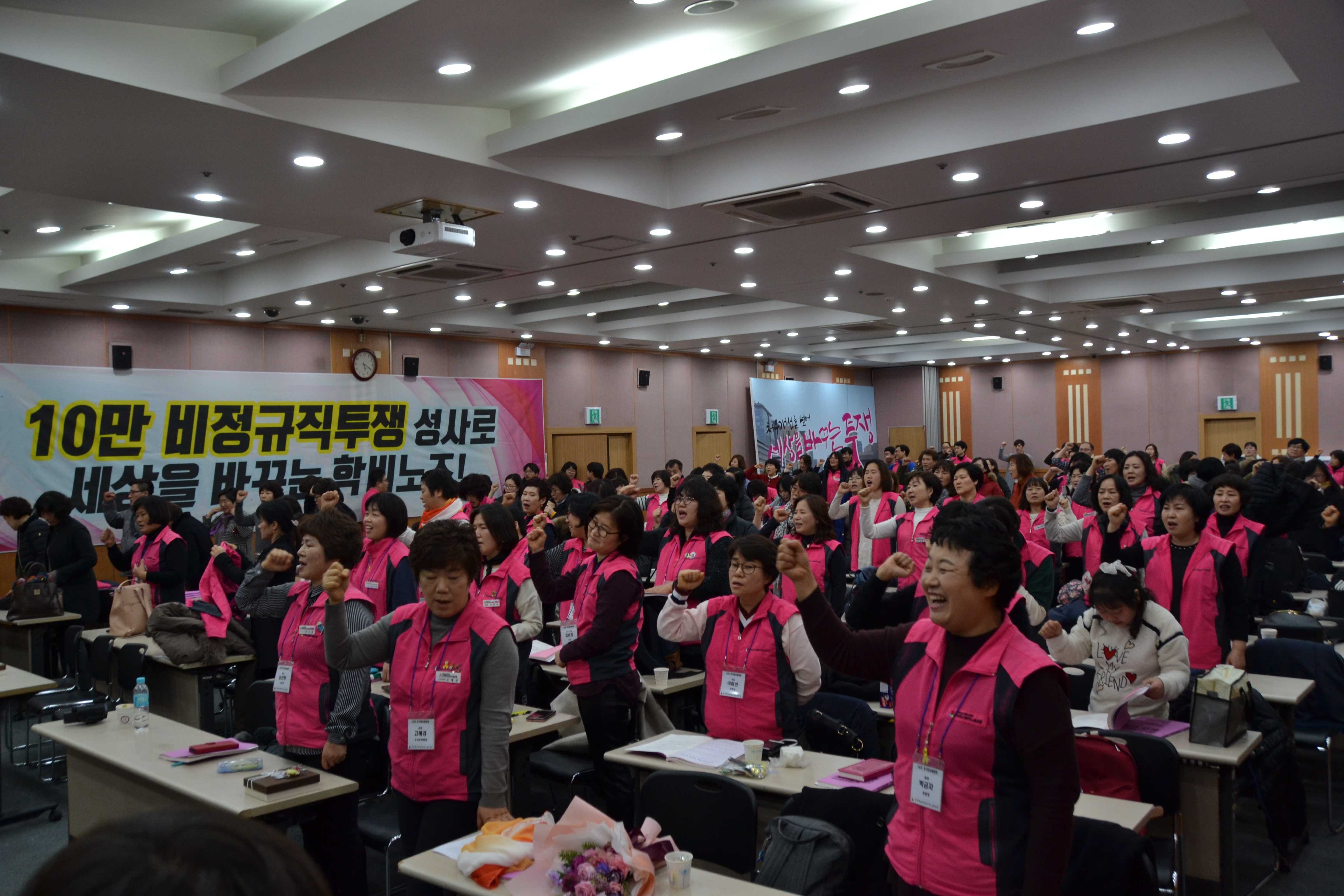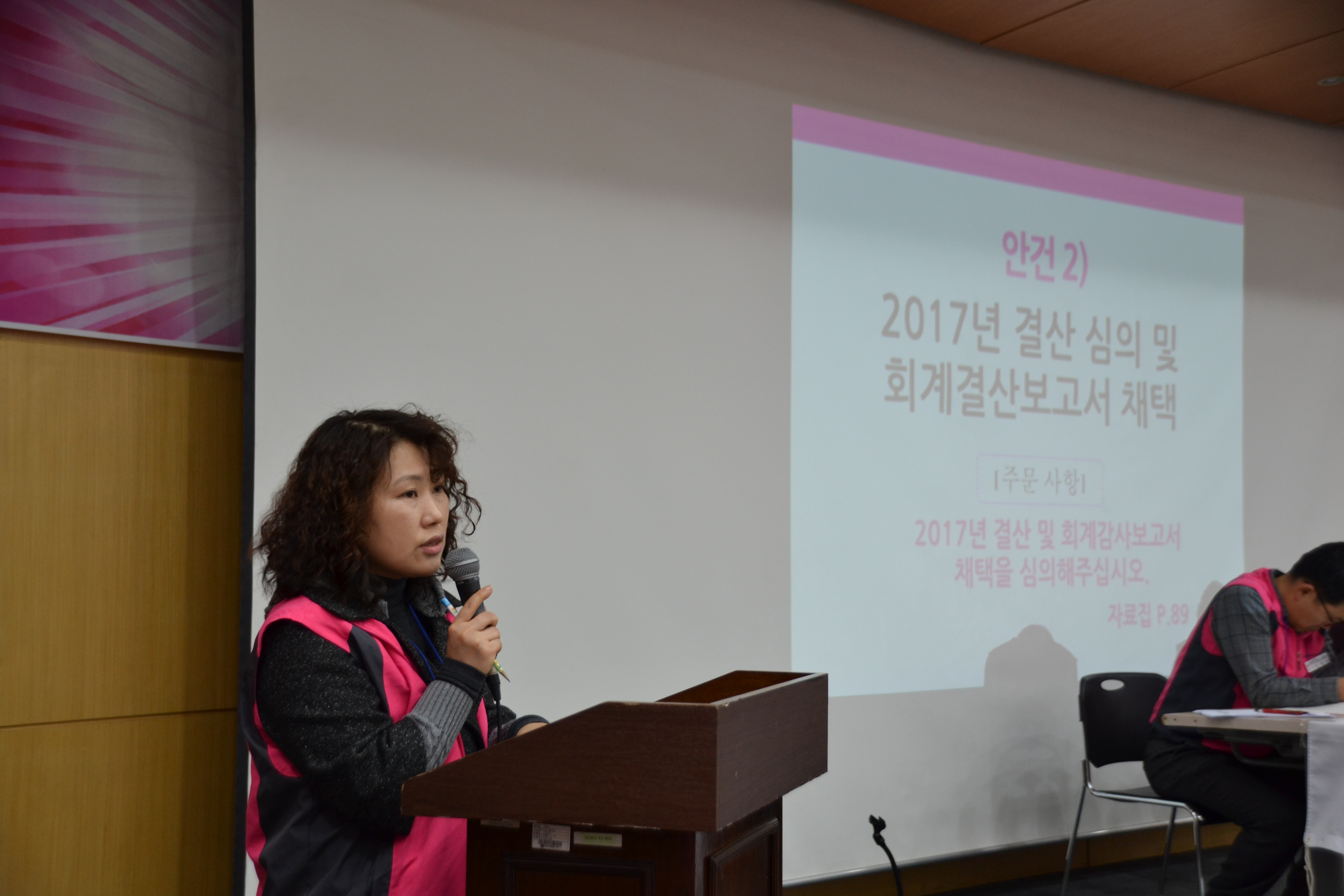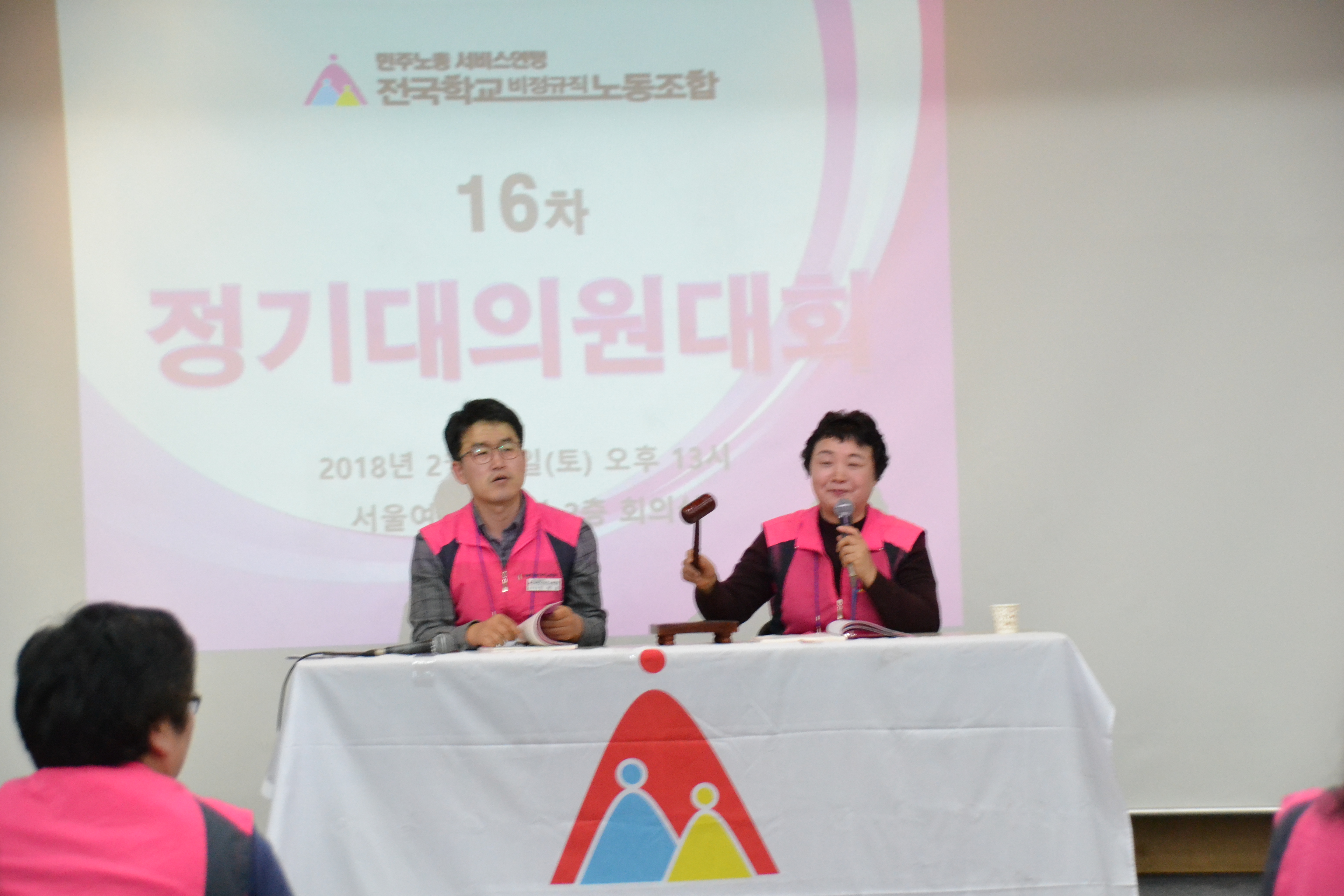 2월 24일 지난주 토요일, 오후 2시부터 6시 사이, 우리노조의 12차 정기 중앙위원회와 4기 출범식, 16차 정기대의원대회가 서울여성플라자 한곳에서 순차적으로 진행되었습니다. 전국에서 달려오신 200명의 대의원과 조합원 앞에서 규정개정과 2017년 사업평가, 2018년 사업계획을 제출하고 심의하였습니다. 중앙위원회가 끝나고 대의원대회가 시작되기 전, 4기 출범식도 진행되었습니다.