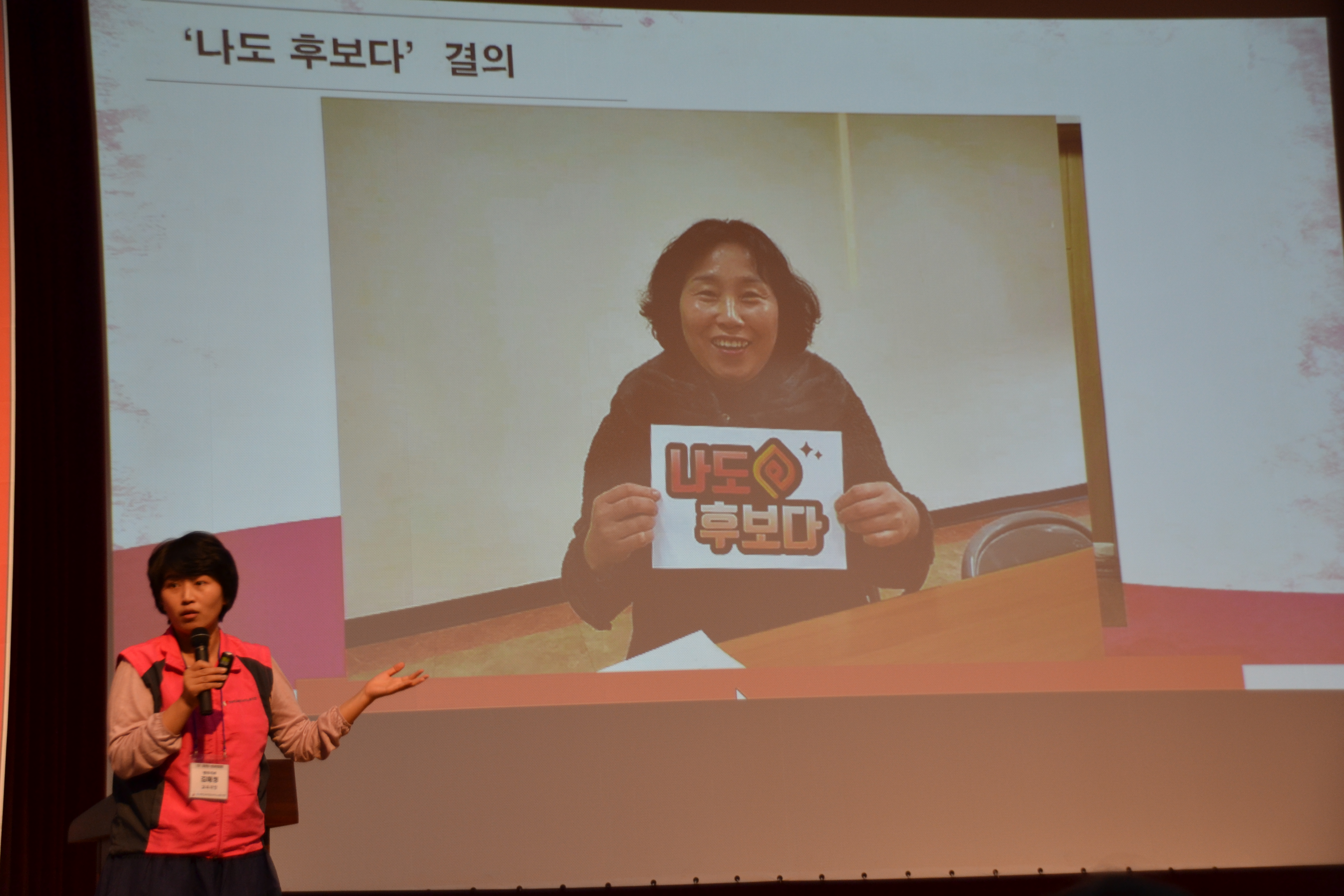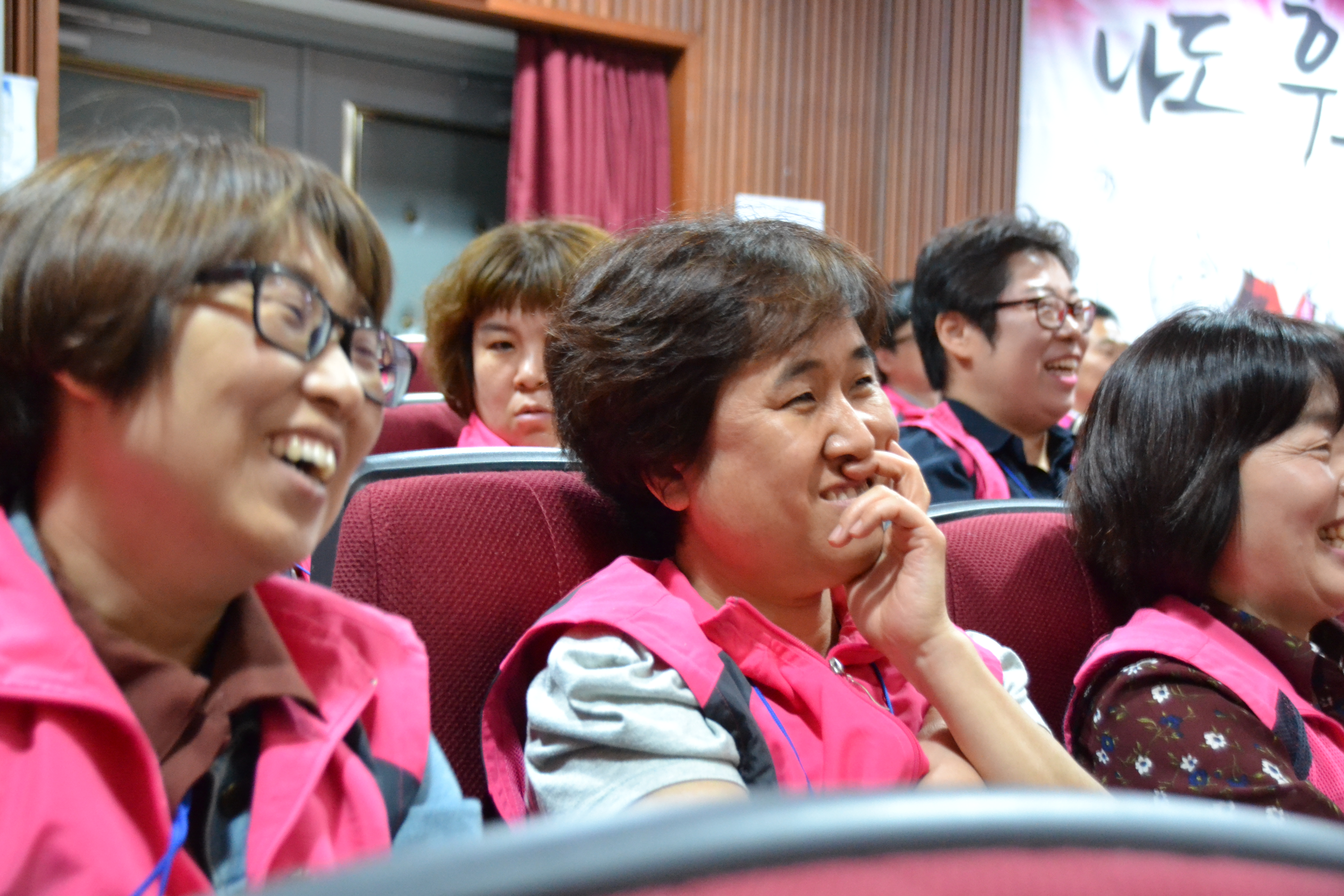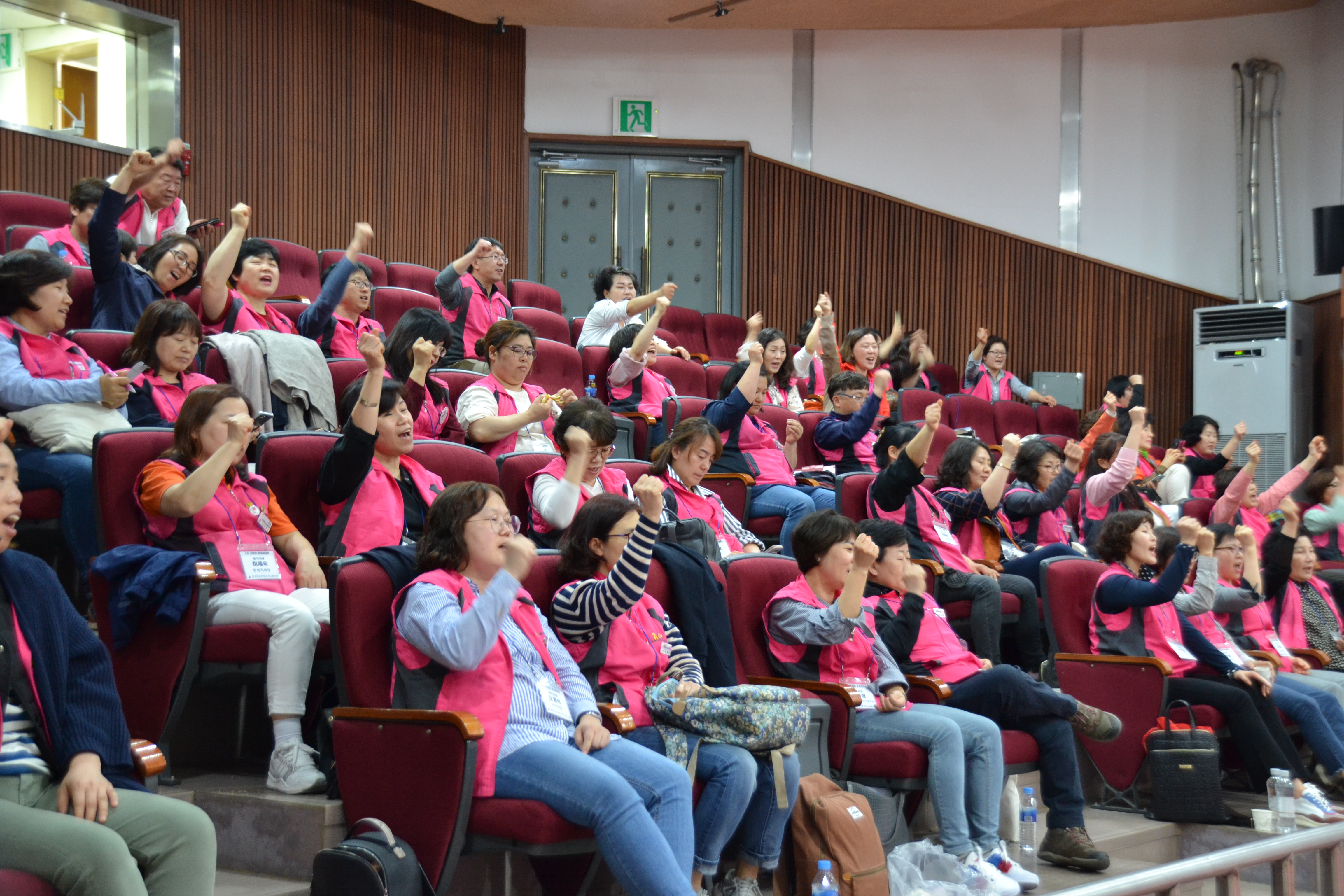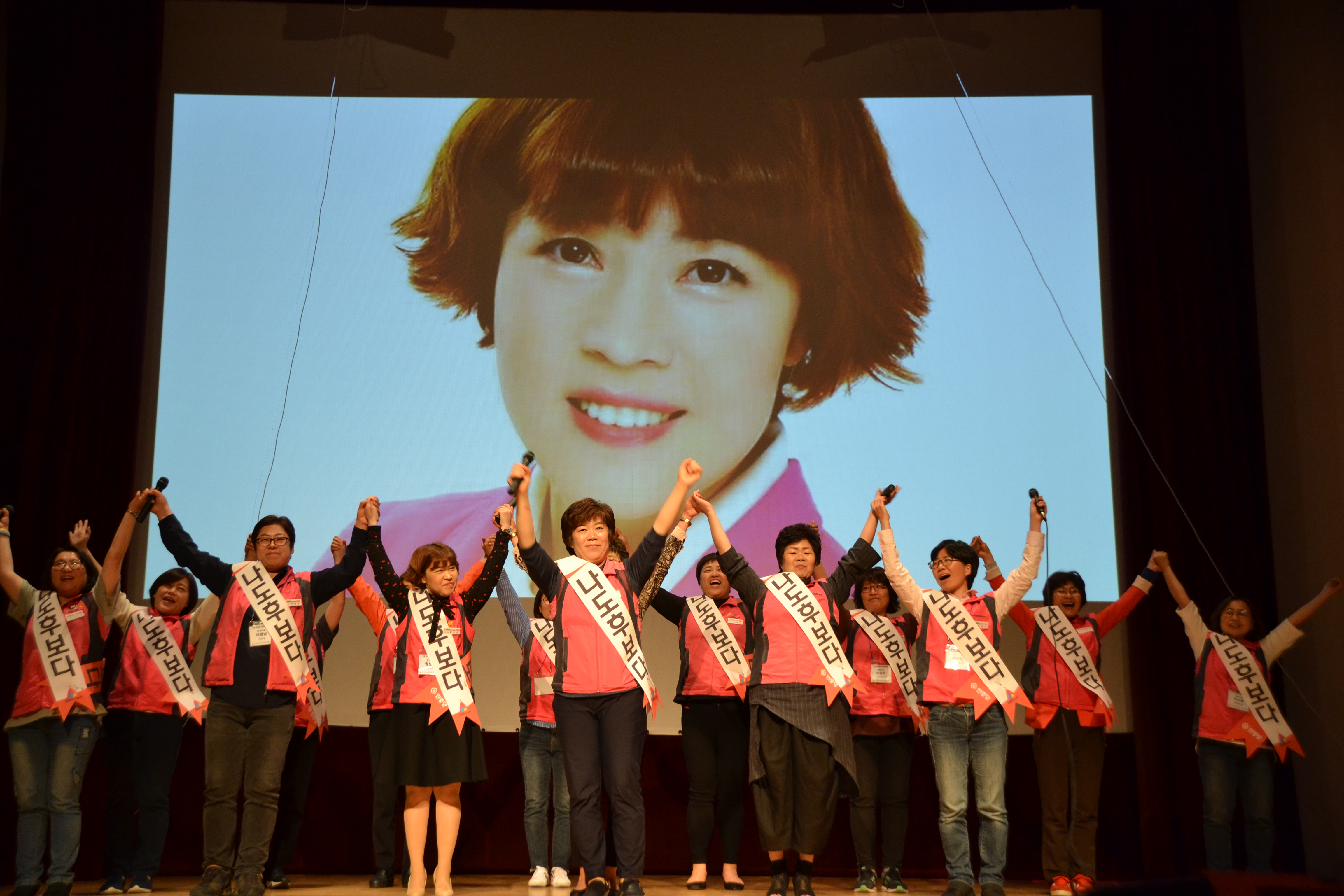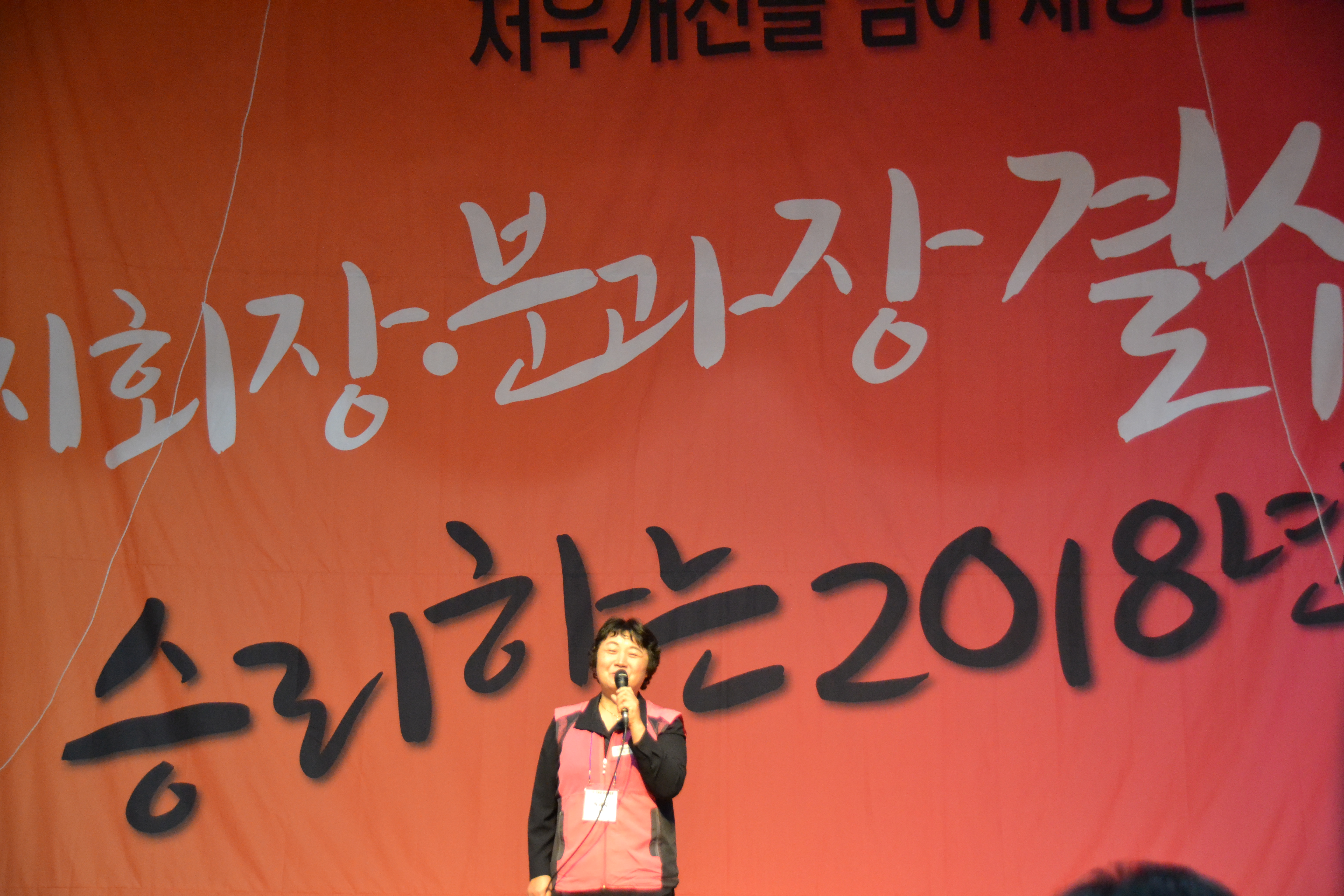박금자 학비노조 위원장은 만연한 미소를 띄우고 결의있게 마무리 발언을 하였습니다. “다들 바쁜 주말이겠지만 지회, 분과장 간부들이기 때문에 오신 것 같다. 직접정치하는 선거운동 해야겠다는 다짐이 느껴진다. 3년 전에 학비노조 몇몇 간부님들과 평양에 간 적이 있었는데, 그때 예감했다. 정상회담이루어질 것으로. 그런데 어제 (27일)에 이루어졌다. 학비노조가 가면 길이 된다. 그만큼 학비노조는 한발 빠르다. 군축, 이미 우리가 이야기 했었다. 종북빨갱이 두렵지 않다. 이미 옳은 길을 가고 있기 때문이다. 처우개선을 넘어 세상을 바꾸는 투쟁하자 우리가 나섰다. 올해 우리가 학비노조 사업 계획대로 퍼즐이 맞춰가고 있다. 올해 가장 필요한 첫 번째 퍼즐은 <지방선거 승리! 진보교육감 17지역 석권! 22명의 학비노조후보 당선!>이다. 이것을 잘 해야 우리가 올해 고생을 덜할 것이다. (웃음)피가 되고 살이되는 오늘의 교육들을 가슴속에 잘 담고 피가 되고 살이되는 교육으로 실현하자.