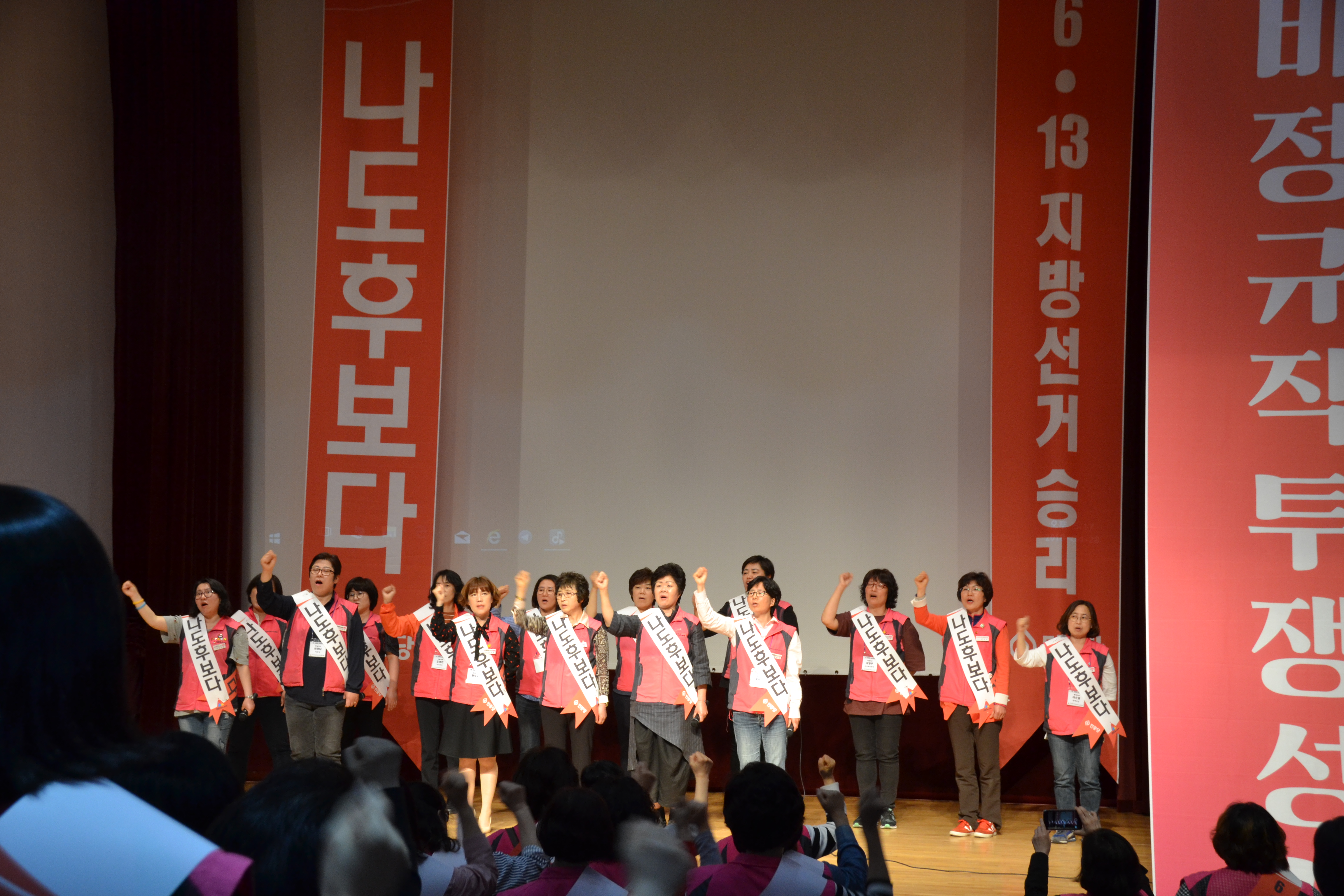 5시간을 꽉 채운 가슴뜨거운 지회분과장 대회는 학비노조 후보들의 “내게 행복을 주는 사람” 열창으로 시작하여, 200여명의 지회분과장들의 단체 어깨띠를 두르고 함께 구호를 외친 후 감동속에서 끝이 났습니다.