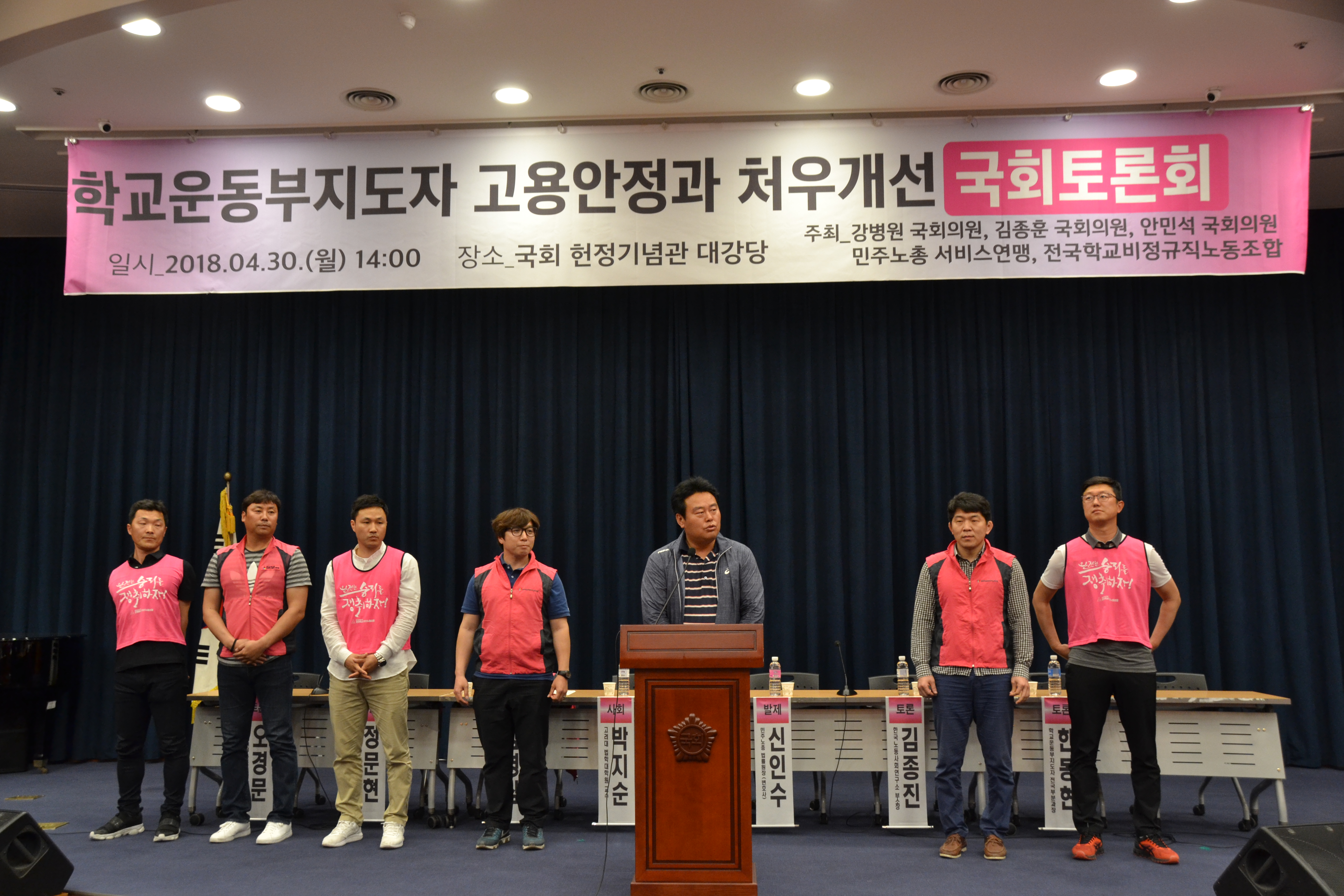 공동주최로 강병원 더불어민주당 국회의원, 김종훈 민중당 국회의원, 안민석 더불어민주당 국회의원, 민주노총 서비스연맹에서 함께 했습니다. 박지순 고려대학교 법학전문대학원 교수를 사회로, 신인수 민주노총 법률원장, 김영삼 학비노조 학교운동부지도자 전국분과장, 정문현 충남대 스포츠과학과 교수, 김종진 한국노동사회연구소 부소장, 오경문 경남교육청 체육건강과 장학사, 한동현 학비노조 학교운동부지도자 전국부분과장 발제와 토론을 차례대로 진행하였습니다.