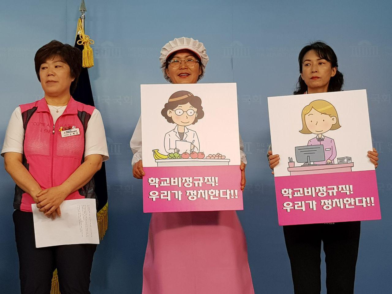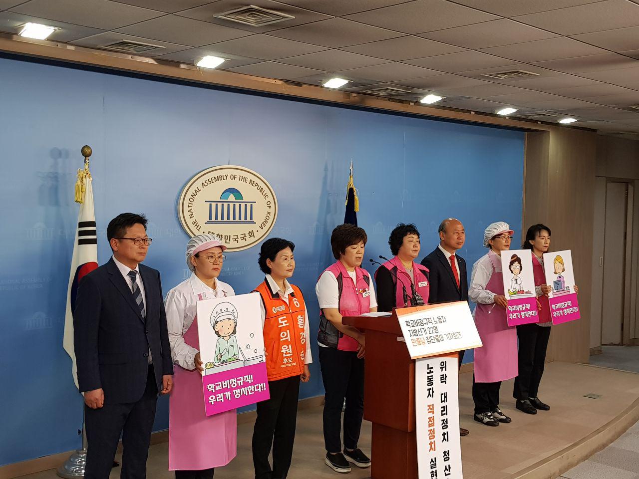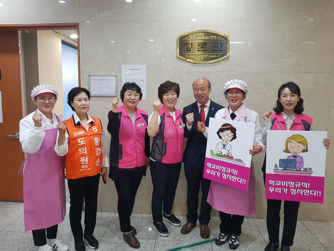 국회 정문 앞에서는 황호순 전국학교비정규직노동조합 전남지부 수석부지부장이자 전남 도비례후보, 최락숙 전국학교비정규직노동조합 부산지부장이자  부산 도비례후보의 발언과 이영주 전국학교비정규직노동조합 대전 수석부지부장이자 대전 서구 시의원후보, 조영란 전국학교비정규직노동조합 서울지부 부지부장이자 서울 시비례 후보들의 기자회견문 낭독이 있었습니다.