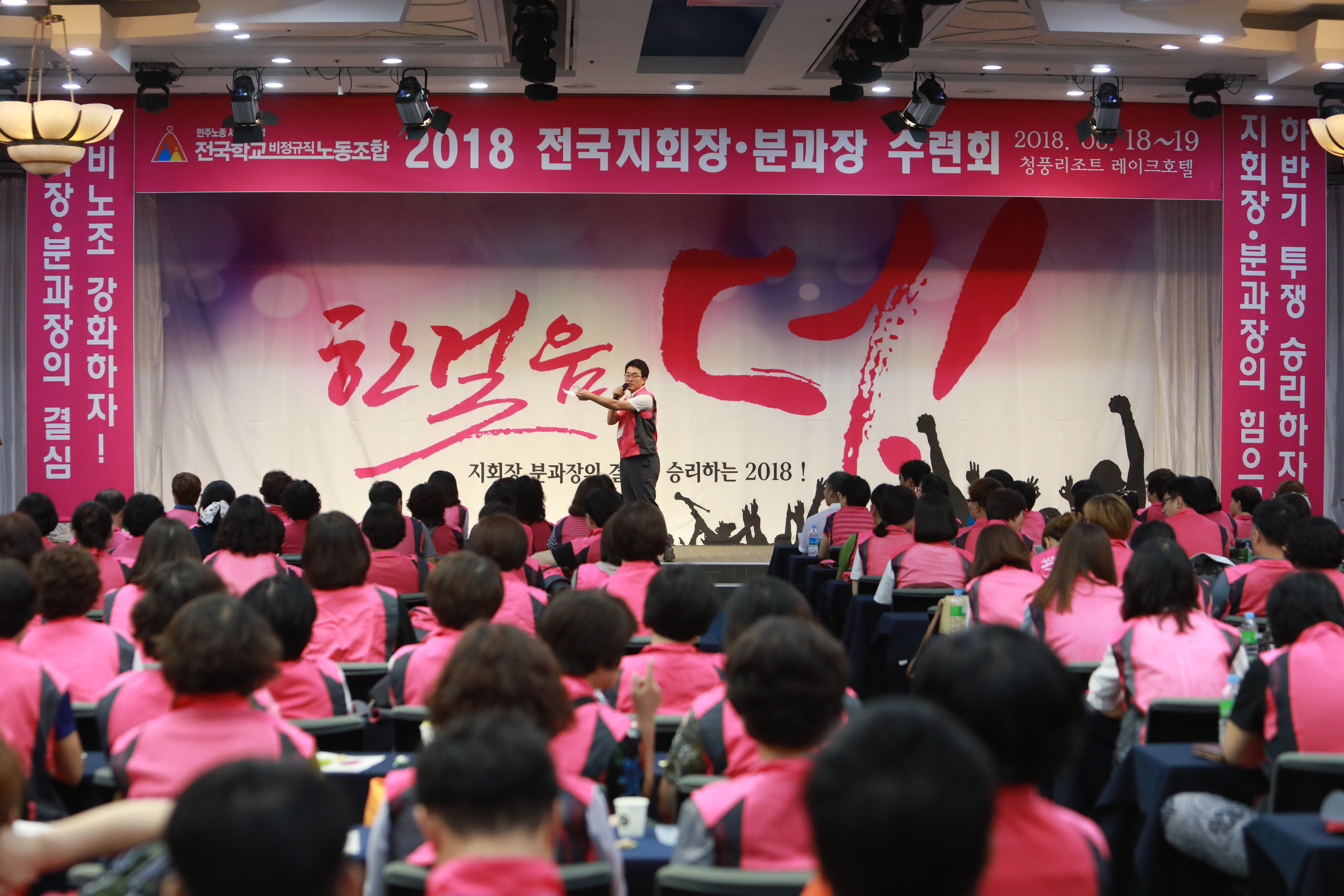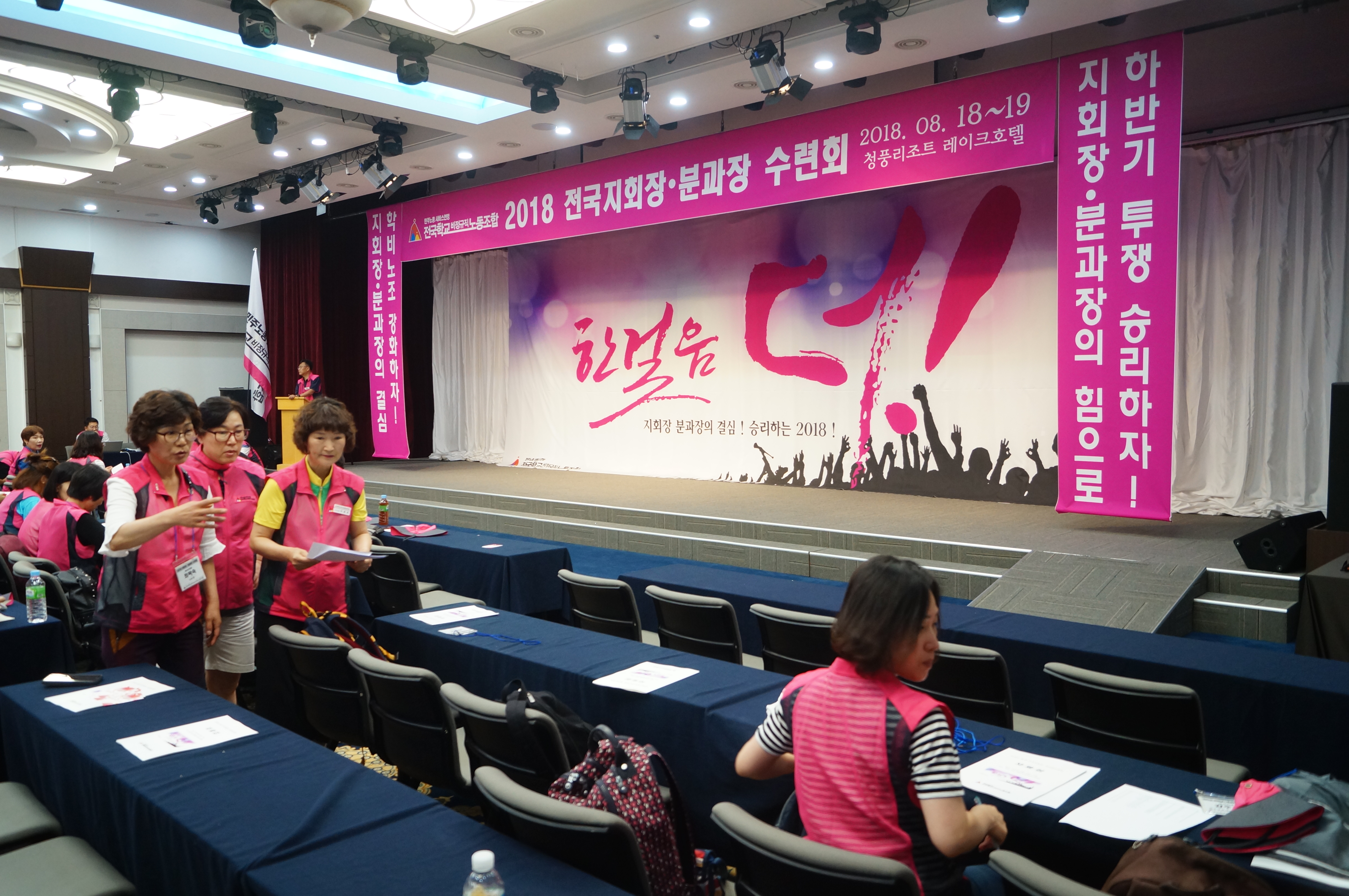 2018년 전국 지회장, 분과장 수련회가 8월 18일부터 19일 양일간 충청북도 제천시의 청풍레이크호텔에서 진행되었습니다. 전국에서 모인 지회장, 분과장 및 지부 간부들까지 도합 300여명이 참여하였습니다. 수련회는 한걸음 더! 라는 슬로건으로 지회장, 분과장의 결심으로 승리하는 2018년을 만들어가자는 기조로 기획되었습니다. 나아가 하반기 투쟁을 지회장, 분과장의 힘으로 승리하자는 방향으로 프로그램을 진행했습니다.