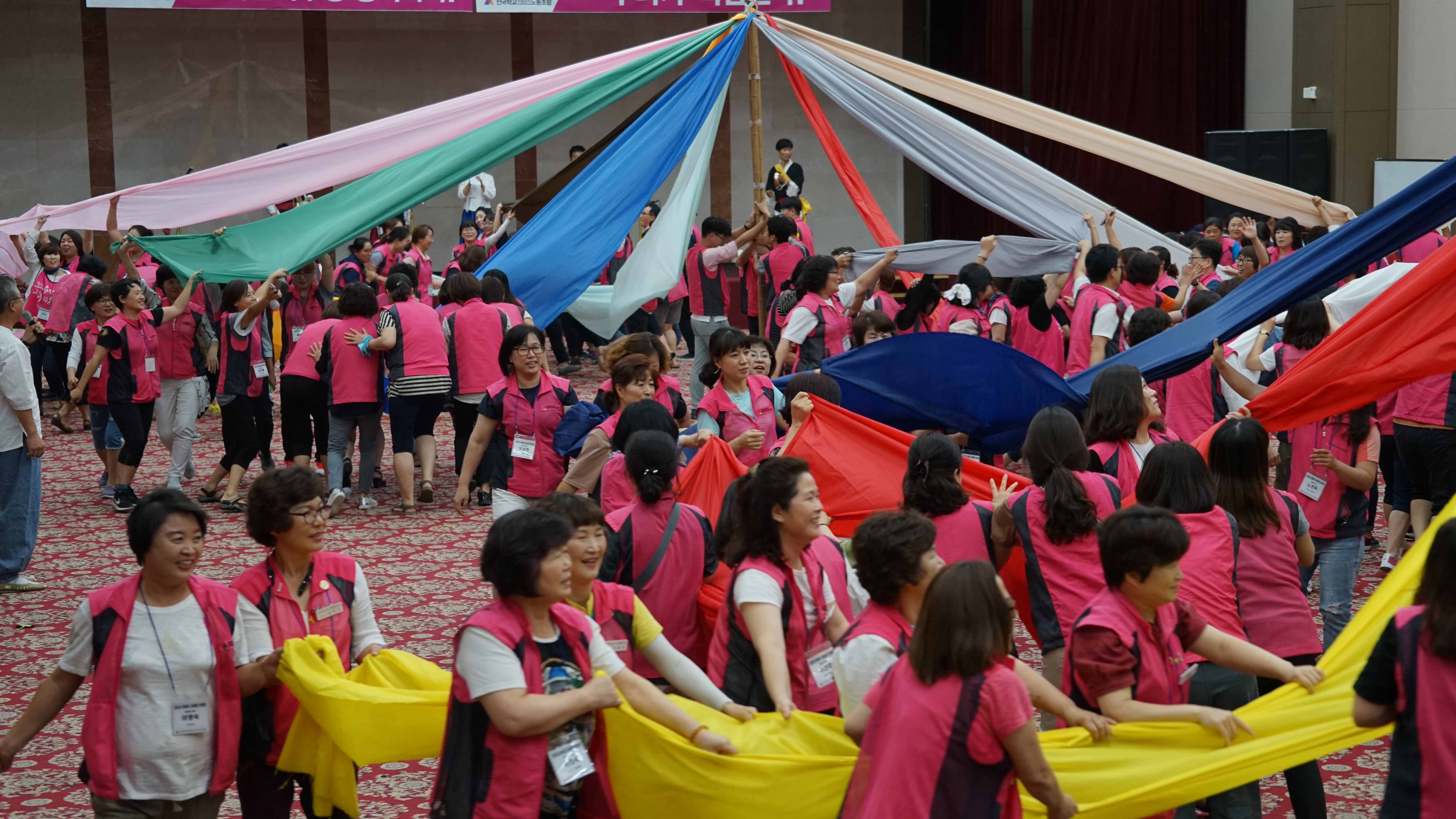 두가지 교육프로그램이 끝난 뒤, 이후 지회, 분과 운영에 관해서 4가지의 토론주제를 놓고 분임토론을 진행했습니다. 식사 후에는 컨벤션 홀로 옮겨 길쌈놀이와 강강수월래, 박터뜨리기 등 전통놀이를 진행했고, 많은 지회, 분과장 및 간부들이 시종일관 즐겁고 힘차게 참여하였습니다. 이후에는 뒤풀이 프로그램에서는 광주지부 김현성 조직국장의 진행하여 마지막 중집댄스타임까지 뜨거운 시간을 지회, 분과장들이 함께 하였습니다. 이튿 날에는 전날 교육프로그램과 분임토임을 진행한 토대로 각 지회, 분과의 결심을 적은 현수막을 모자이크하여 대형현수막을 만드는 상징의식으로 힘차게 마무리하였습니다.