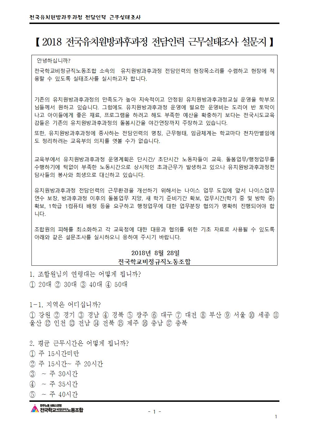 2018 전국유치원방과후과정 전담인력 근무실태조사로 환경개선 꼭 만들어내자!!!!