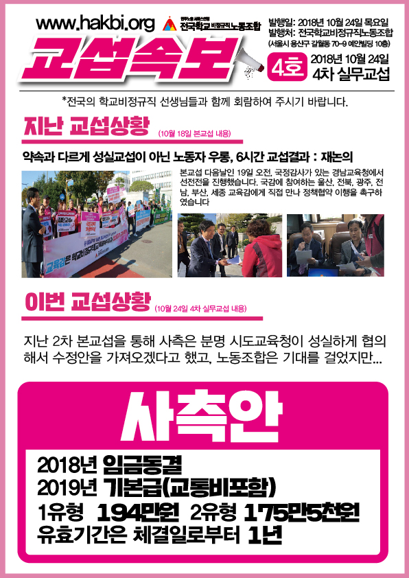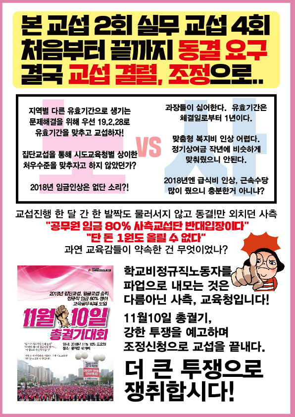 공무원 임금 80%, 단계적 임금 인상, 근속수당 인상 이거 다~ 거짓말이었습니까? 지금까지 사측과의 교섭중에서 가장 최악을 보여준 교섭위원들. 누가 이기나 해보자는 겁니까? 11월 10일 학교비정규직노동자 총궐기로 본때를 보여줄 때입니다.