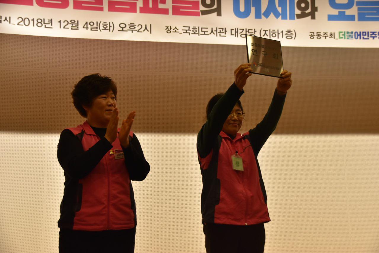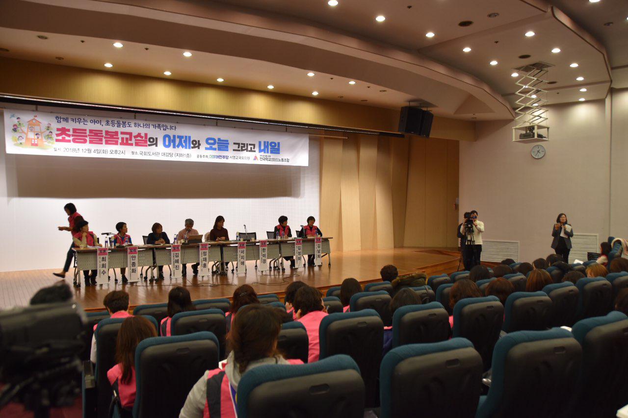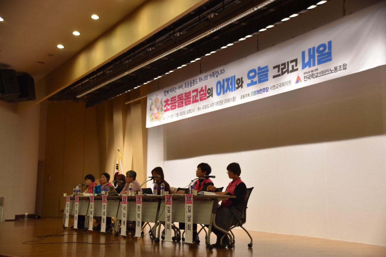 12월 4일 오후 2시. 전국학교비정규직노동조합, 서영교국회의원 주최로‘초등돌봄교실의 어제와 내일 그리고 내일’이라는 주제로 토론회가 열렸다. 고혜경수석부위원장, 서영교국회의원, 조승래국회의원 인사말에 이어 정재훈 서울여대 사회복지학과 교수의 사회로 토론회가 진행되었다.