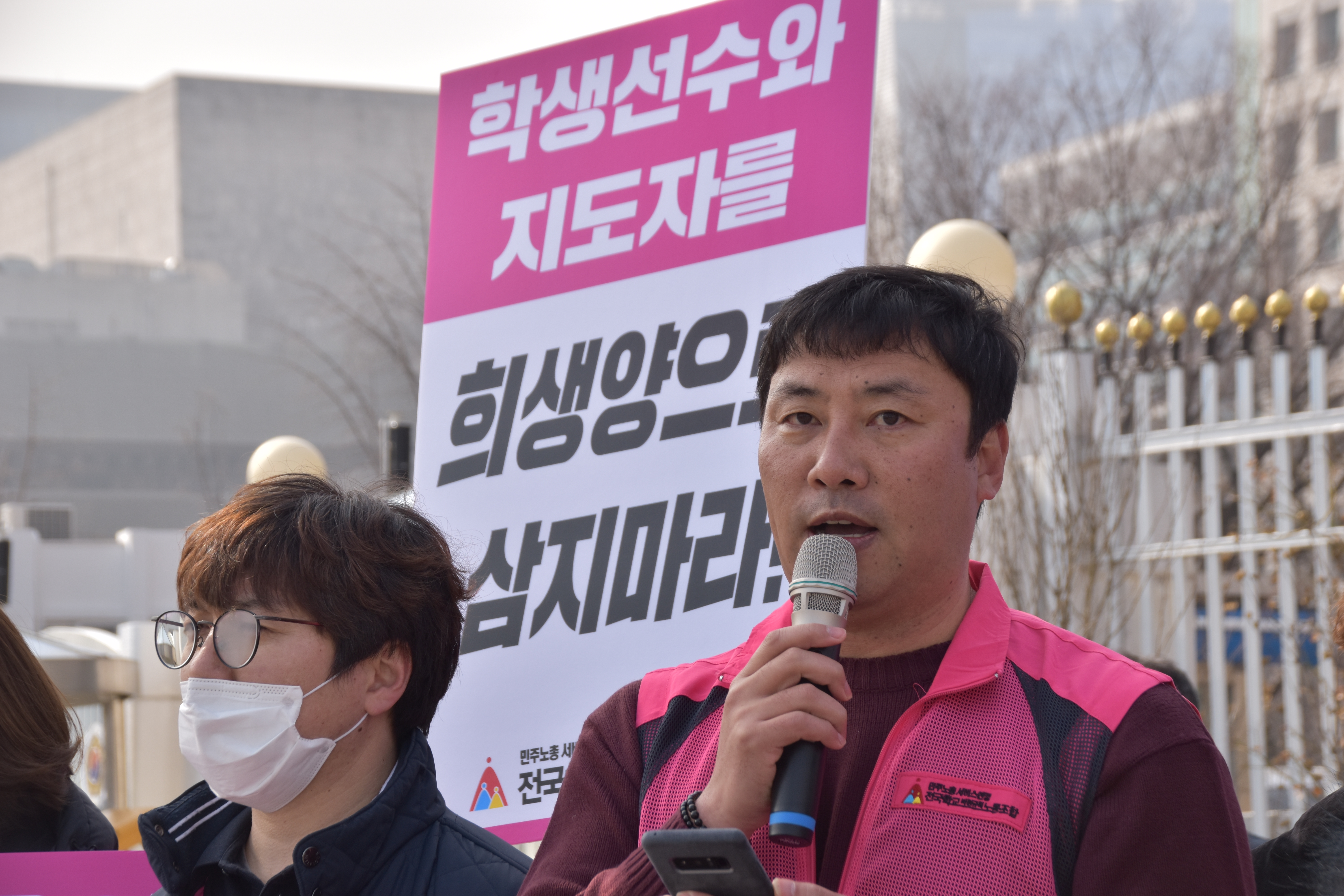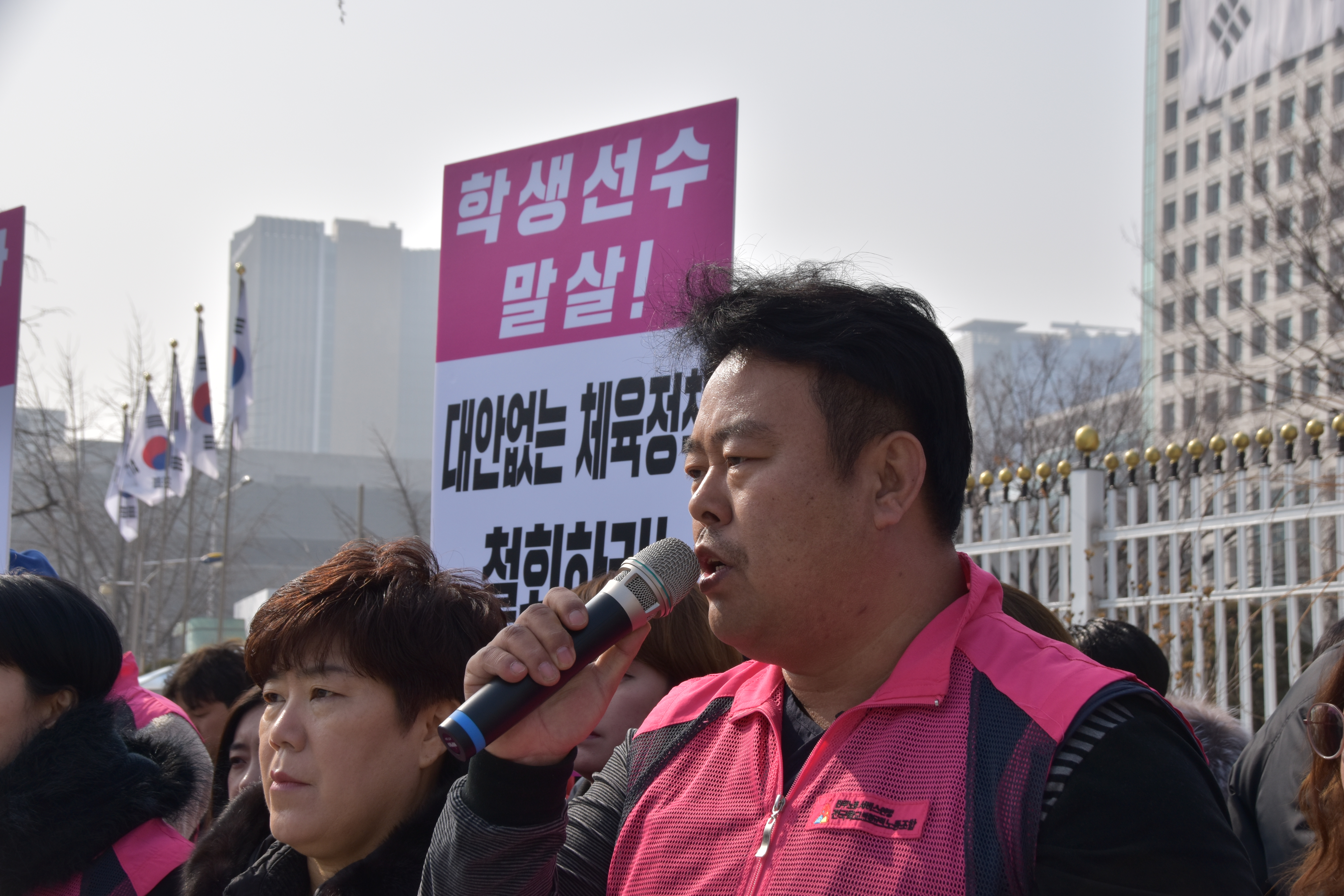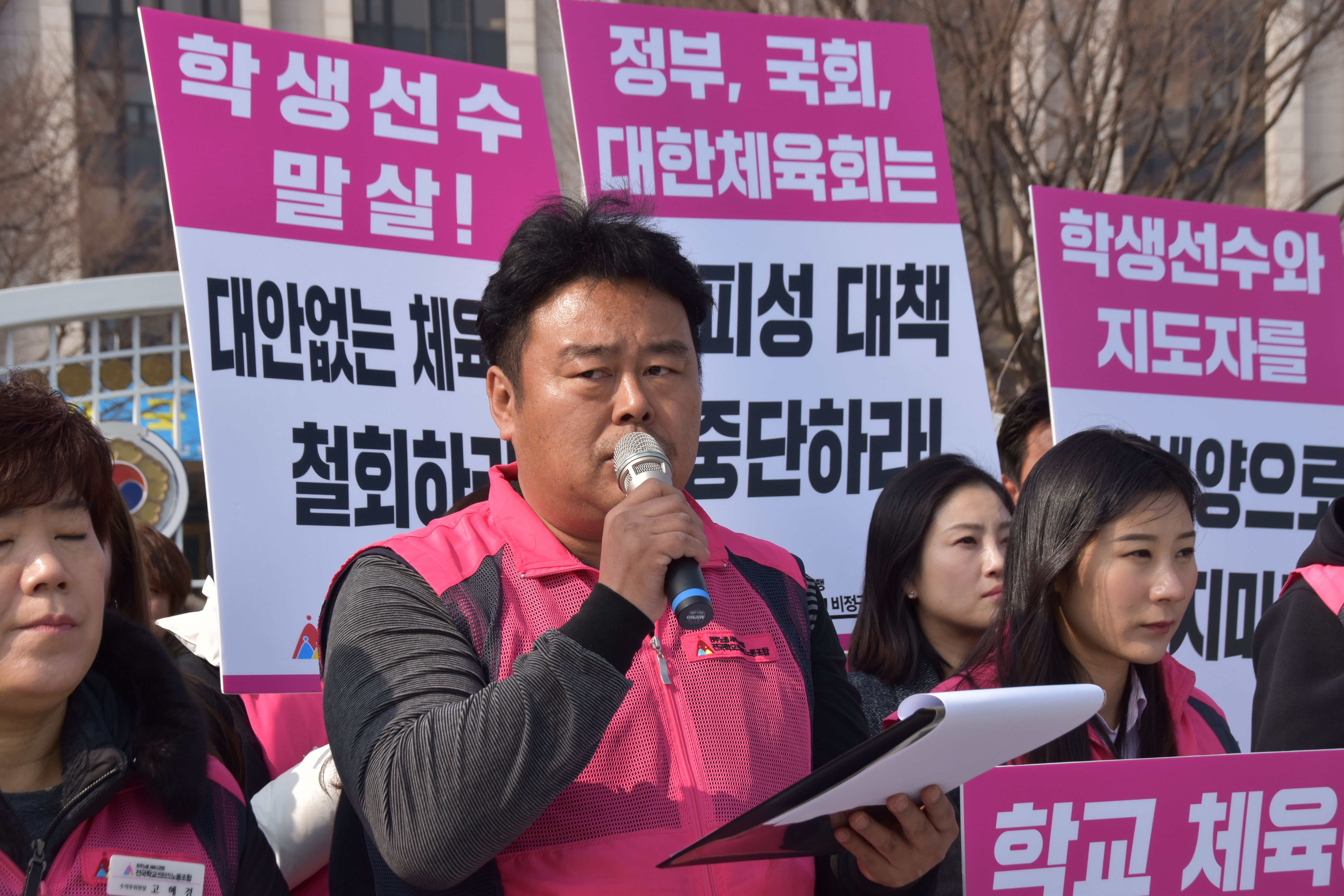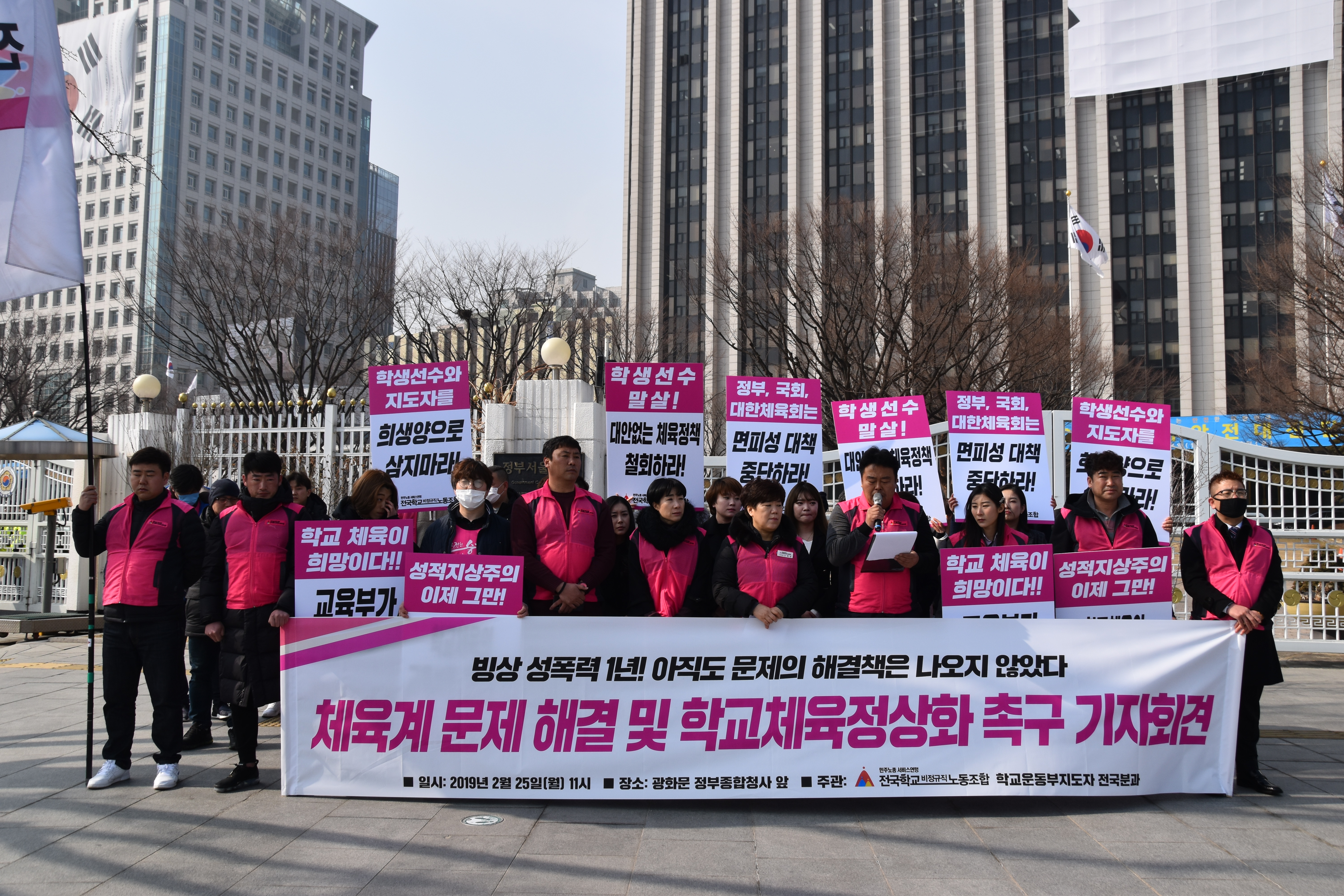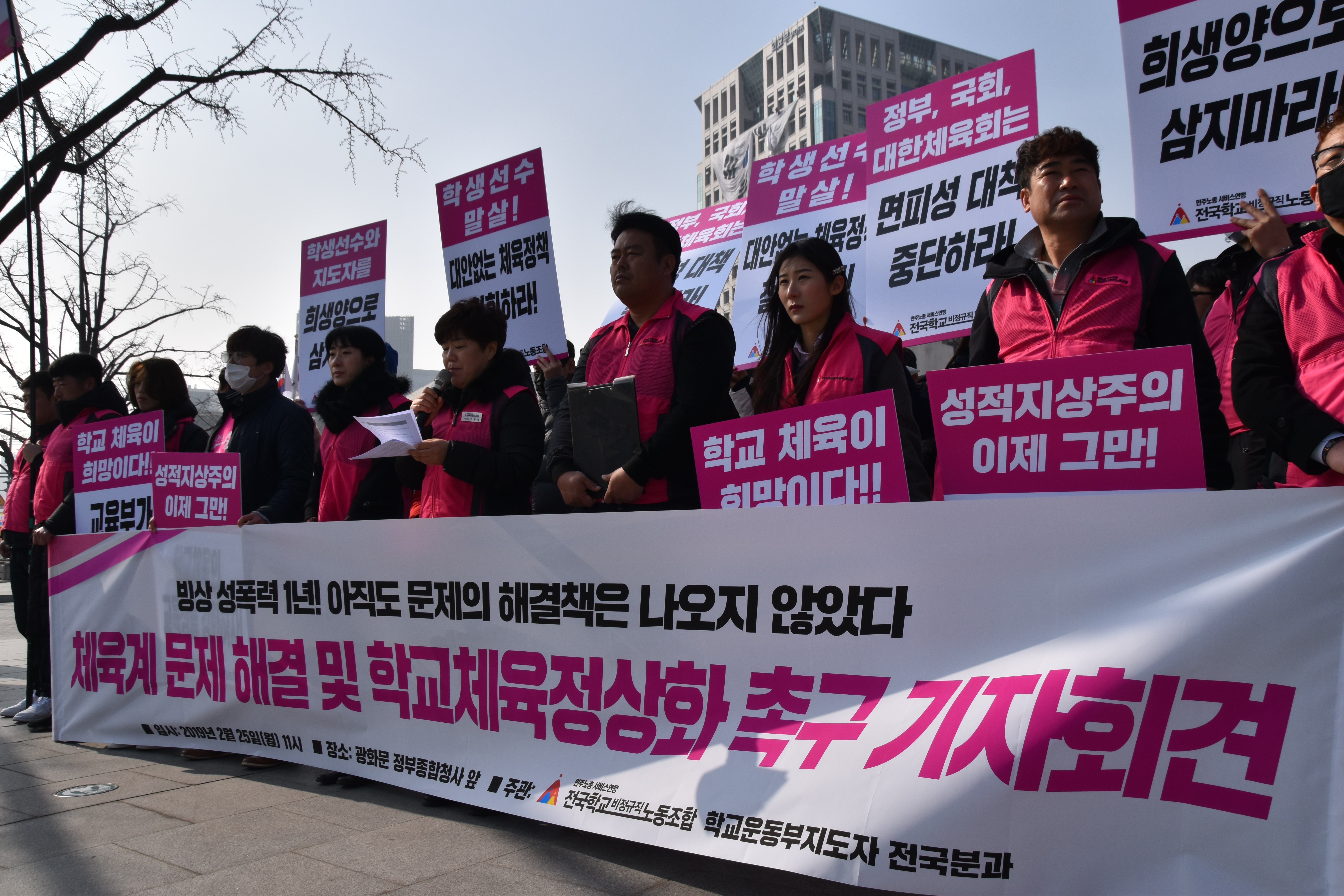 전국학교비정규직노동조합은 2019년 2월 25일 월요일 오전 “체육계 문제 해결 및 학교체육정상화 촉구” 기자회견을 진행하였다. 황성학 정책부장의 사회와 사회와 고혜경 수석부위원장의 여는 말에 이어 학교체육의 구조적 한계와 문제점, 현장에 만연해있는 성적지상주의와 학교운동부지도자들의 고용불안에 대한 당사자 발언이 있었다.