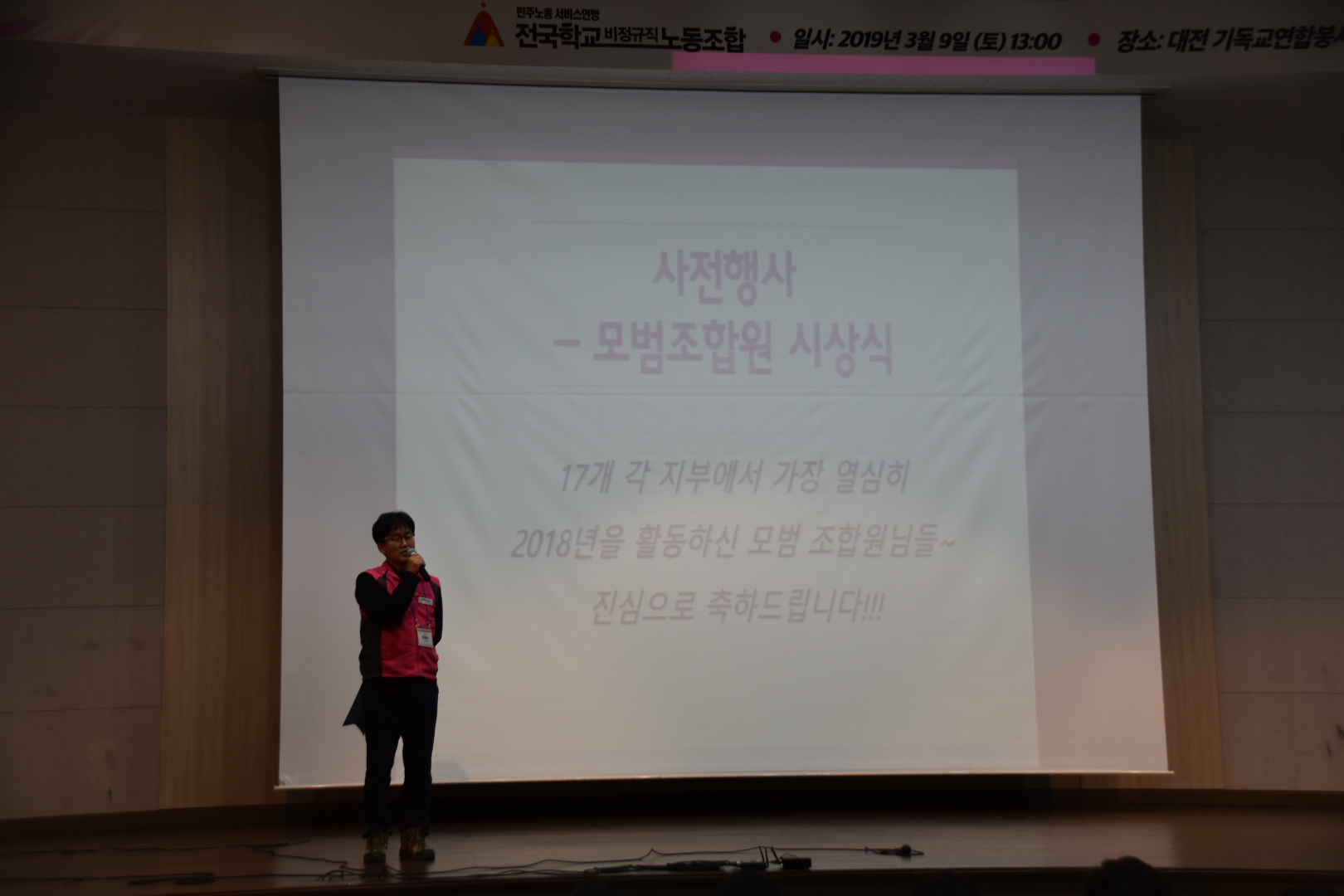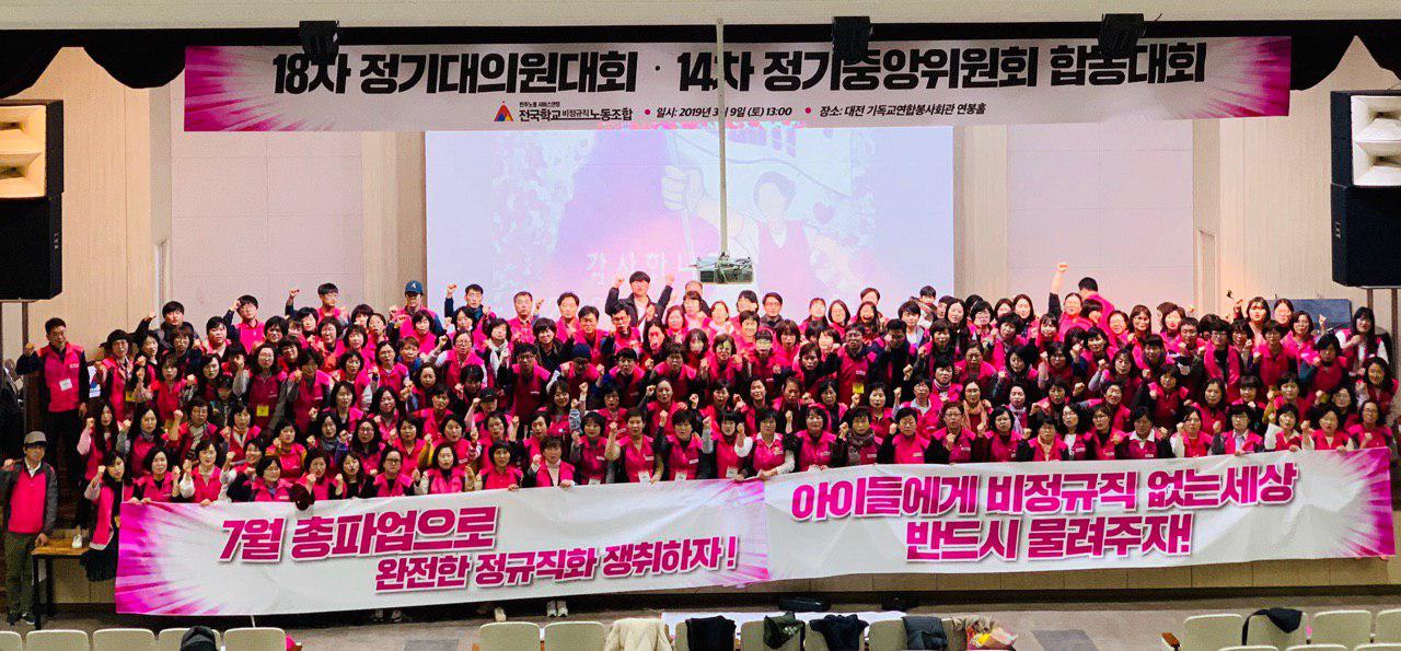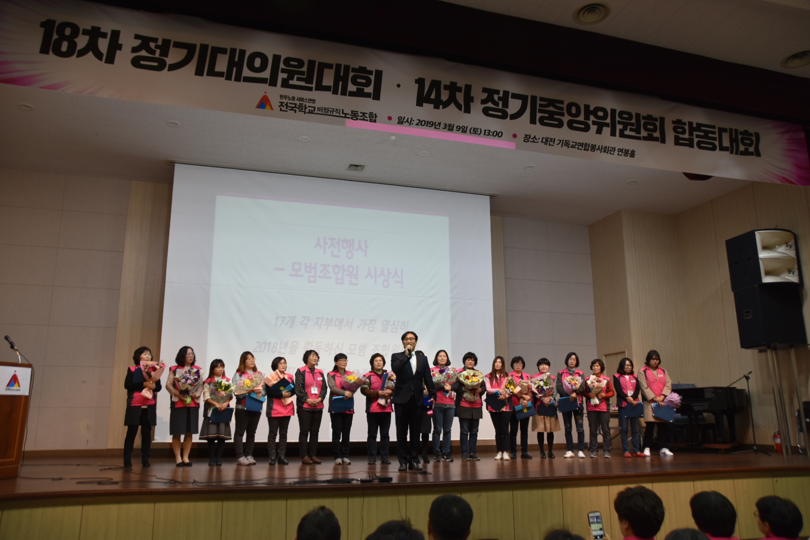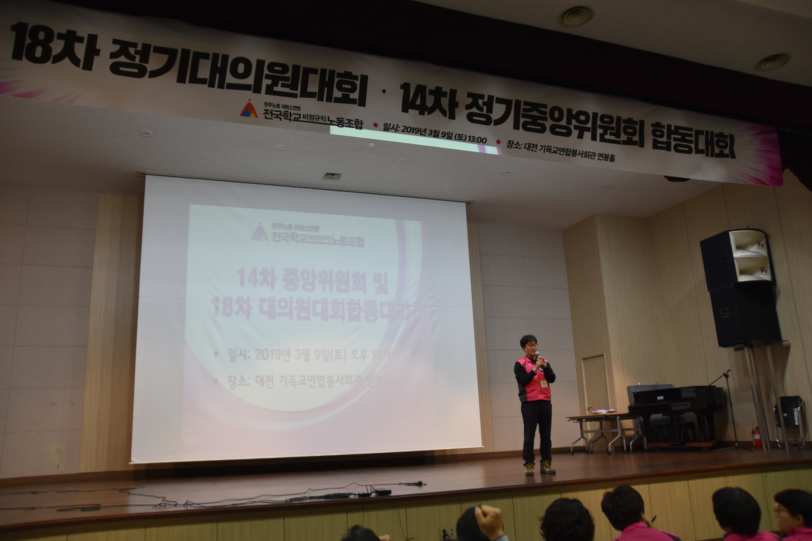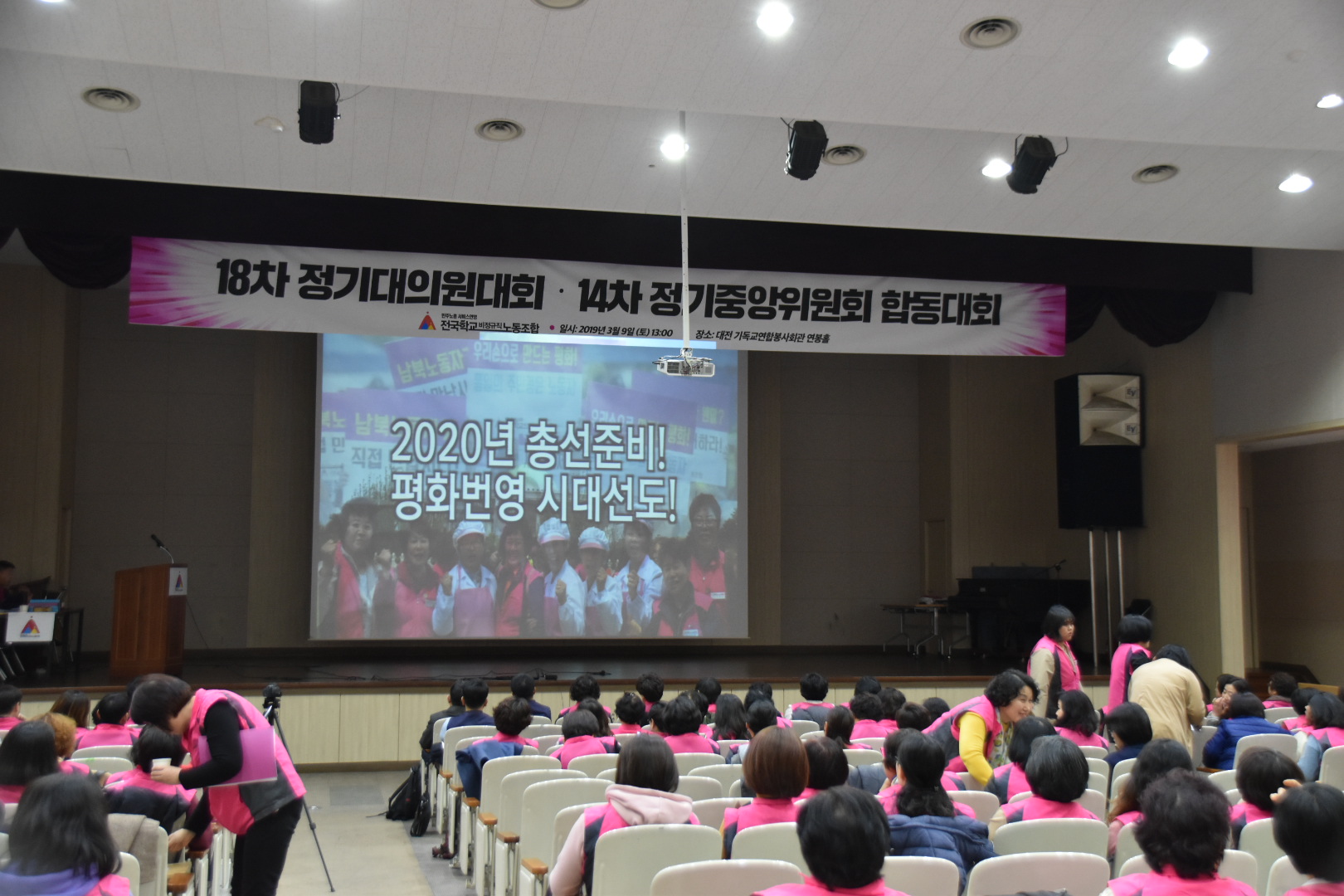 2019년 18차 정기대의원대회 및 14차 정기중앙위원회를 대전기독교연합봉사회관에서 토요일 1시에 진행했다. 학비노조 전국의 대의원, 중앙위원들은 민태호 사무처장의 2018년 사업평가와 박정호 정책실장의 2019년 사업계획에 대한 발제를 듣고 2018년 사업평가와 2019년 사업계획을 심의 채택하였다. 대의원대회는 모범조합원 시상식과 함께 힘있게 진행되었다.