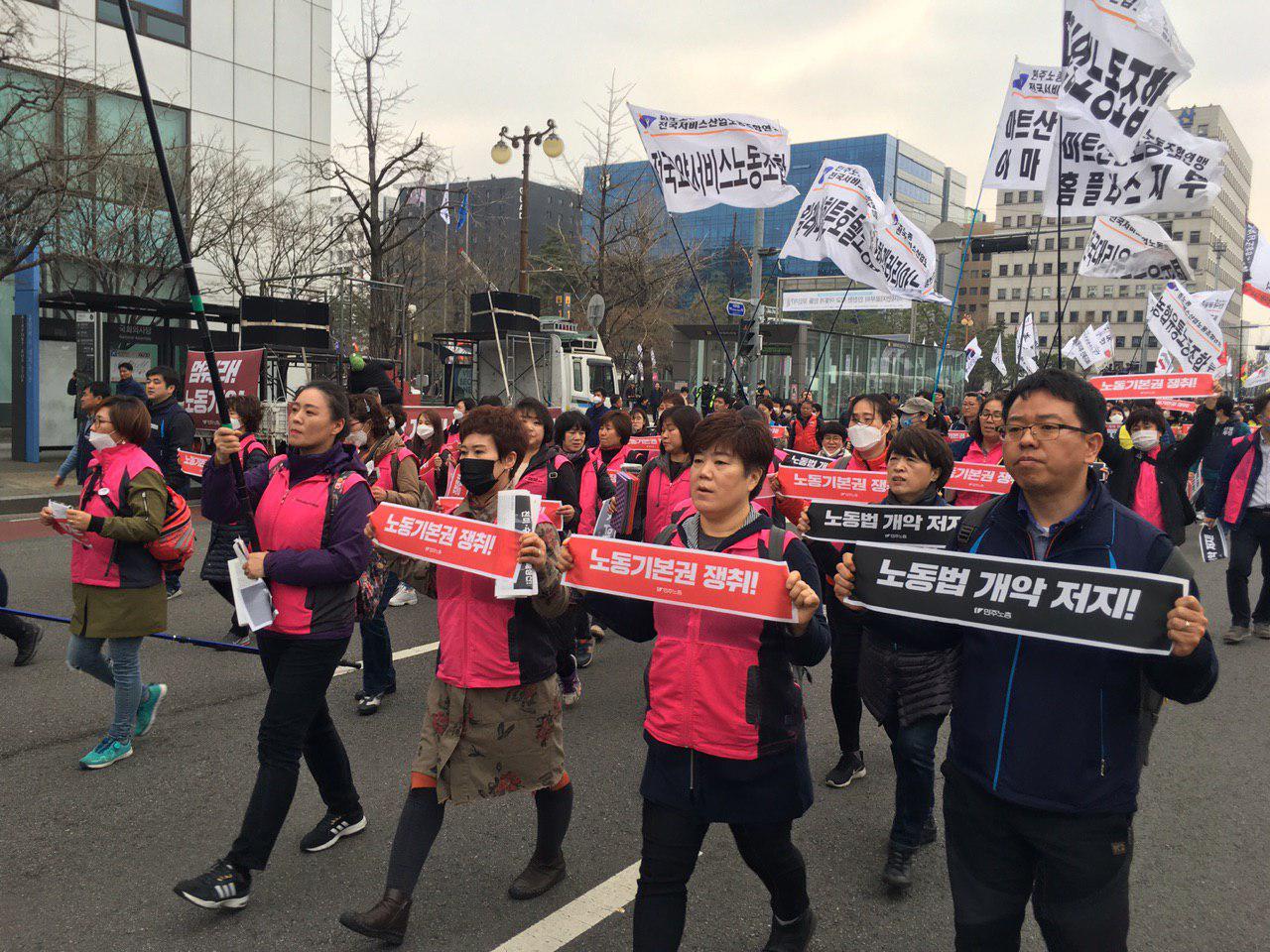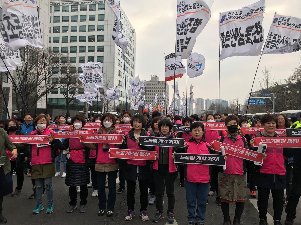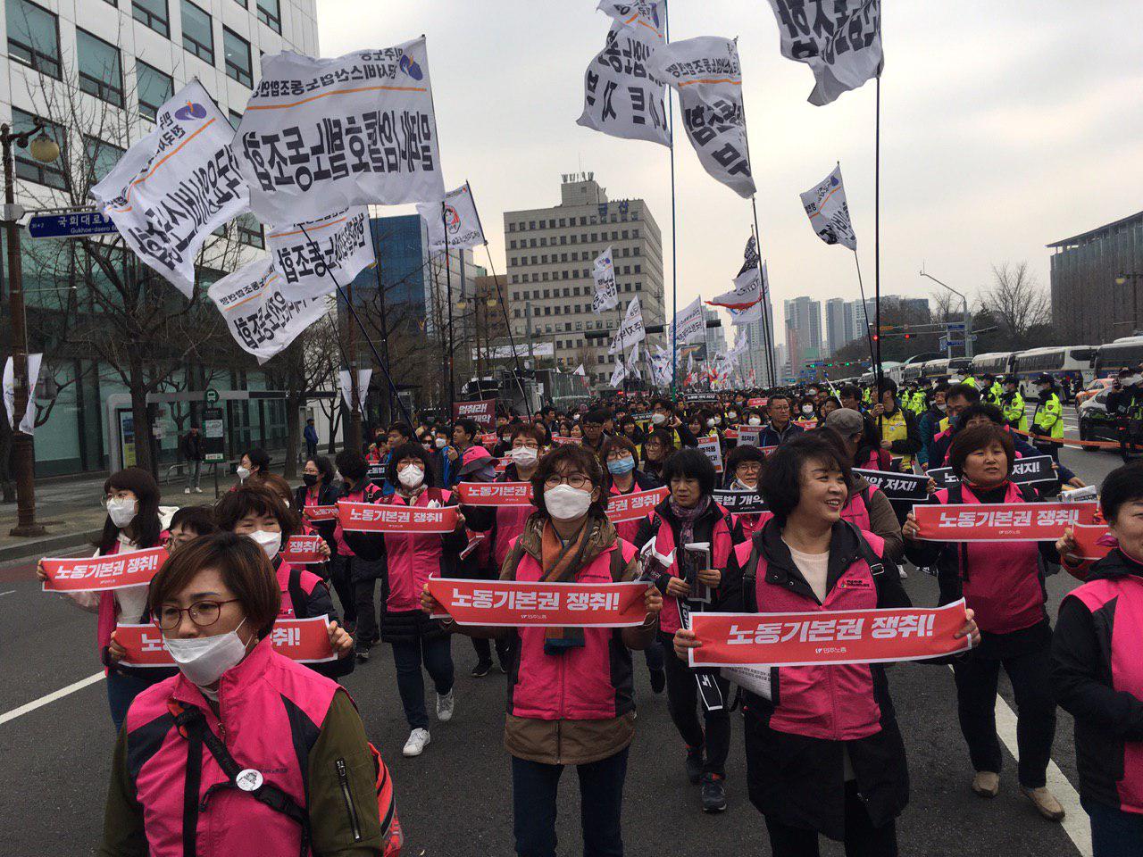 학비노조는 27일 여의도 국회 앞에서 1만 여명의 참가자들이 모인 가운데 ‘ILO 핵심협약 비준과 노동기본권 쟁취, 비정규직철폐, 제주영리병원 저지, 산업정책 일방강행 저지’를 위한 전국노동자대회를 열고 노동개악 중단과 ILO 핵심협약 비준을 촉구했다.