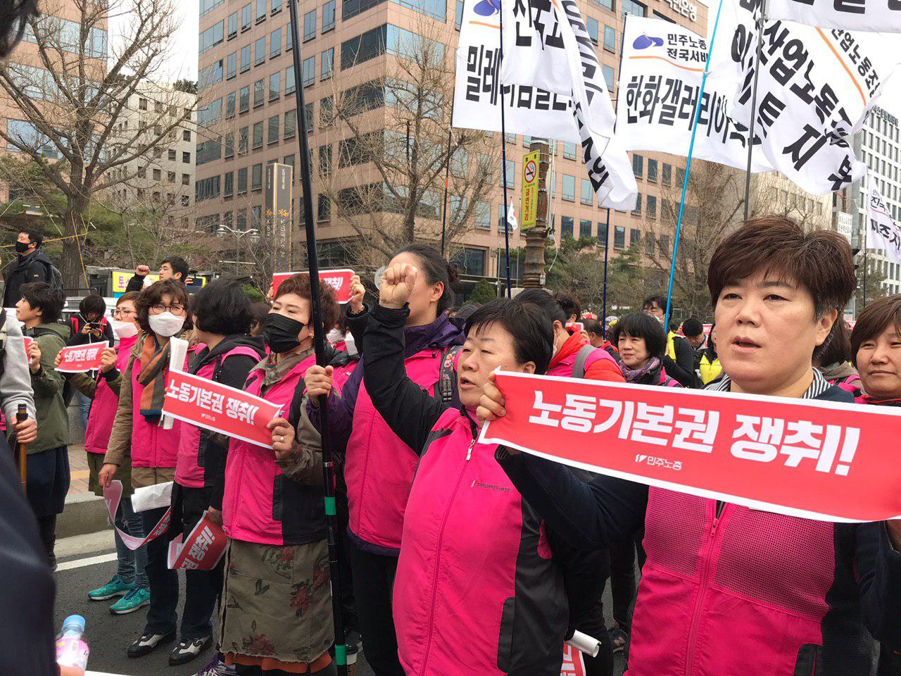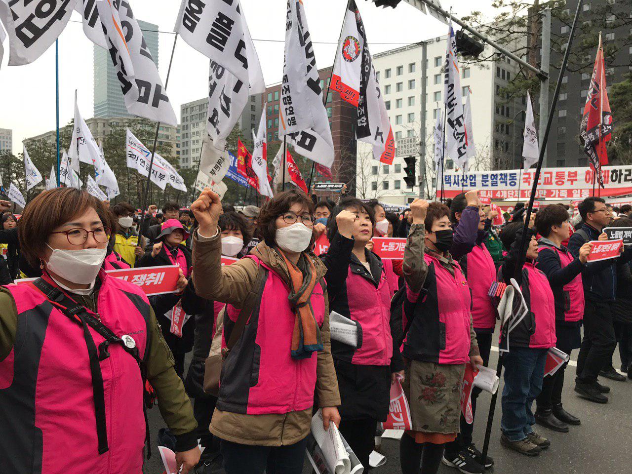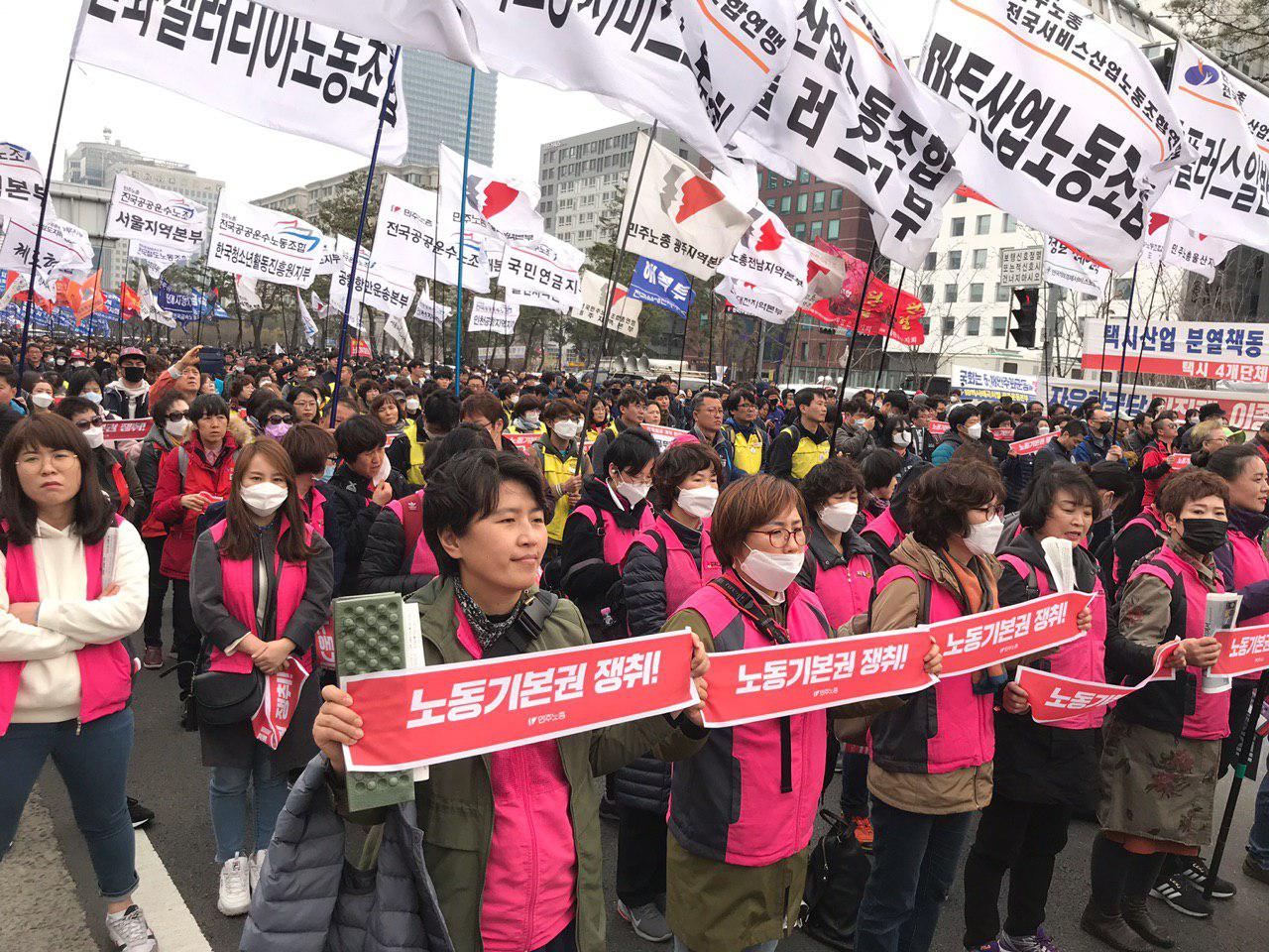 학비노조는 27일 여의도 국회 앞에서 1만 여명의 참가자들이 모인 가운데 ‘ILO 핵심협약 비준과 노동기본권 쟁취, 비정규직철폐, 제주영리병원 저지, 산업정책 일방강행 저지’를 위한 전국노동자대회를 열고 노동개악 중단과 ILO 핵심협약 비준을 촉구했다.