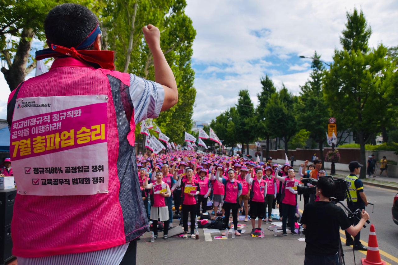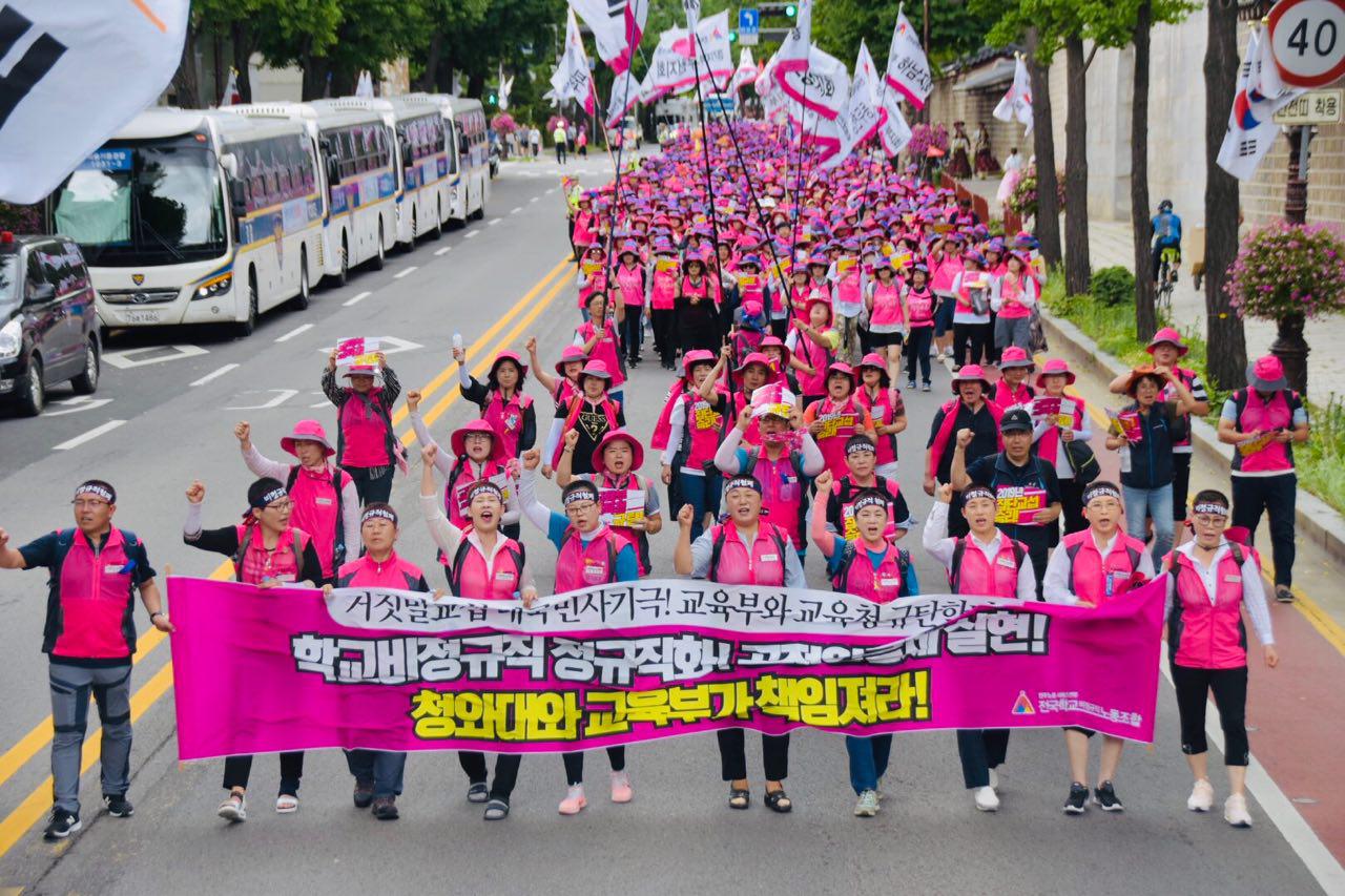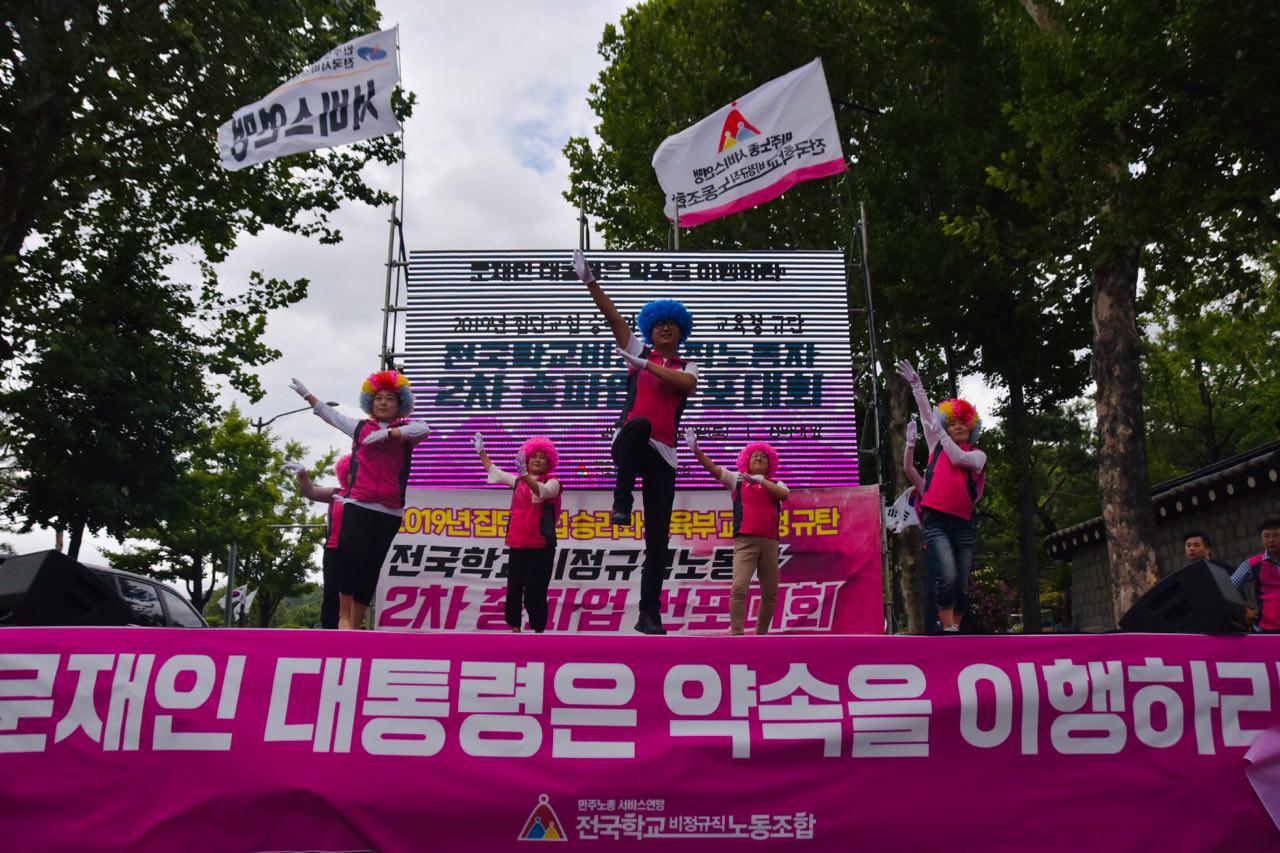 전국학교비정규직노동조합은 청와대 앞에 2,500여 조합원이 모인 가운데 문재인 대통령의 공정임금제 약속이행을 촉구하며 “2019집단교섭 승리와 교육부·교육청 규탄! 전국학교비정규직노동자 2차 총파업 선포대회”를 열고 ‘2차 총파업’의 결의를 다졌다.