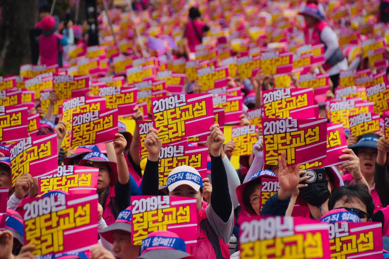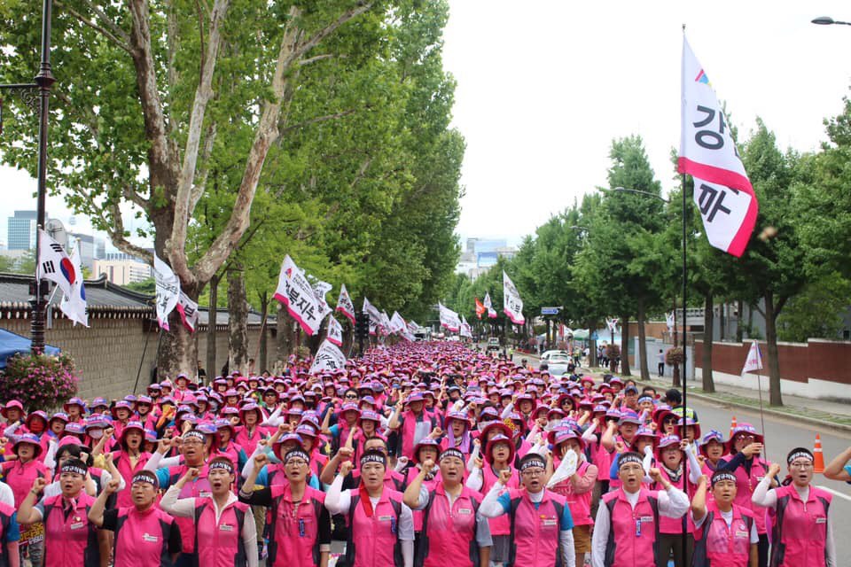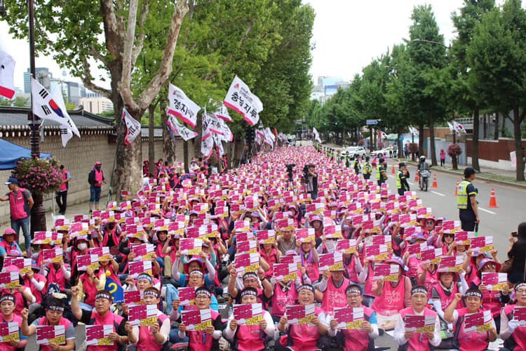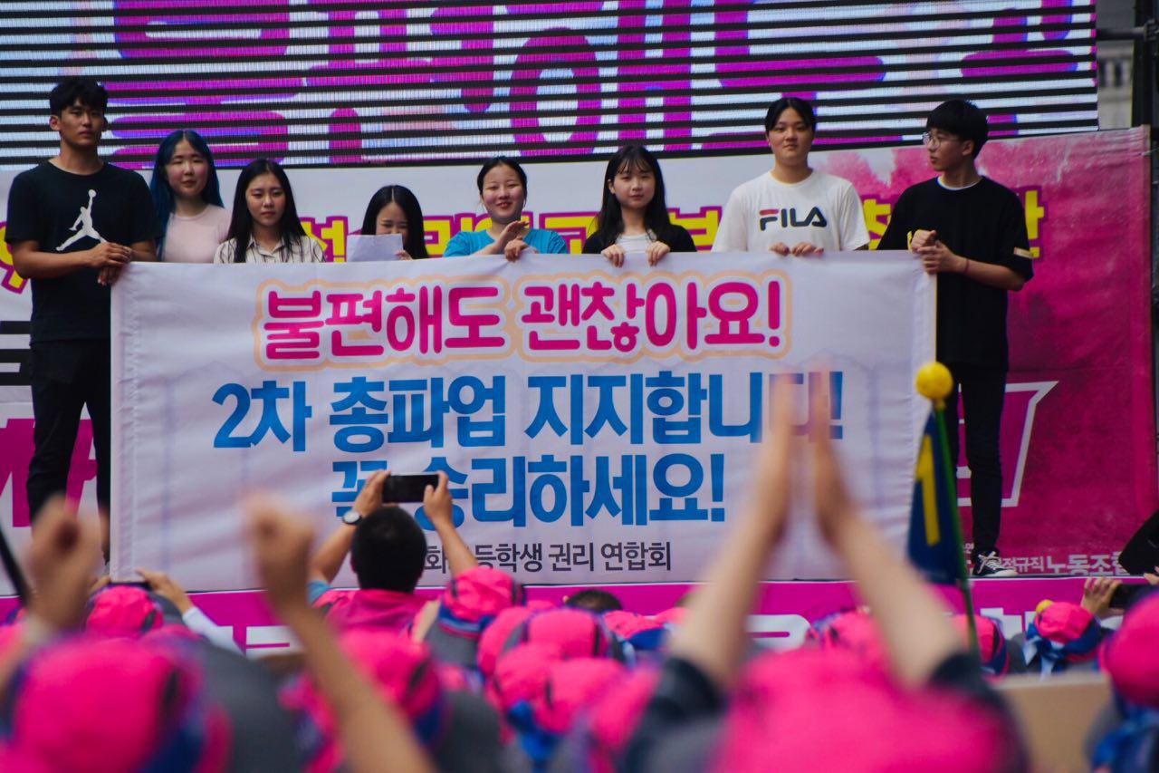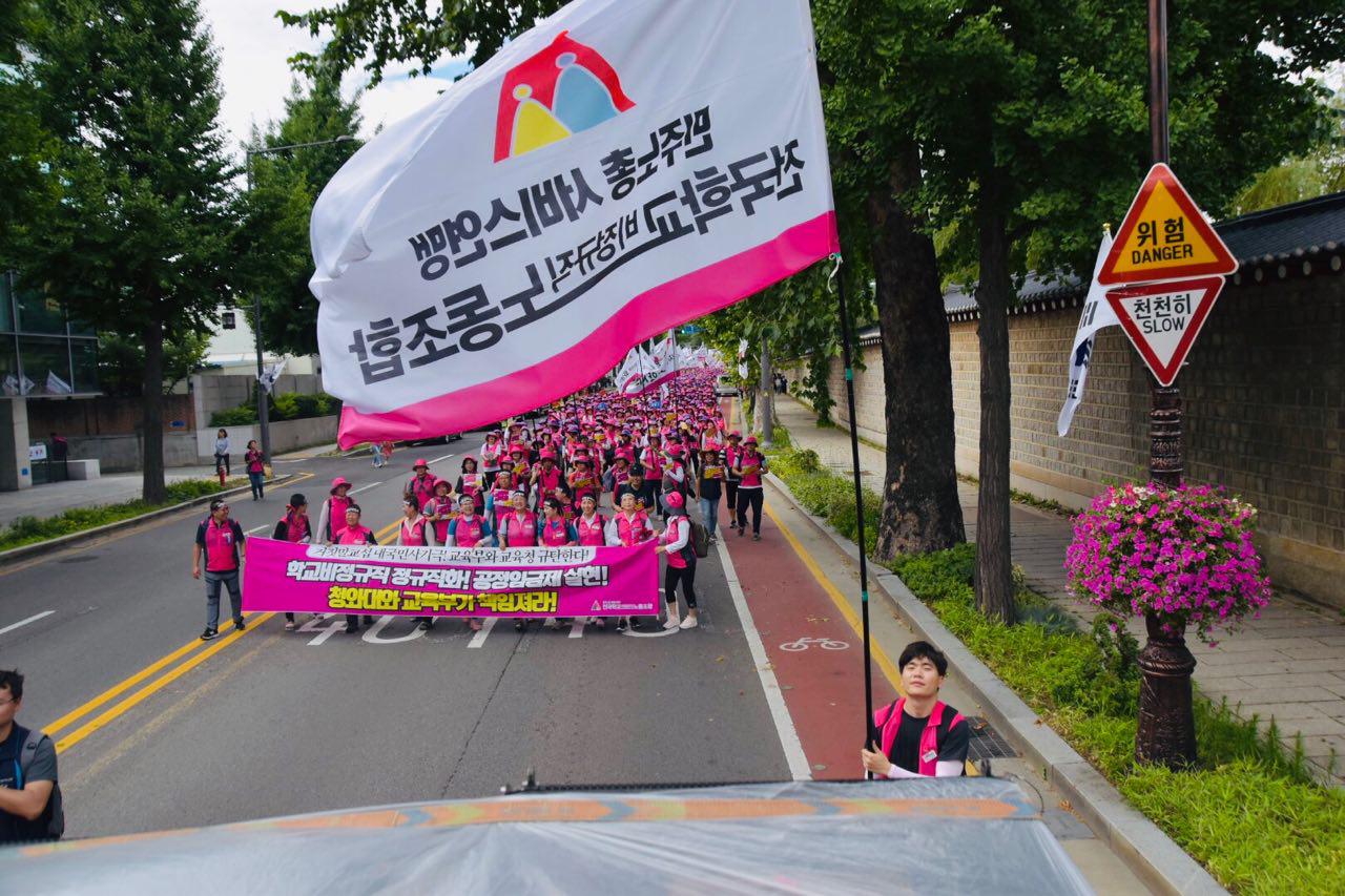 전국학교비정규직노동조합은 청와대 앞에 2,500여 조합원이 모인 가운데 문재인 대통령의 공정임금제 약속이행을 촉구하며 “2019집단교섭 승리와 교육부·교육청 규탄! 전국학교비정규직노동자 2차 총파업 선포대회”를 열고 ‘2차 총파업’의 결의를 다졌다.