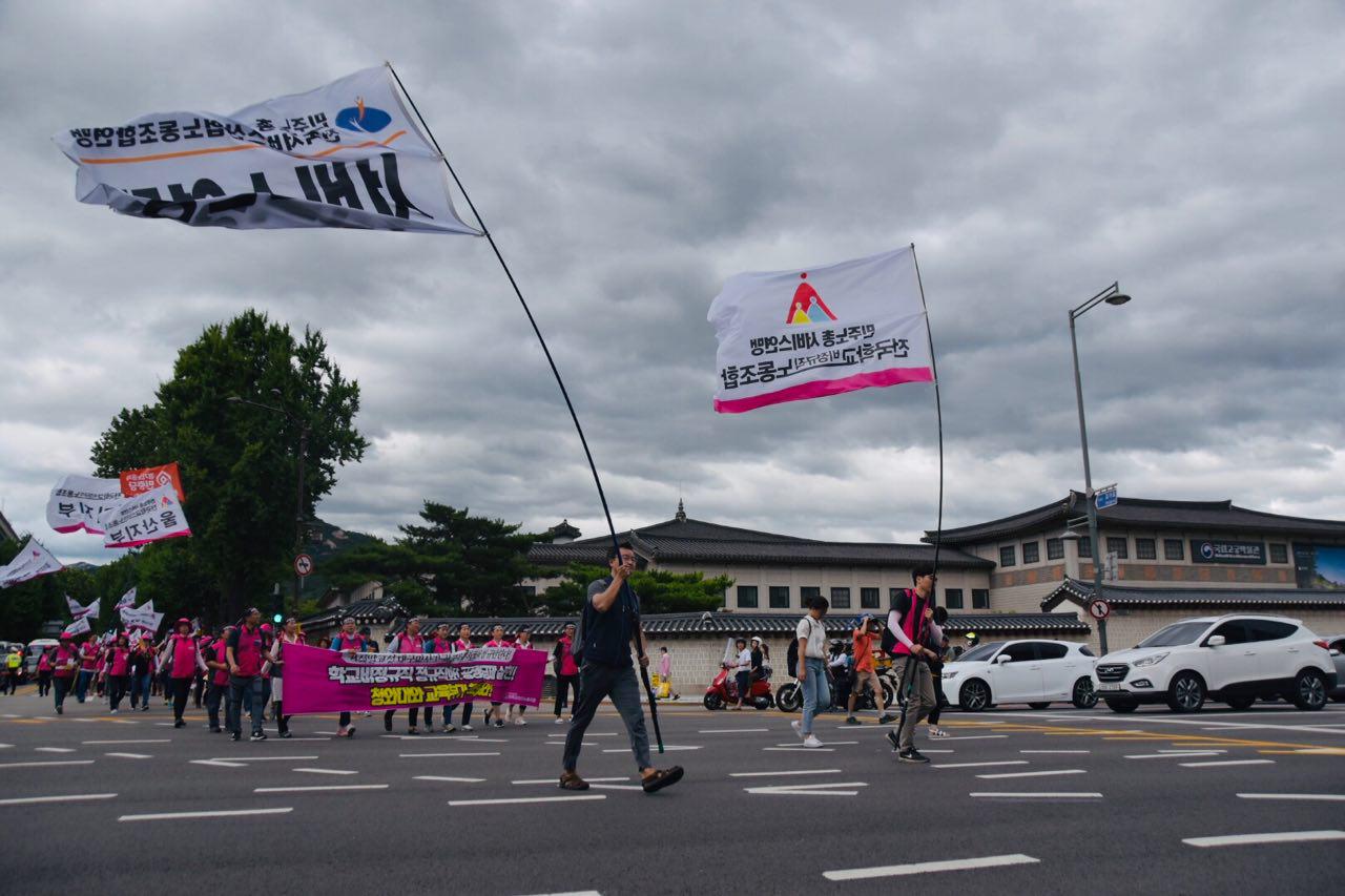 참가자들은 ‘비정규직·산업재해·차별임금’ 이라고 쓰인 대형 천을 함께 찢는 퍼포먼스를 벌였다. 박금자 위원장이 2차 총파업을 선포하며 광화문광장까지 행진을 이어갔다.