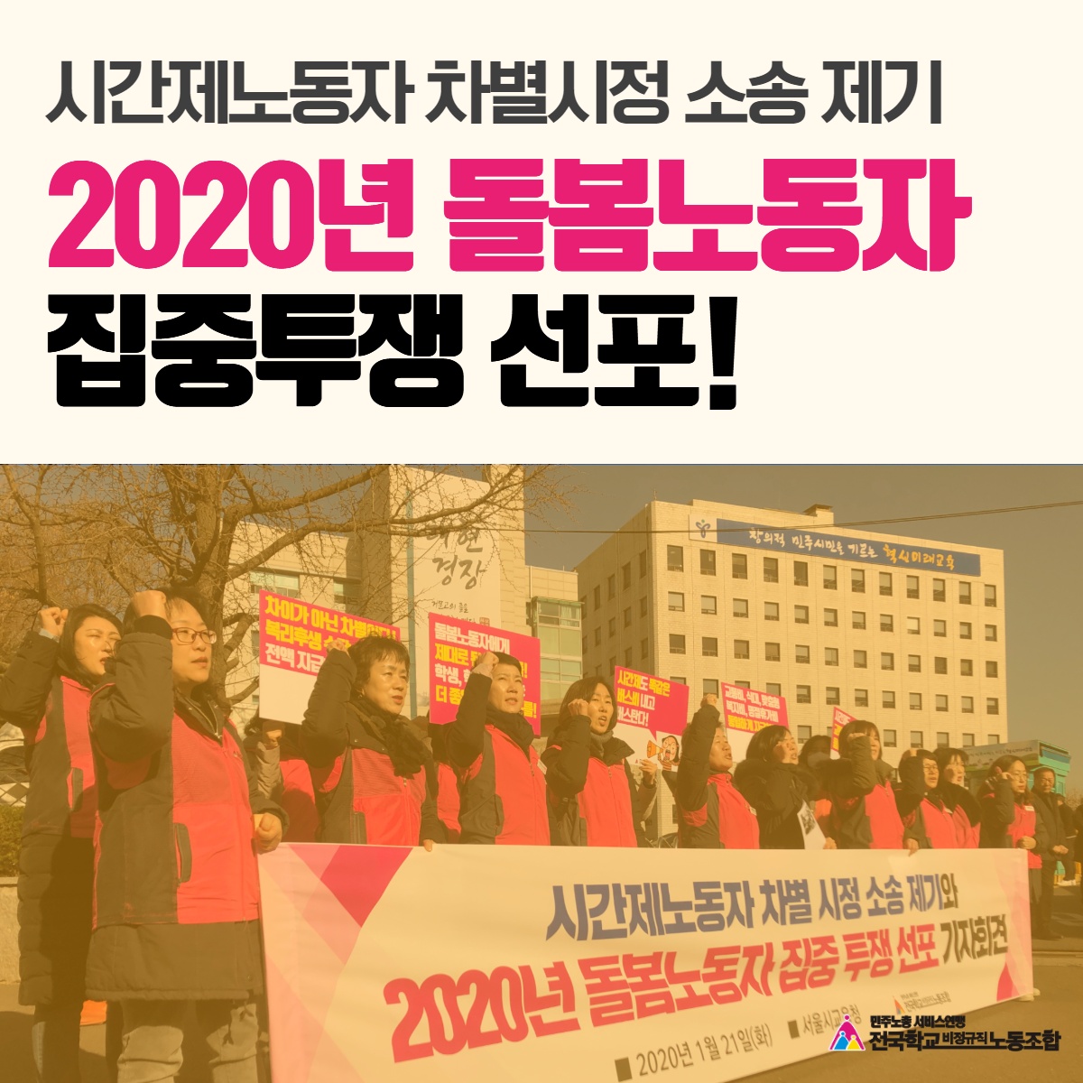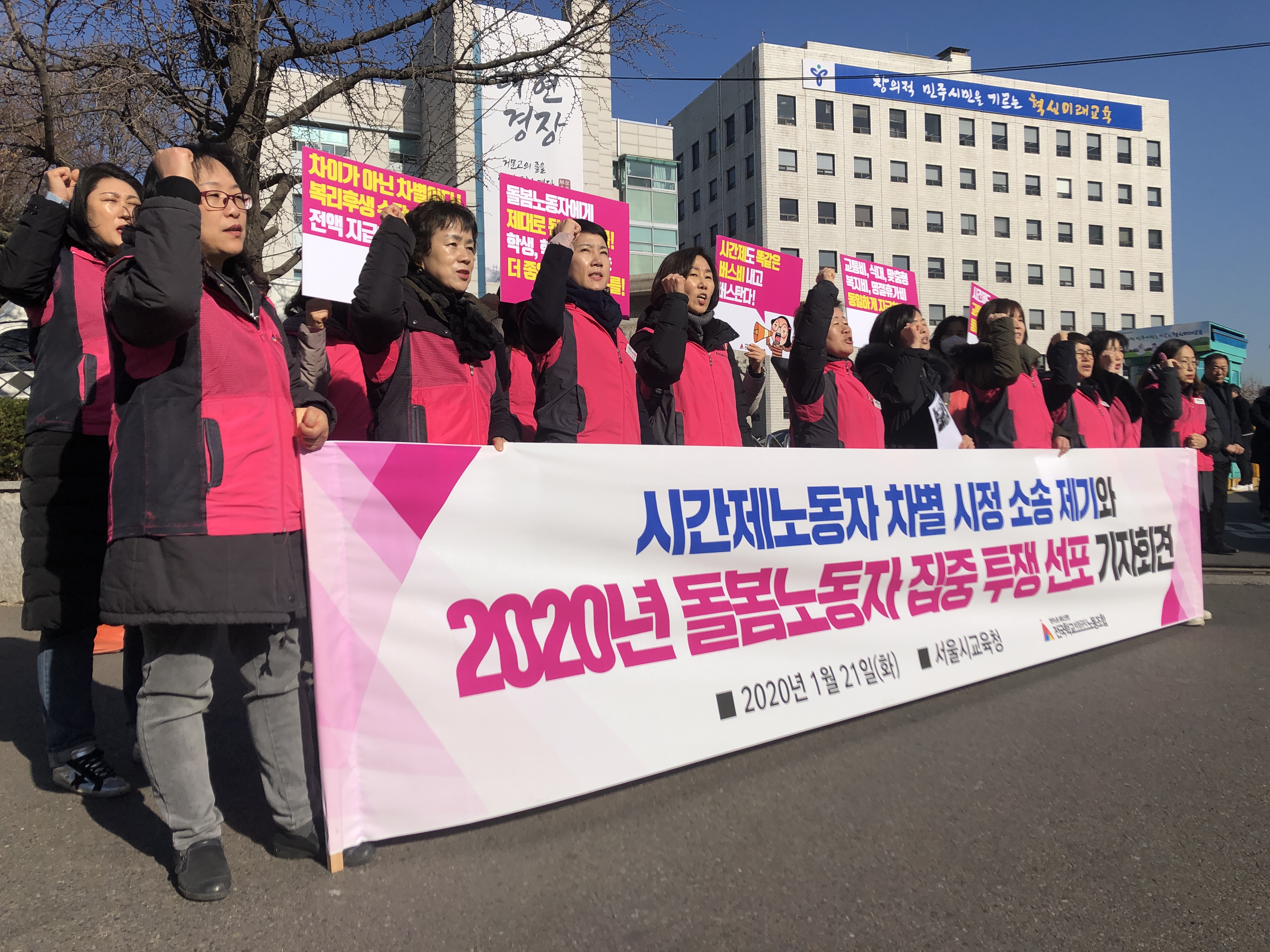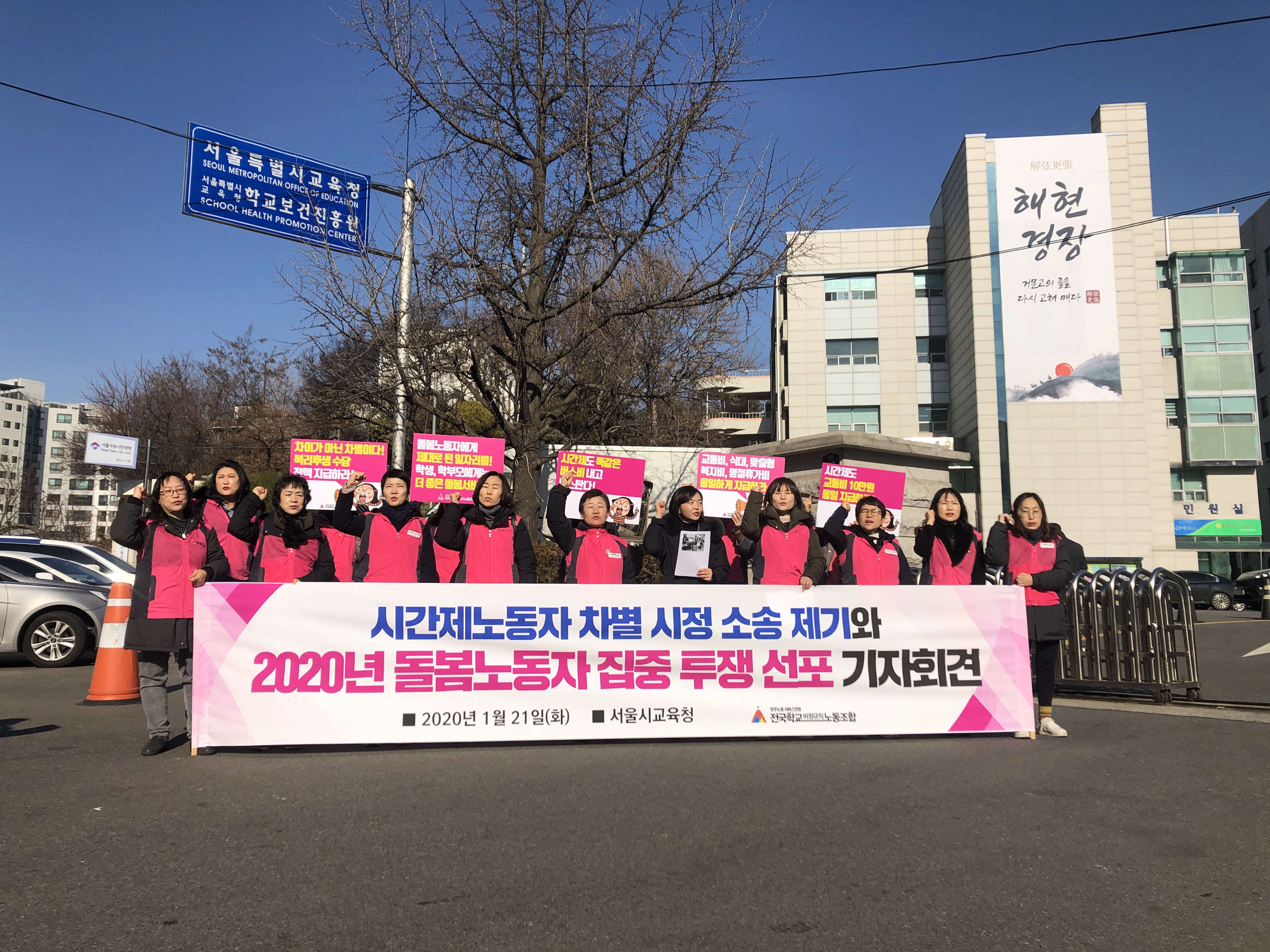 전국학교비정규직노동조합은 오늘 서울교육청 앞에서 기자회견을 열고, 2020년 전국학교비정규직노동조합 돌봄노동자들이 집중 투쟁을 선포하였다. 또한 시간제노동자들의 교통비 비례지급 등 차별시정을 요구하는 소송을 제기하였다.
