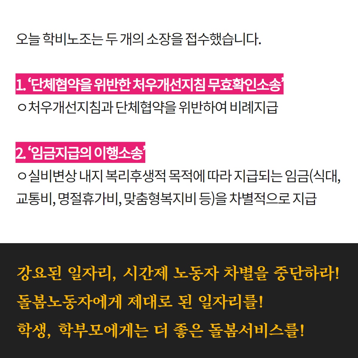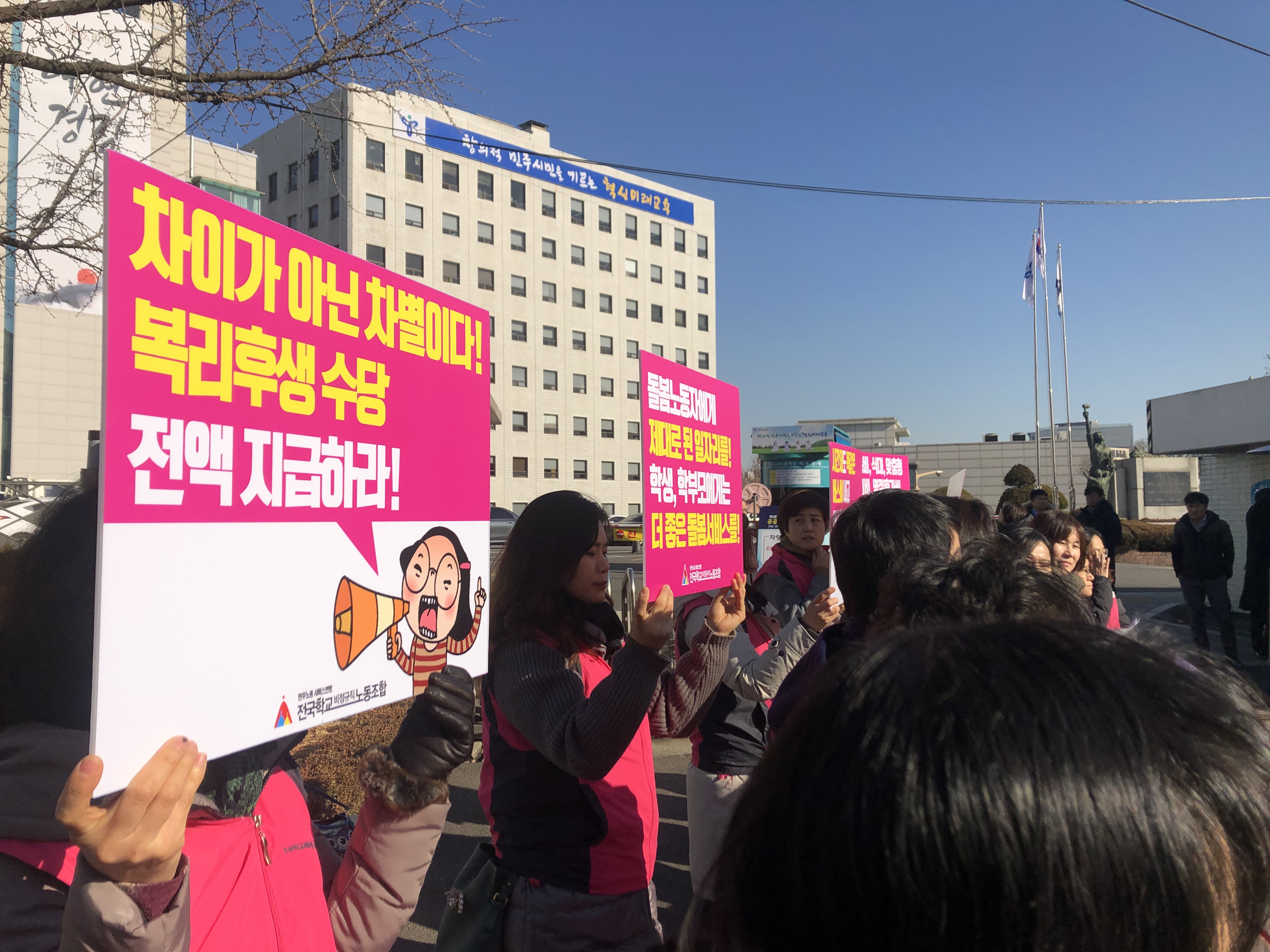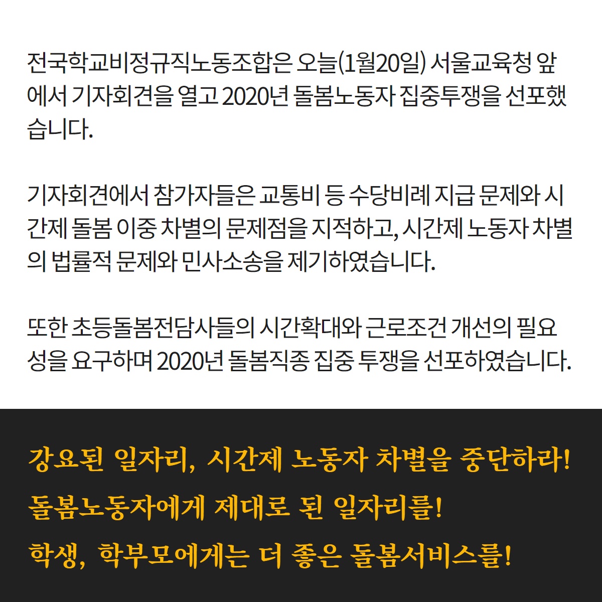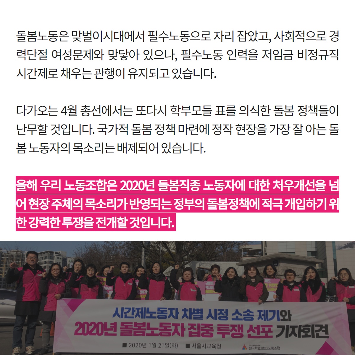 전국학교비정규직노동조합은 오늘 서울교육청 앞에서 기자회견을 열고, 2020년 전국학교비정규직노동조합 돌봄노동자들이 집중 투쟁을 선포하였다. 또한 시간제노동자들의 교통비 비례지급 등 차별시정을 요구하는 소송을 제기하였다.