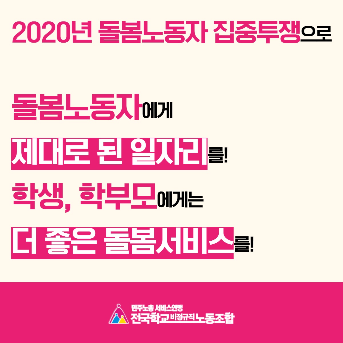올해 우리 노동조합은 2020년 돌봄직종 노동자에 대한 처우개선을 넘어 현장 주체의 목소리가 반영되는 정부의 돌봄정책에 적극 개입하기 위한 강력한 투쟁을 전개할 것이다.