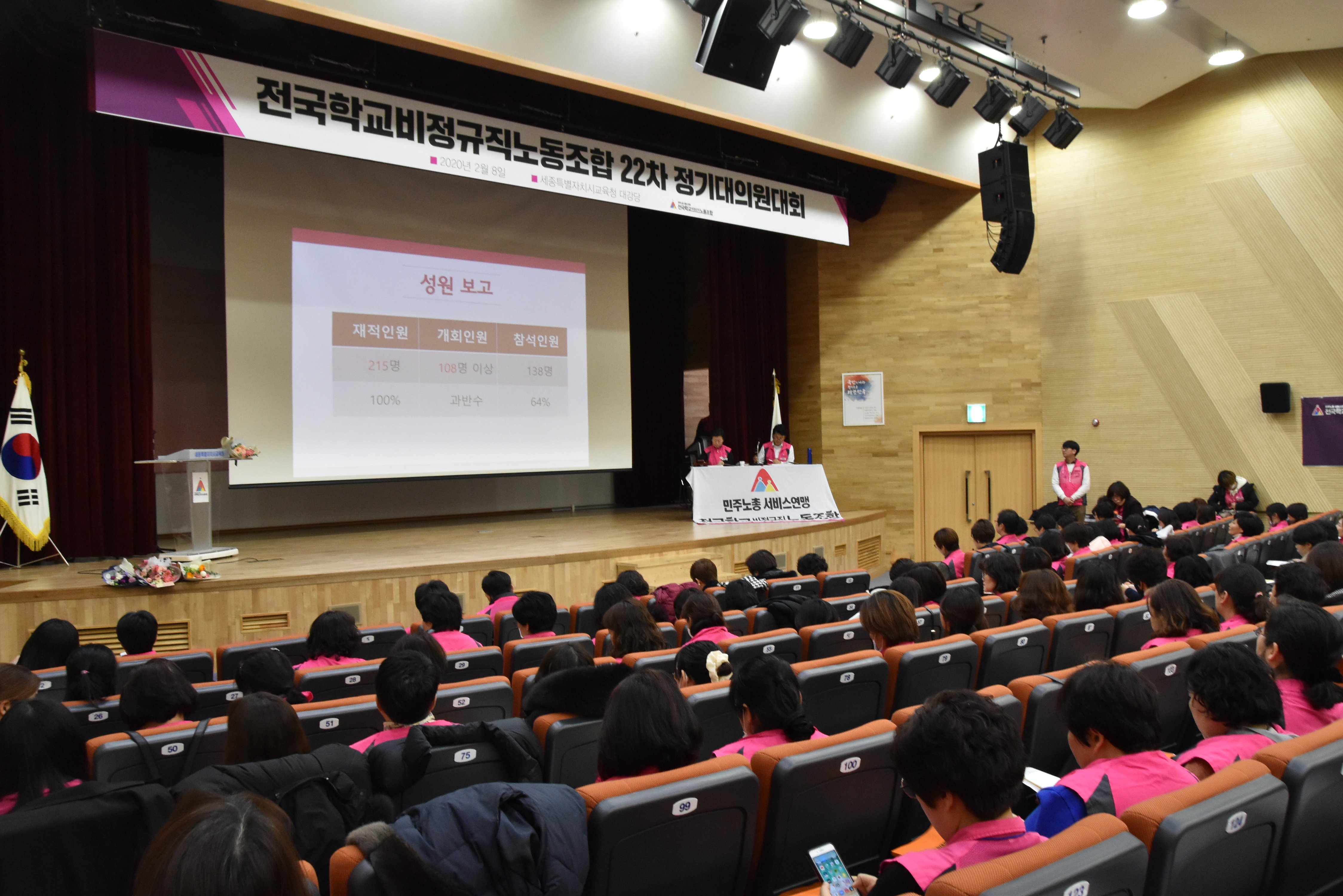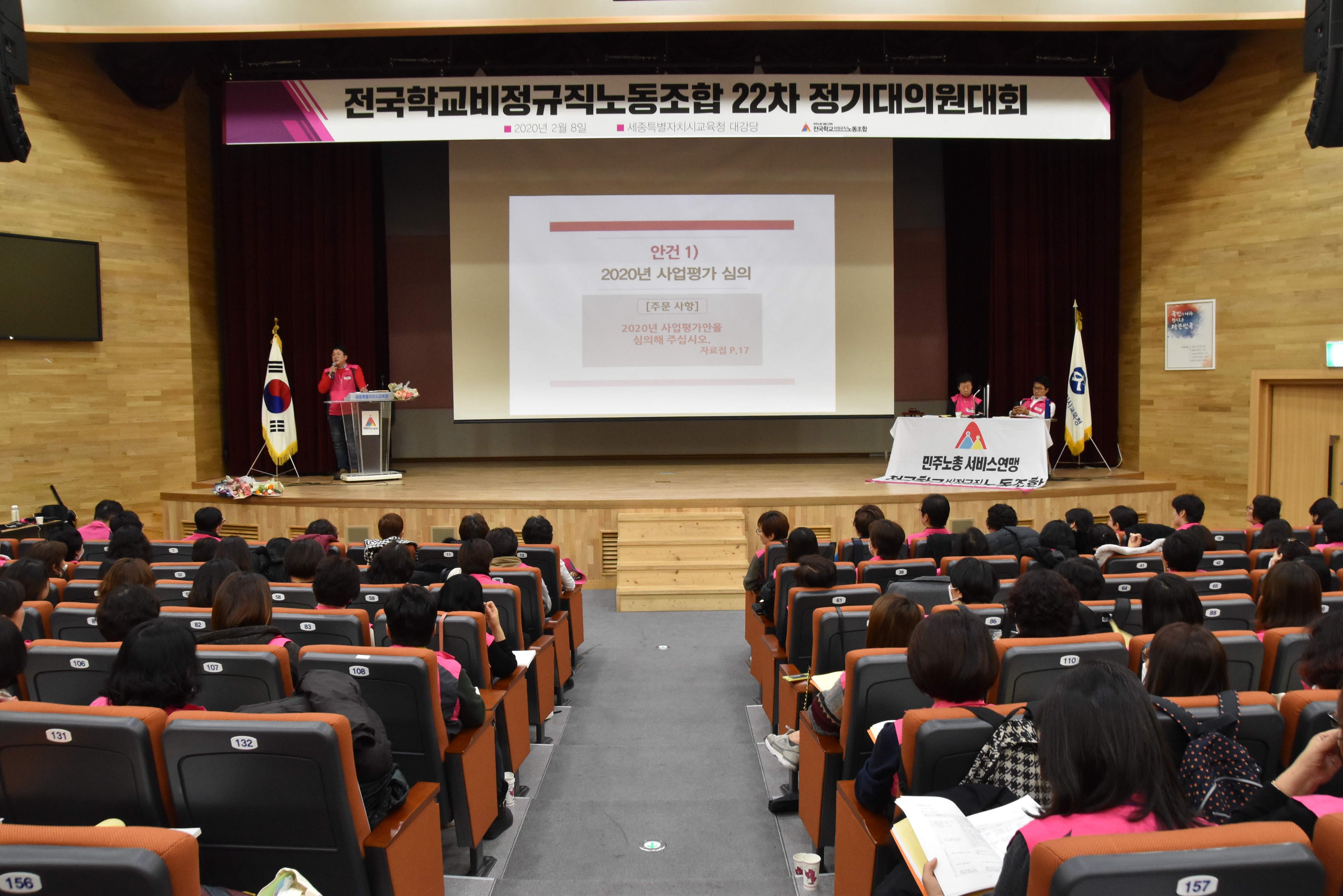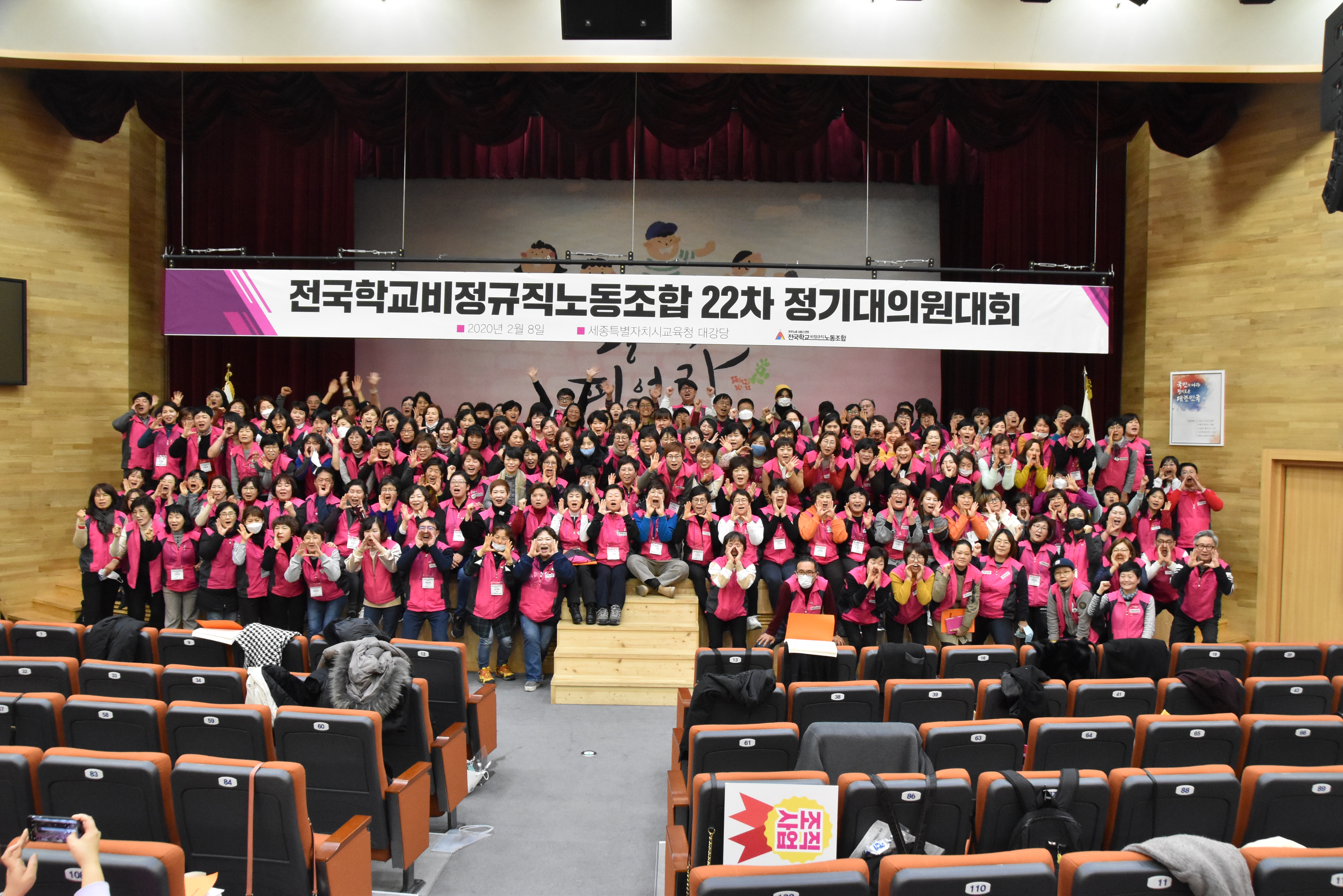 전국학교비정규직노동조합은 지난 2월 8일(토) 세종시교육청 대강당에서 22차 정기대의원대회를 열고 2020년 사업계획 등을 논의하고 힘차게 사업과 투쟁을 결정하였습니다.