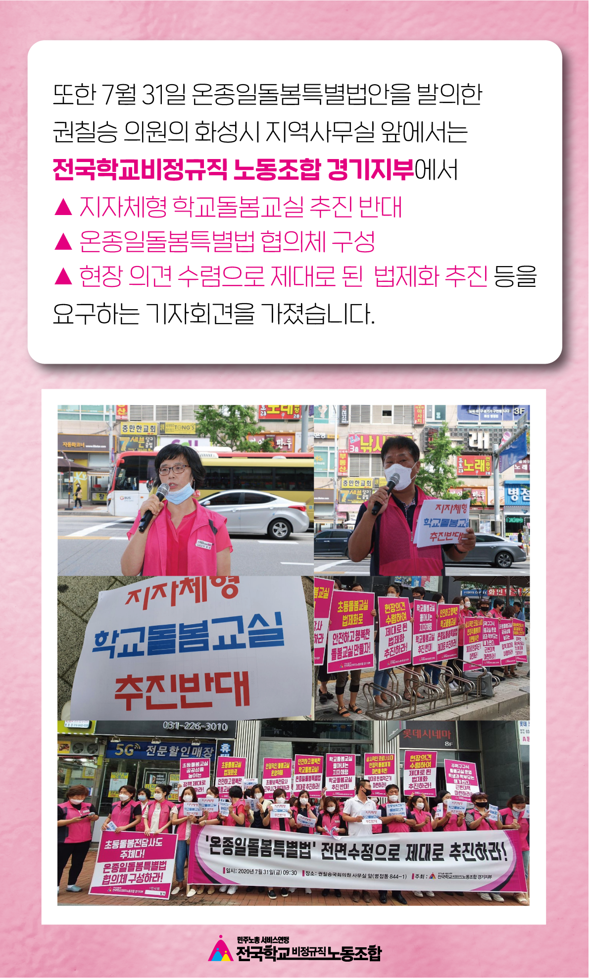 오늘은 경기지부가 권칠승 의원 지역사무실 앞에서 ▶️지자체형 돌봄교실 반대! ▶️온종일돌봄특별법 협의체 구성 ▶️현장의견 수렴으로 제대로 된 법제화 추진 등을 요구하는 기자회견을 가졌습니다.