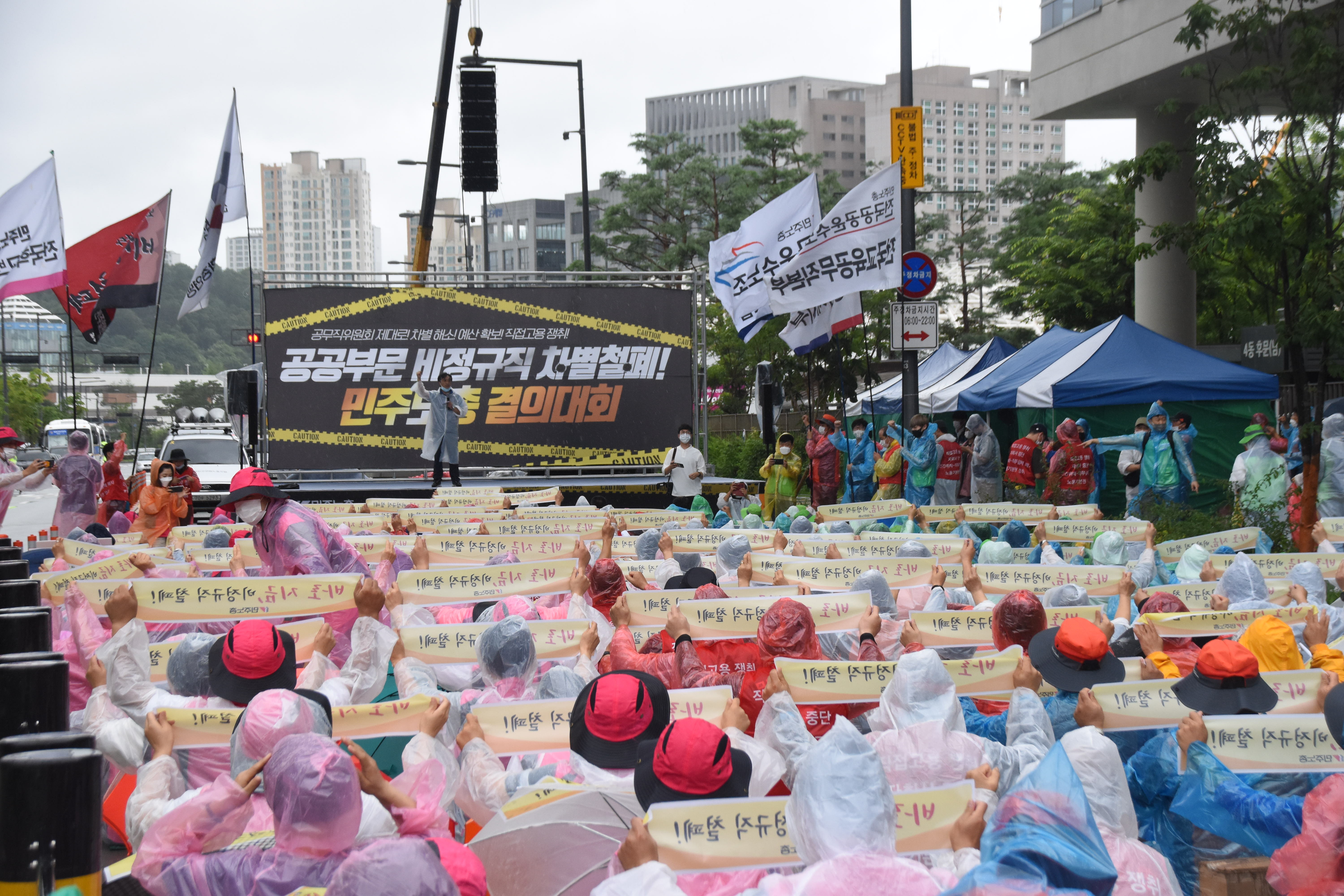지난 23일 정부세종청사 기획재정부 앞에서 공공부문 비정규직 노동자들이 폭우를 뚫고 결의대회를 진행했다.