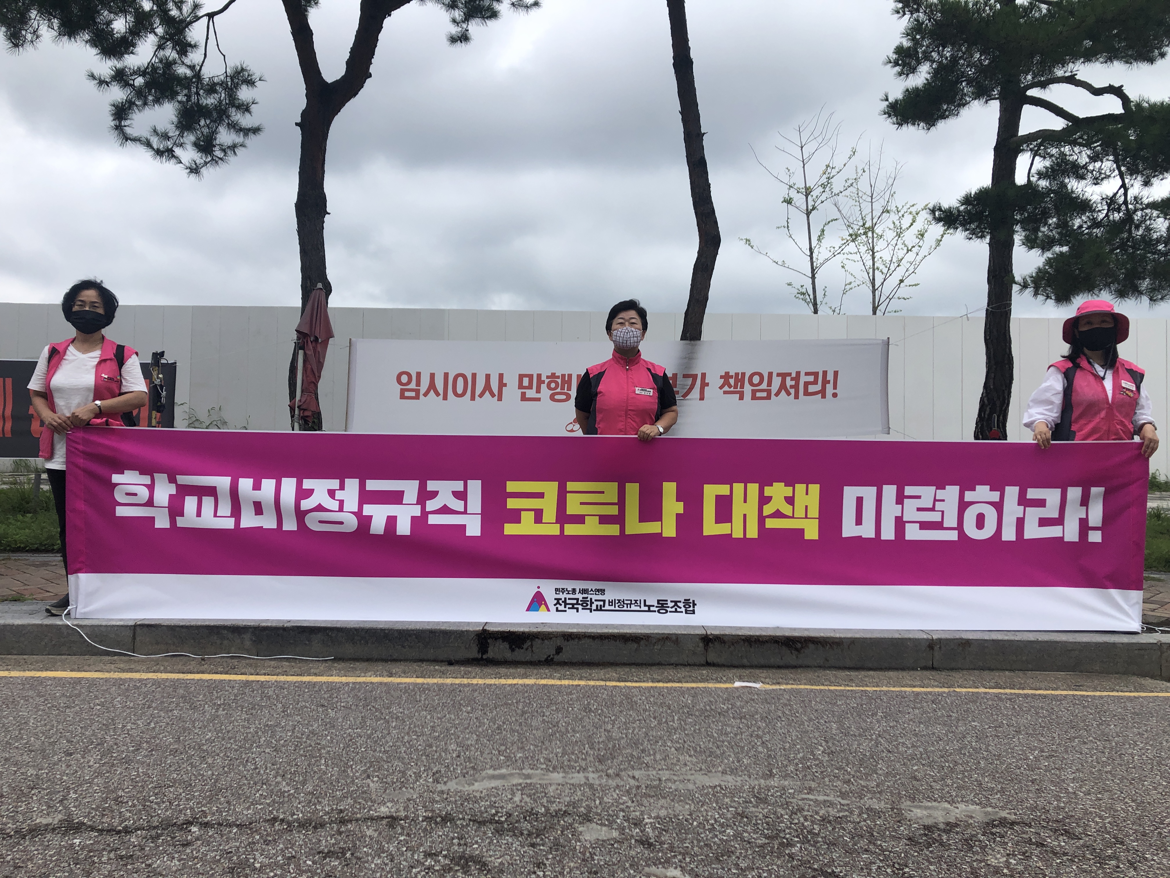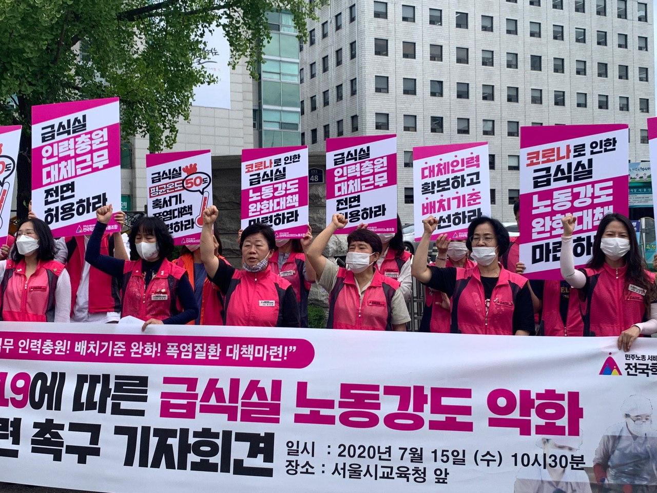지난 15일 학비노조는 오늘 서울교육청 등 전국의 교육청 앞에서 "코로나 급식실 업무 인력충원! 배치기준 완화! 폭염질환 대책마련! 코로나19에 따른 급식실 노동강도 악화 대책 마련 촉구 기자회견"을 개최하였다.