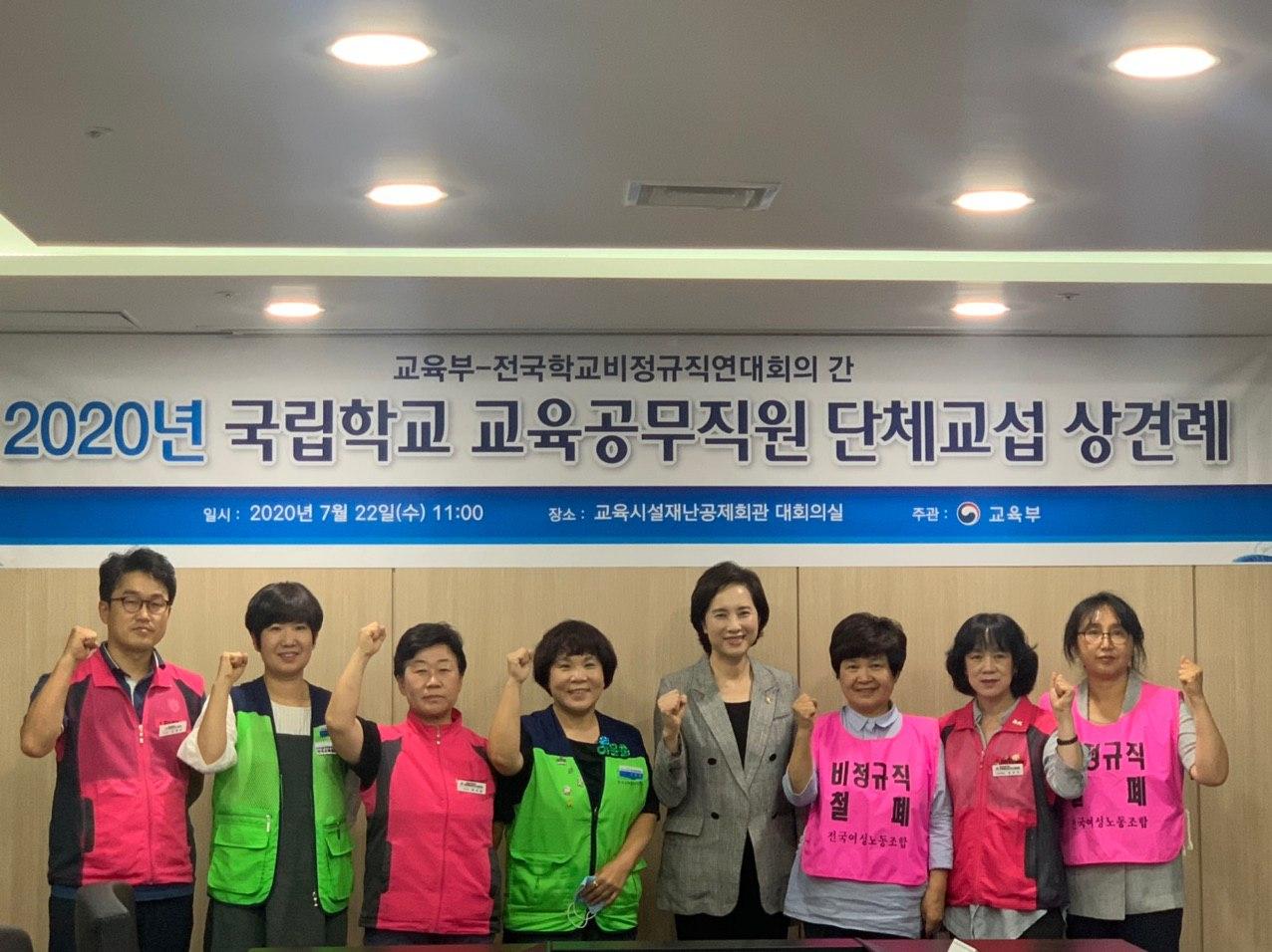 지난 22일 학비노조 등 전국학교비정규직연대회의는 "2020년 국립학교 교육공무직원 단체교섭 상견례"를 열고 유은혜 교육부 장관과 간담회를 가졌다.
