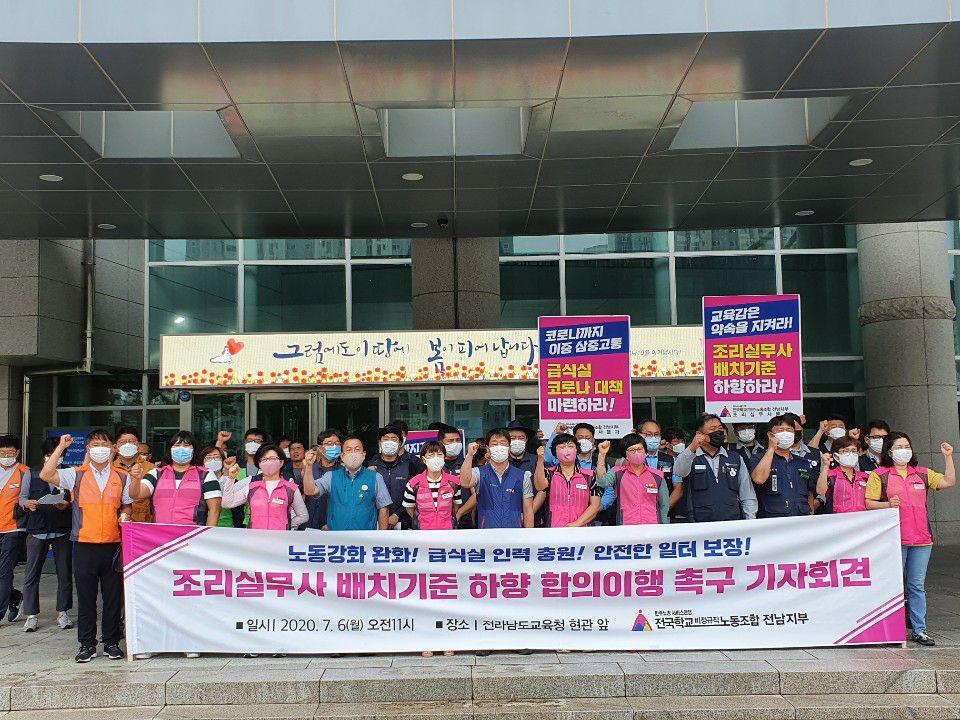 지난 5일 전남지부는 2018년 임금협약에서 합의한 사항을 아직도 지키지 않고 있는 조리실무사 배치기준 하향 합의이행을 촉구하는 기자회견을 열었다.