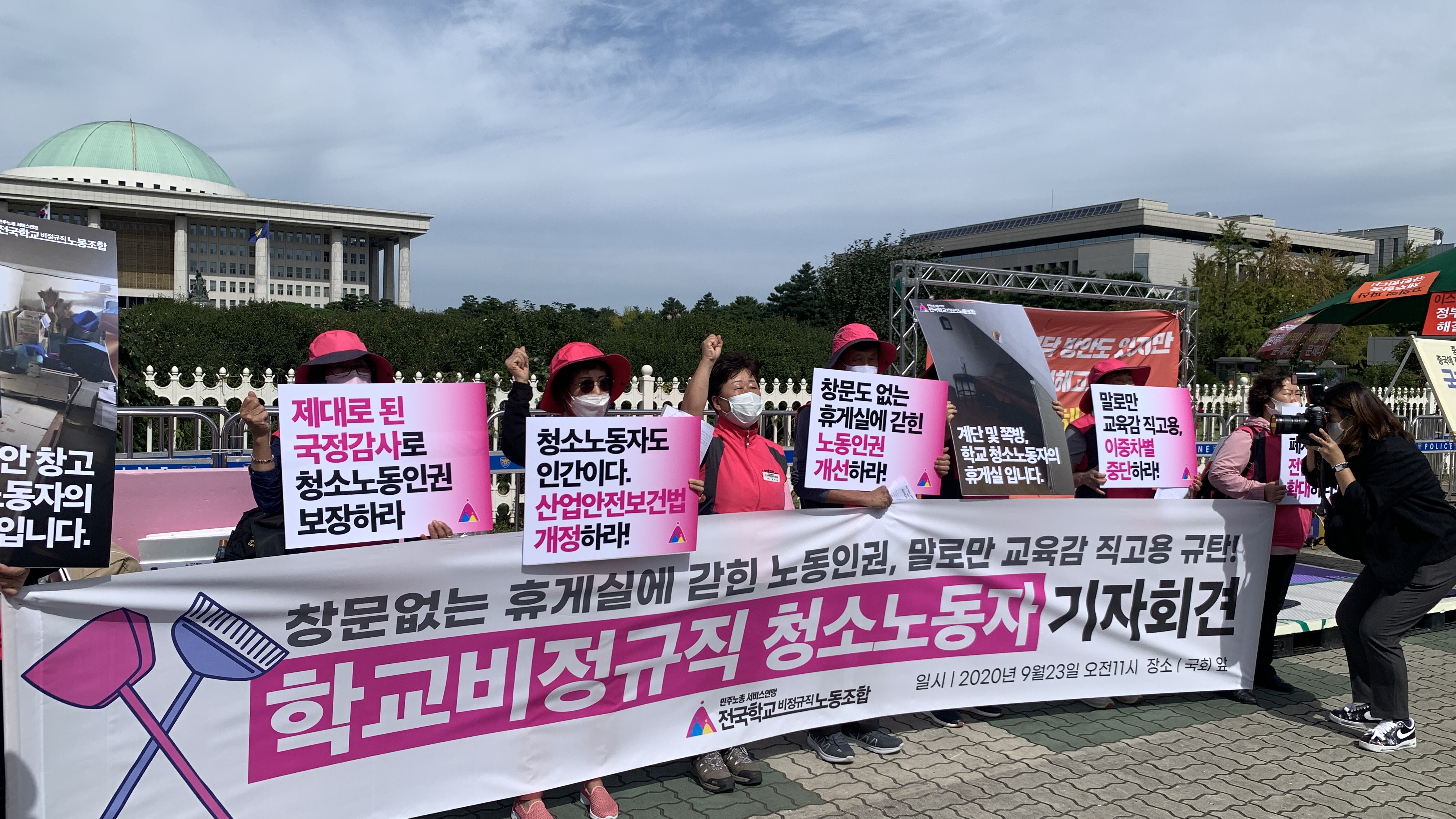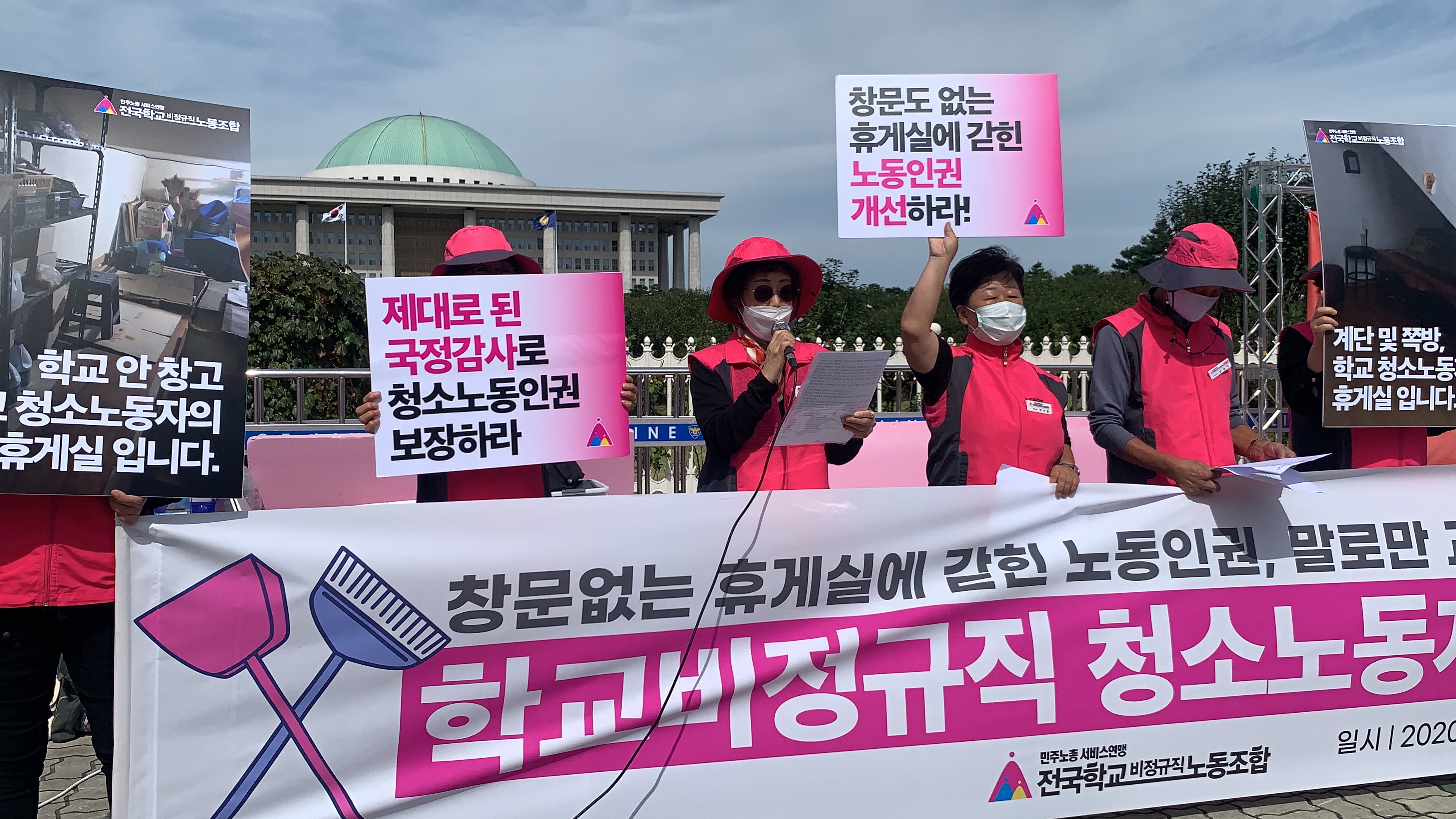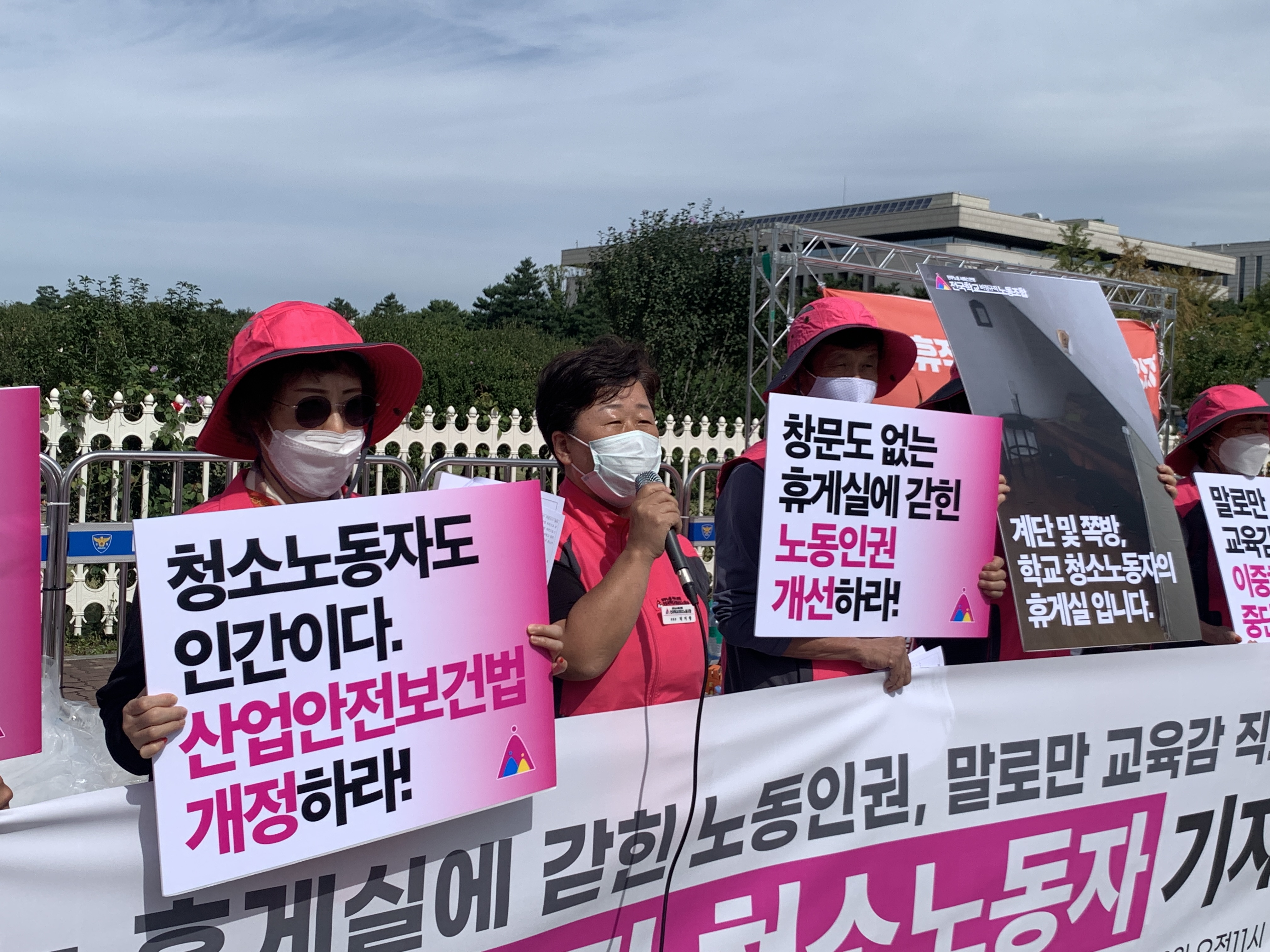 창문없는 휴게실에 갇힌 노동인권 보장! 말로만 교육감 직고용 규탄! 학교비정규직 청소노동자 기자회견