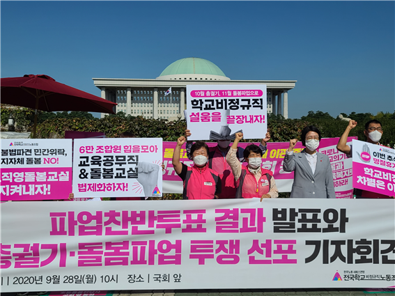 약 2주간 진행 된 돌봄교실 법제화 및 지자체 이관 반대를 위한 국회 앞 농성을 마무리하고 11월에 있을 돌봄파업을 선포하는 기자회견을 가졌습니다. 또한 쟁의행위 찬반투표 결과 투표대비 조합원 찬성률 83.54%로 압도적 찬성으로 10~11월 총력투쟁을 힘차게 결의하며 기자회견을 진행했습니다.