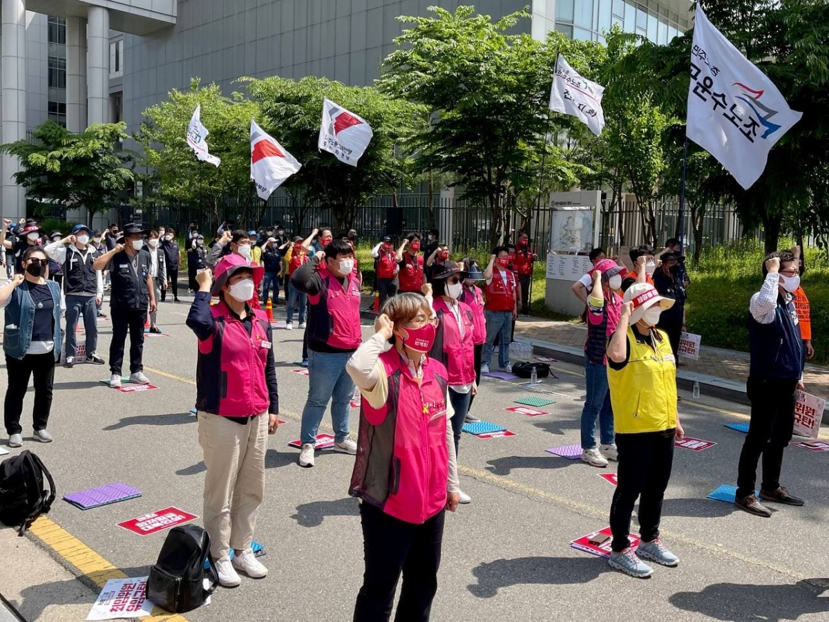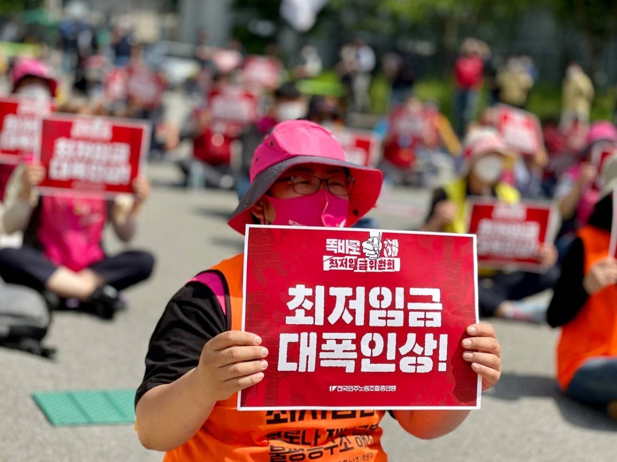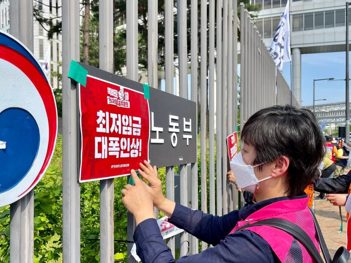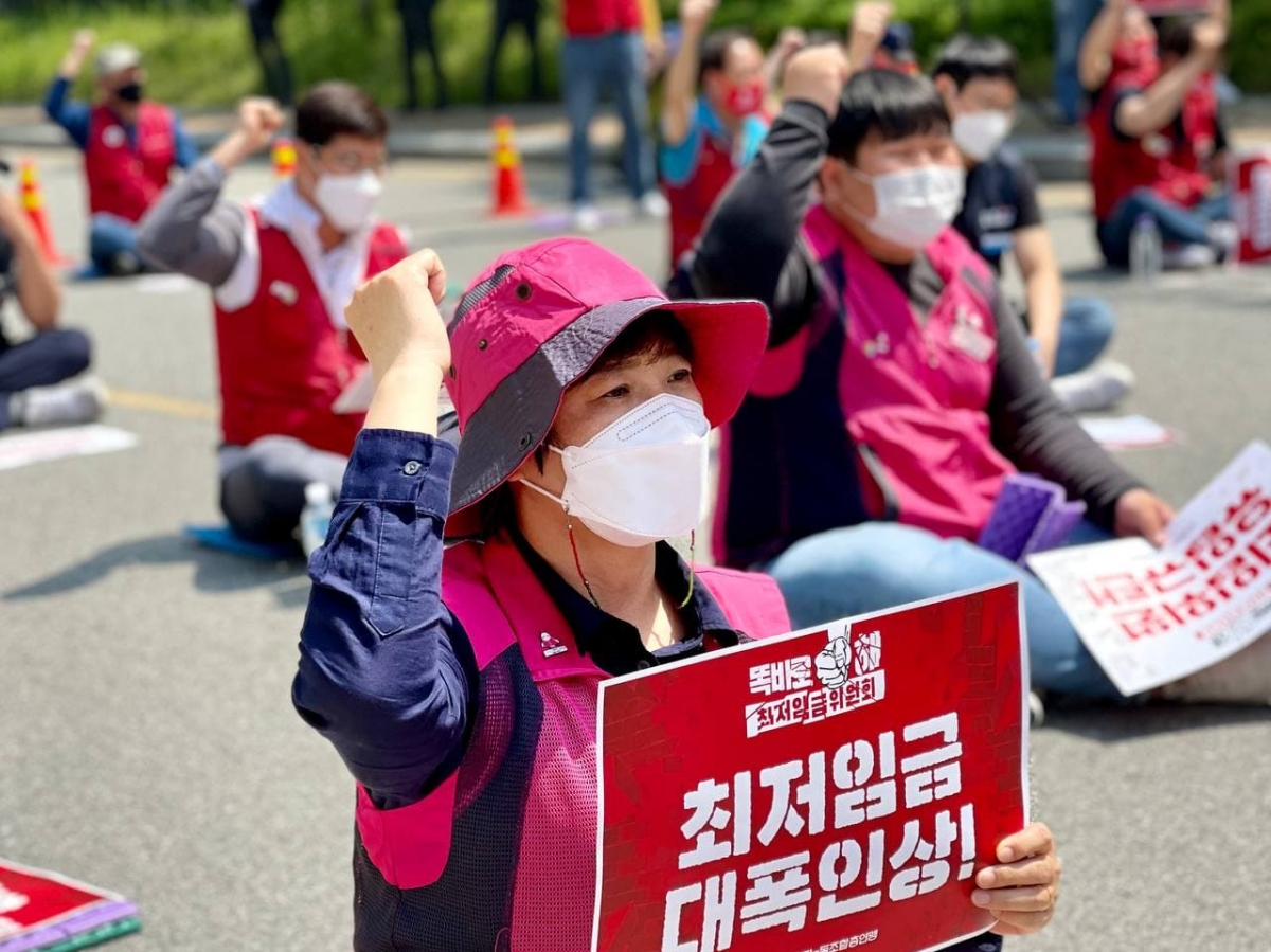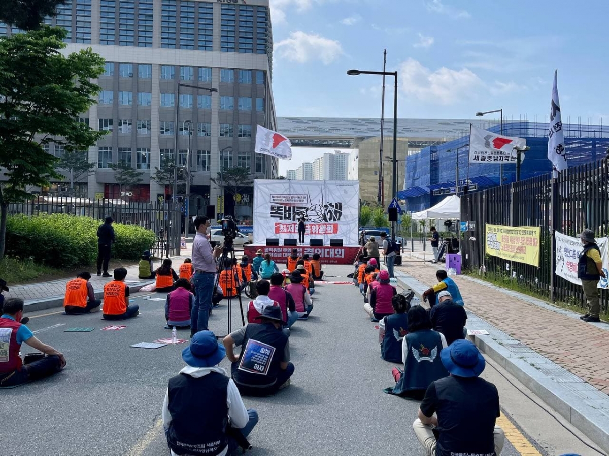 지난 18일, 세종시 최저임금위원회 앞에서 민주노총 결의대회를 진행하고, 최저임금위원회 2차 전원회의 불참을 결정했다.